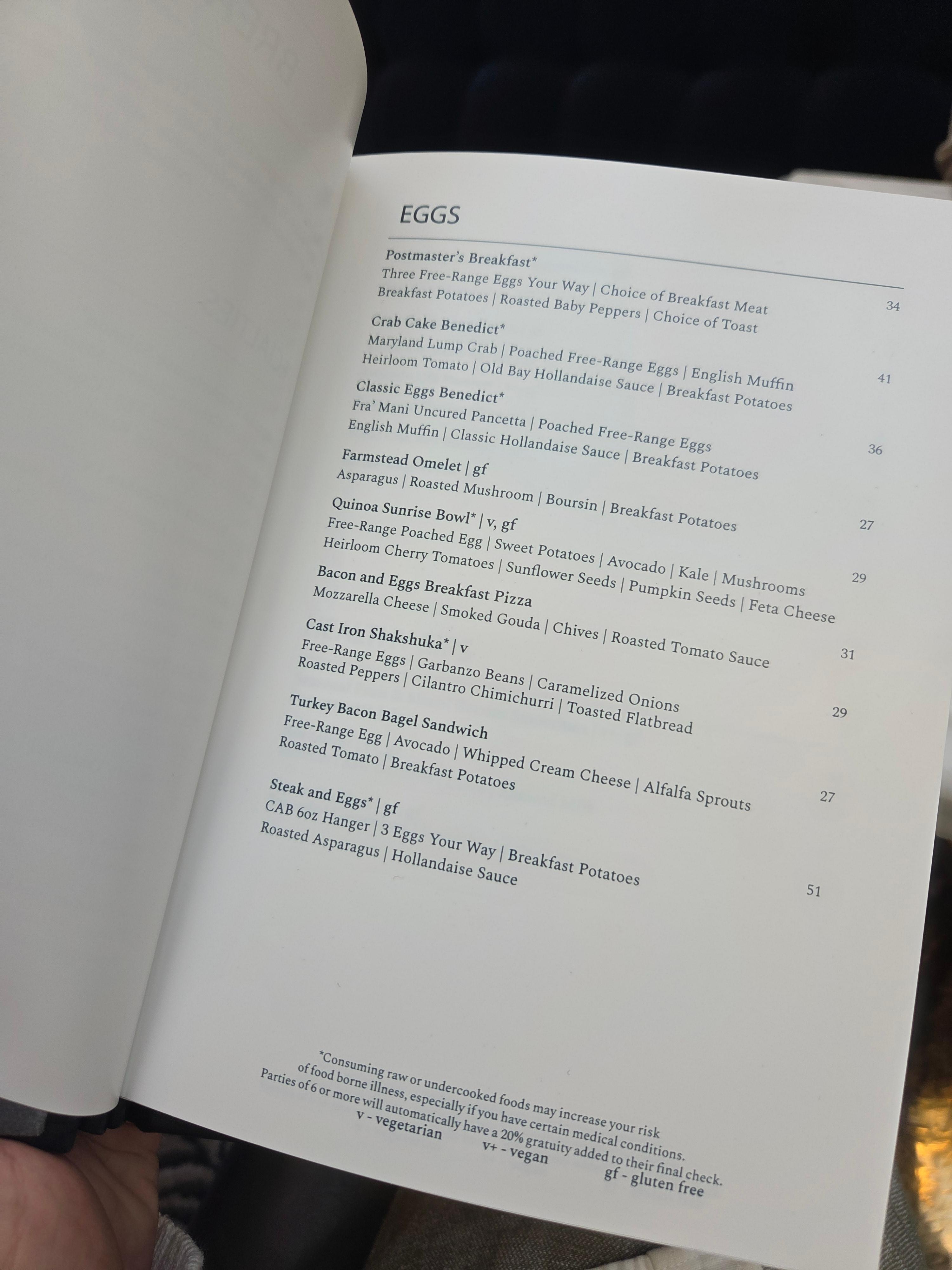 월도프 아스토리아 워싱턴 DC 조식당 피콕 앨리 조식 메뉴 조식 메뉴로는 기본적인 컨티넨탈 브렉퍼스트와 아메리칸 브렉퍼스트와 더불어 오믈렛, 샌드위치, 에그 베네딕트, 토스트, 오트밀, 팬케이크부터 조금은 특색 있는 연어요리, 크랩 케이크 베네딕트, 샥슈카 등의 메뉴도 있었습니다. 저는 이 중에서 Chesapeake Smokehouse Salmon과 Crab Cake Benedict를 선택했습니다.