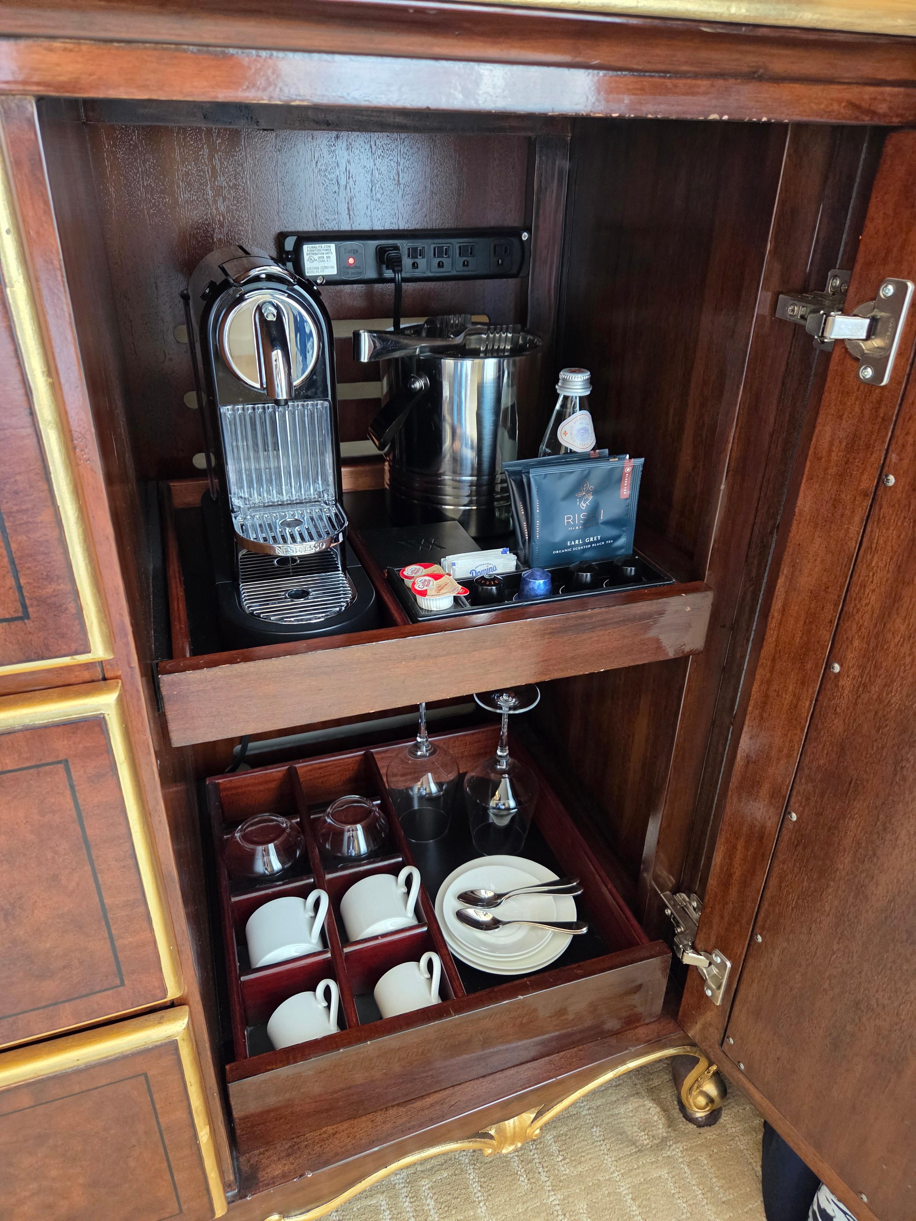 월도프 아스토리아 워싱턴 DC 디럭스 킹 어매니티 TV아래의 수납장에는 커피와 차, 미니바와 냉장고가 위치하고 있었습니다. 커피는 4개의 네스프레소 캡슐이 준비되어 있었고 RISHI 차와 함께 물 1병(다른 물 1병은 침대 옆 사이드 테이블에 있었습니다), 설탕과 스위트너, 크리머들이 다양한 머그잔과 와인잔과 함께 준비되어 있었습니다. 월도프 아스토리아의 W문양이 새겨진 코스터와 아이스 버킷도 함께 준비되어 있었습니다. 냉장고에는 보드카, 진, 럼, 테킬라, 맥주, 소프트드링크와 같은 미니 바 아이템이 있었고, 냉장고 위에도 와인과 스낵류가 준비되어 있었습니다.