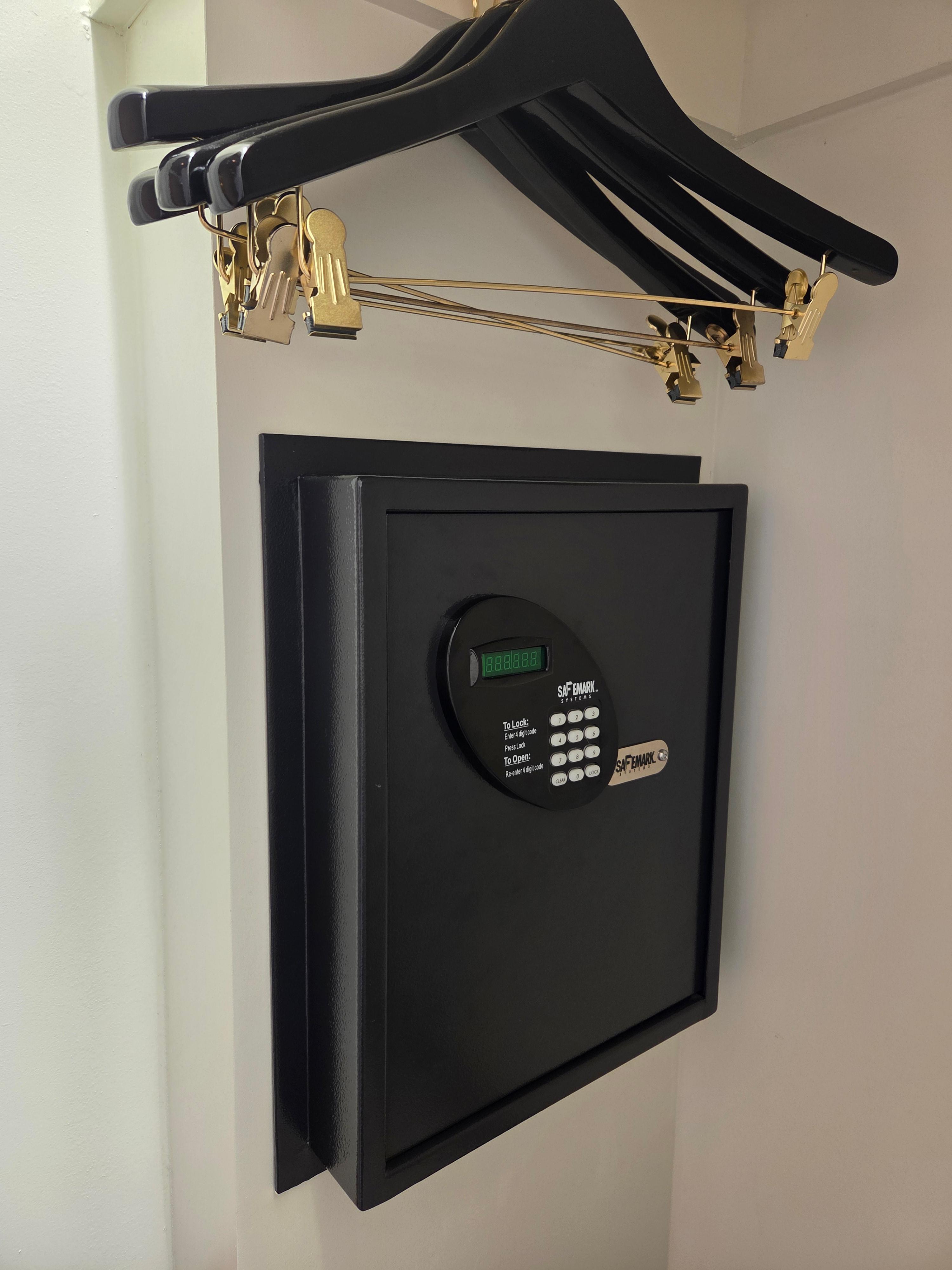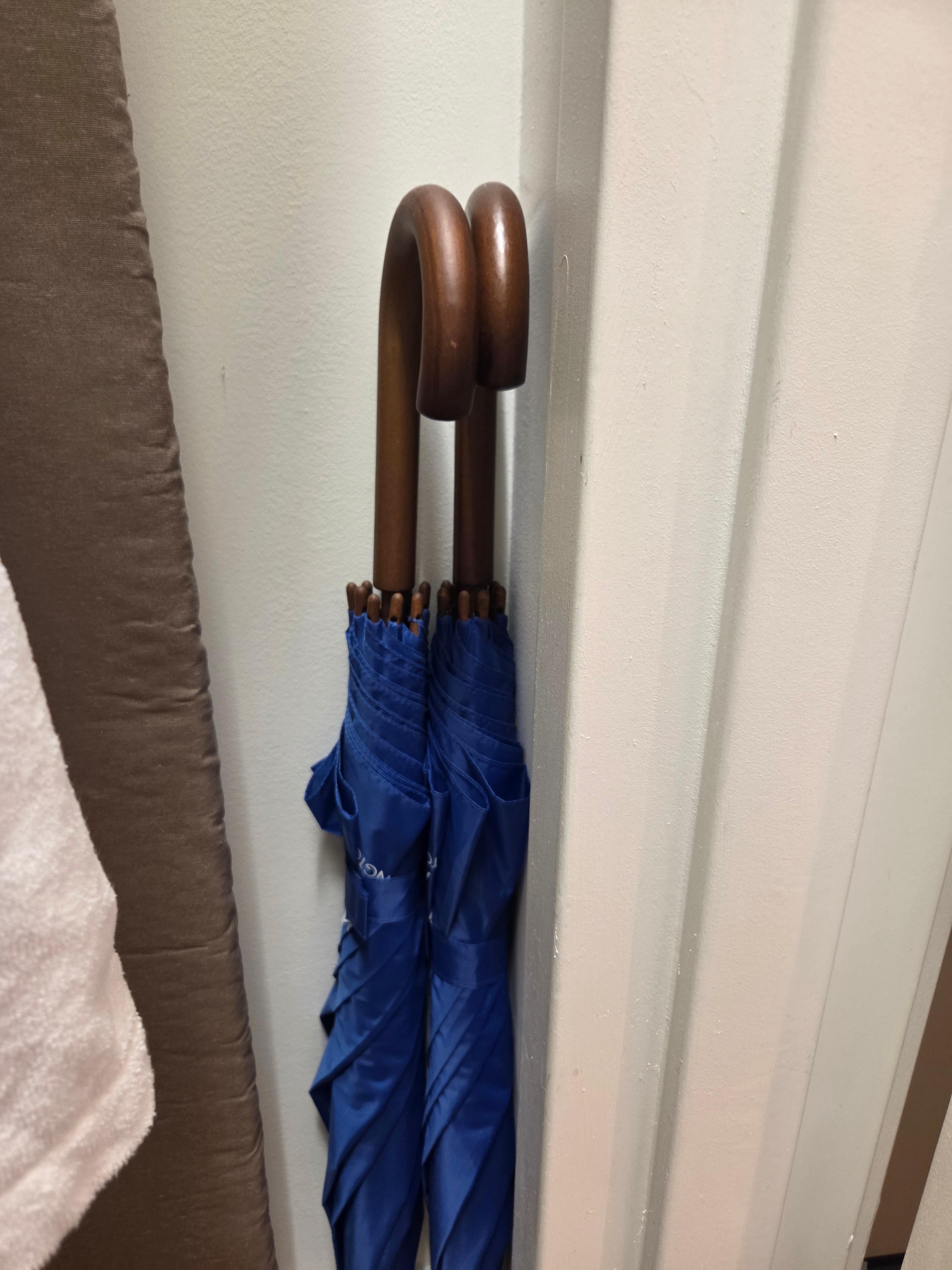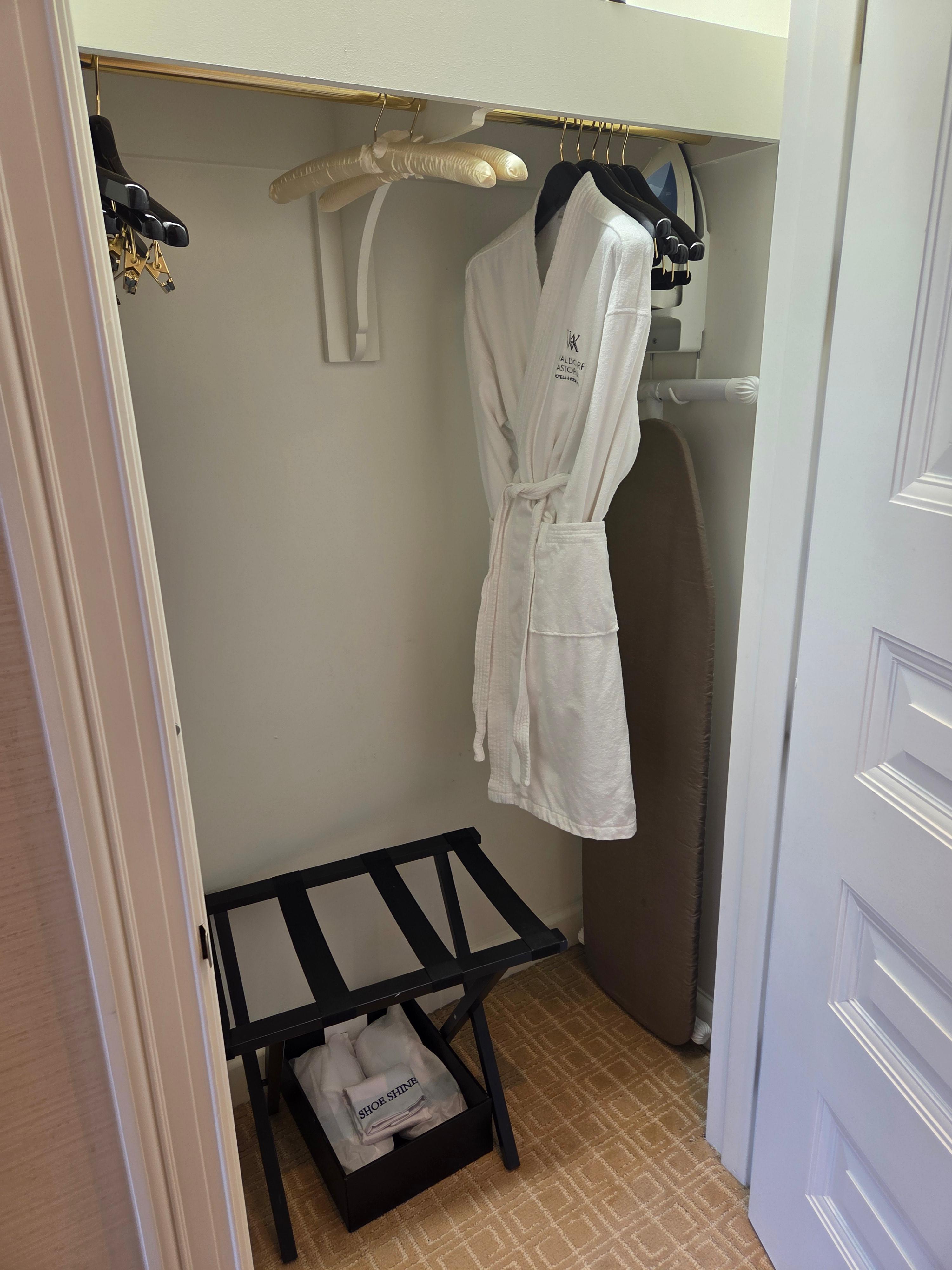 월도프 아스토리아 워싱턴 DC 디럭스 킹 어매니티 방 출입문 근처의 옷장에는 금고와 함께 많은 수의 옷걸이가 준비되어 있었습니다. 그 외에도 구둣주걱과 구둣솔, 슈미트, 스팀다리미, 다림판, 다리미, 캐리어 거치대 등이 있었고 우산도 2개가 준비되어 있었다는 점이 인상적이었습니다.