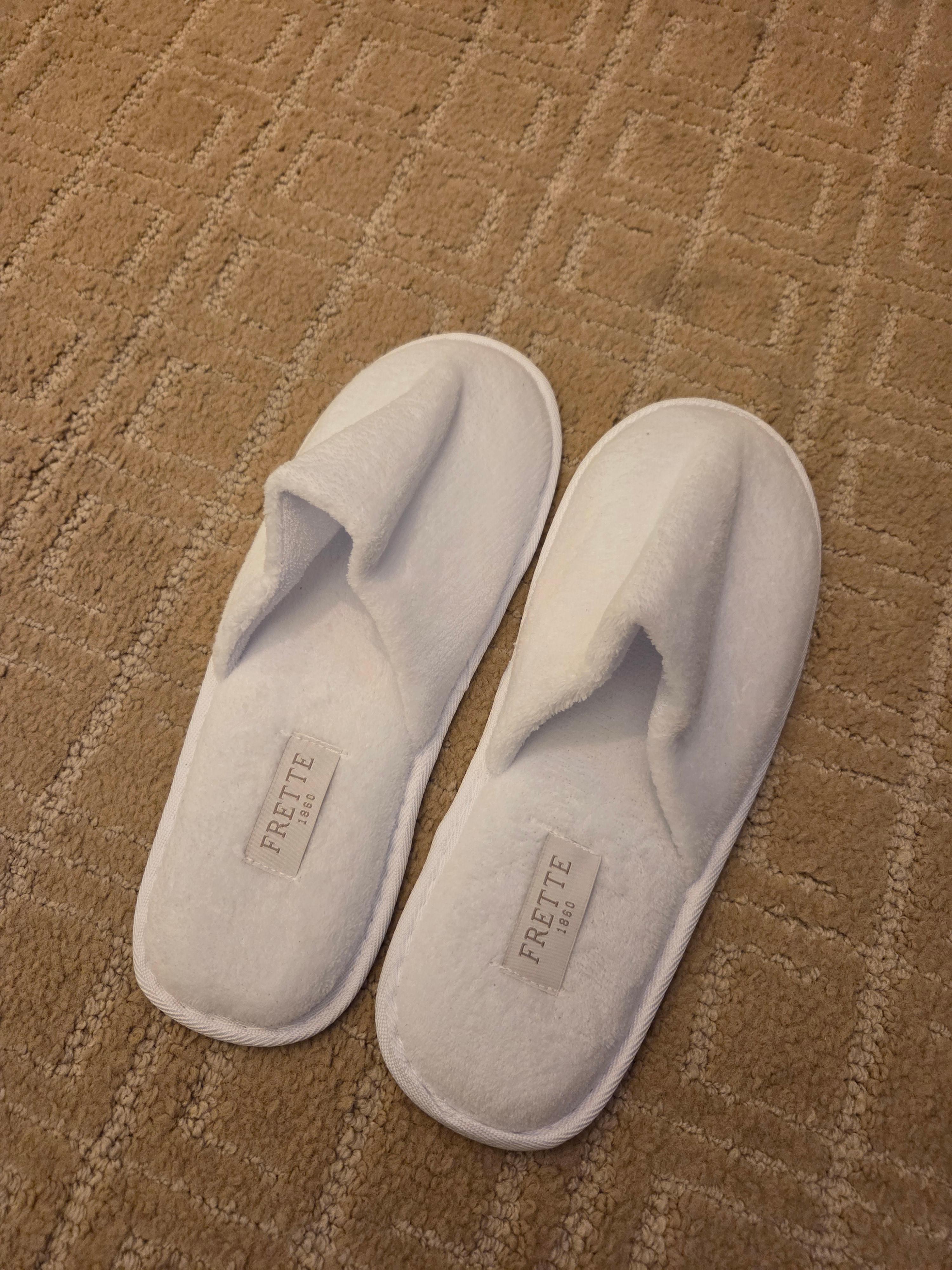 월도프 아스토리아 워싱턴 DC 물과 프레떼 슬리퍼 워싱턴 DC에 있는 고급 호텔이어서 그런지 스태프들이 친절한 편이었습니다. 특히 물 인심이 좋았는데, 저녁에 턴 다운 서비스는 따로 없었지만 방에 들러 초콜릿을 전해주셨는데요, 이때 물이 더 필요하냐고 물어보시기에 더 필요하다고 답했더니 물이 6병 담긴 케이스를 통째로 전해주시더라고요. 그 물에 더해 피트니스 센터에서 가져온 물로 호텔에서 지내는 동안 물 걱정은 할 필요가 없었습니다.