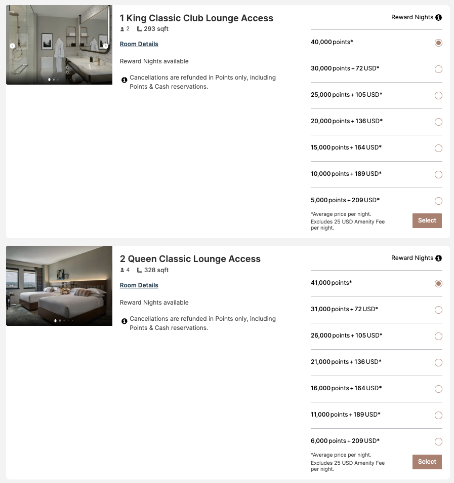 가장 기본인 1 킹 클래식 객실은 비수기 최저가 기준으로 $190 정도이며, 프리미엄 객실은 이보다 $15 비싼 $205, 라운지 입장이 허용되는 객실은 이 가격에서 약 $45~50 정도 더 비싸다고 보시면 됩니다. IHG 원 리워즈 포인트를 사용하는 경우 1 킹 클래식 객실과 1 킹 프리미엄 객실 모두 25,000 포인트부터 시작합니다. 이 호텔은 IHG 원 리워즈 포인트를 이용해 거의 모든 타입의 객실을 예약할 수 있습니다. 게스트 룸 중 가장 비싼 룸인 2 퀸 프리미엄 리버뷰 클럽 라운지 객실 이 비수기 기준으로 약 4만 포인트 중반정도입니다.
