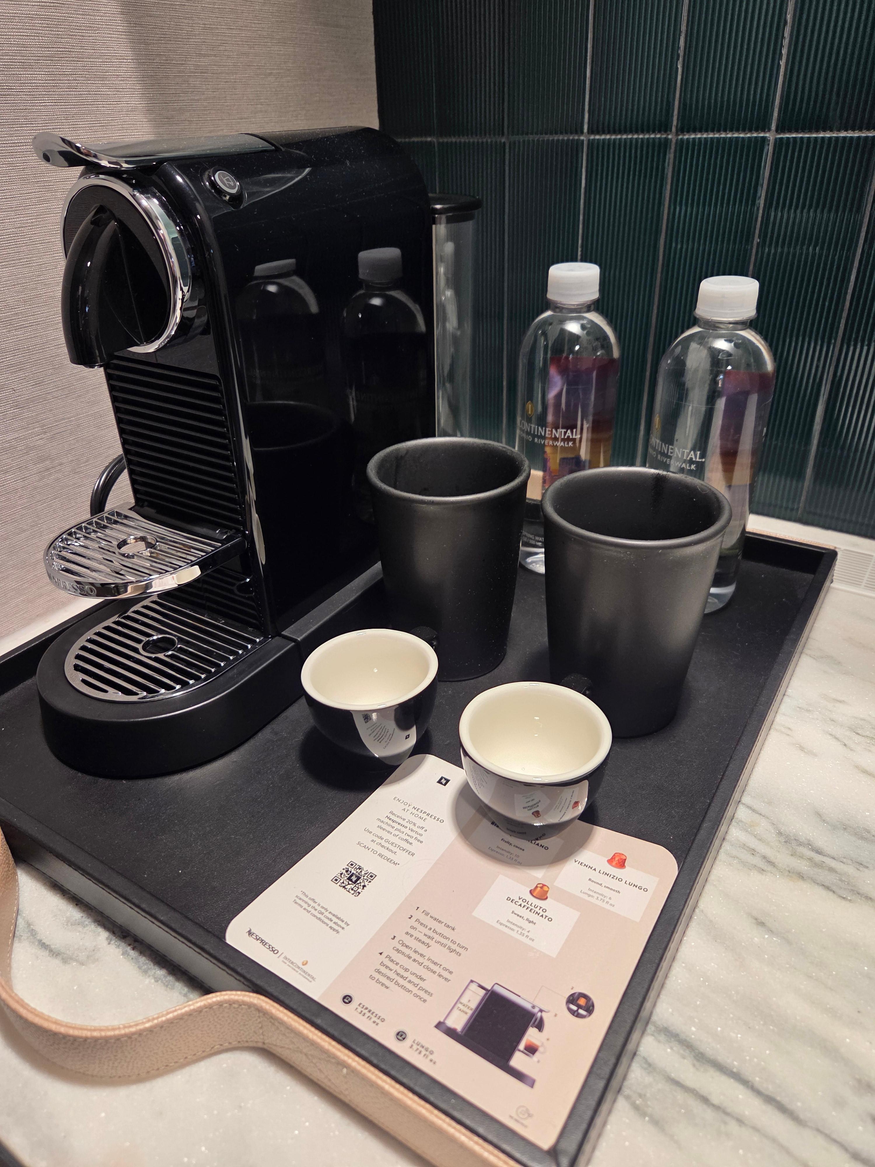 캡슐 커피 머신과 전기 주전자가 동시에 있는 호텔이 많지는 않지만, 그럼에도 인터컨티넨탈 샌 안토니오 리버워크 또한 캡슐 커피 머신만 있어서 비치되어 있는 차를 마시기 위해서는 캡슐 커피 머신에 캡슐을 넣지 않고 두세 번 작동시키는 방식으로만 뜨거운 물을 받을 수 있다는 점이 불편했습니다.