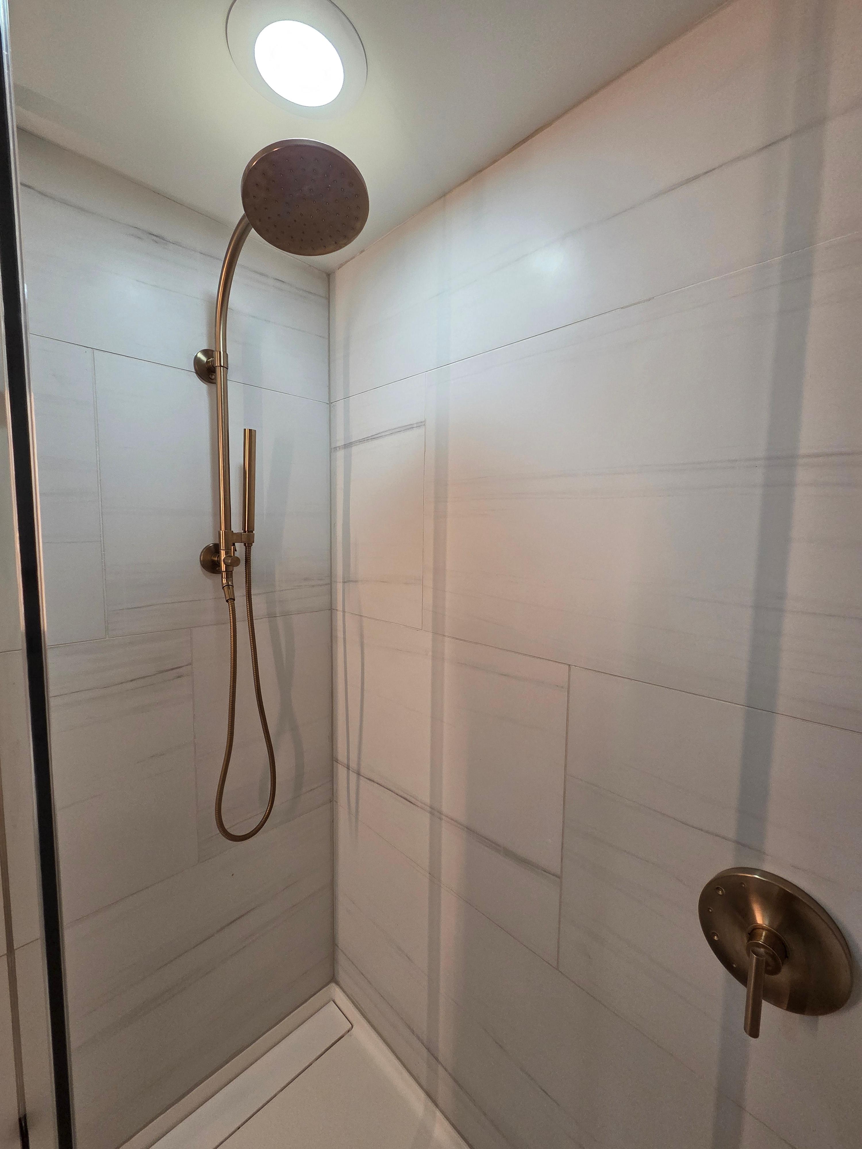 게스트 룸 출입구의 오른쪽에는 반투명 유리가 목재 프레임으로 감싸져 있는 슬라이딩 도어로 구분된 화장실이 위치해 있었습니다. 화장실의 전반적인 인테리어도 원목 가구와, 구리 컬러로 마감된 수전과 프레임, 그리고 밝은 컬러의 대리석과 타일로 마감되어 침실 공간과 결이 비슷했습니다. 세면대는 1개만 있어서 아쉬웠지만 세면대 위의 공간이 충분해서 화장품을 다 꺼내놓고 이용하기에 충분했습니다. 샤워 부스의 경우도 샤워기와 더불어 해바라기형 샤워기도 있었고 수압도 나쁘지 않았습니다. 또한 샤워실 밖으로 물이 삐져나오거나 흐르지 않게 잘 설계되어 있어 편리했습니다. 아주 기본적인 부분이지만 고급 호텔들 중에서도 이러한 부분이 부족한 호텔들도 생각보다 많거든요.