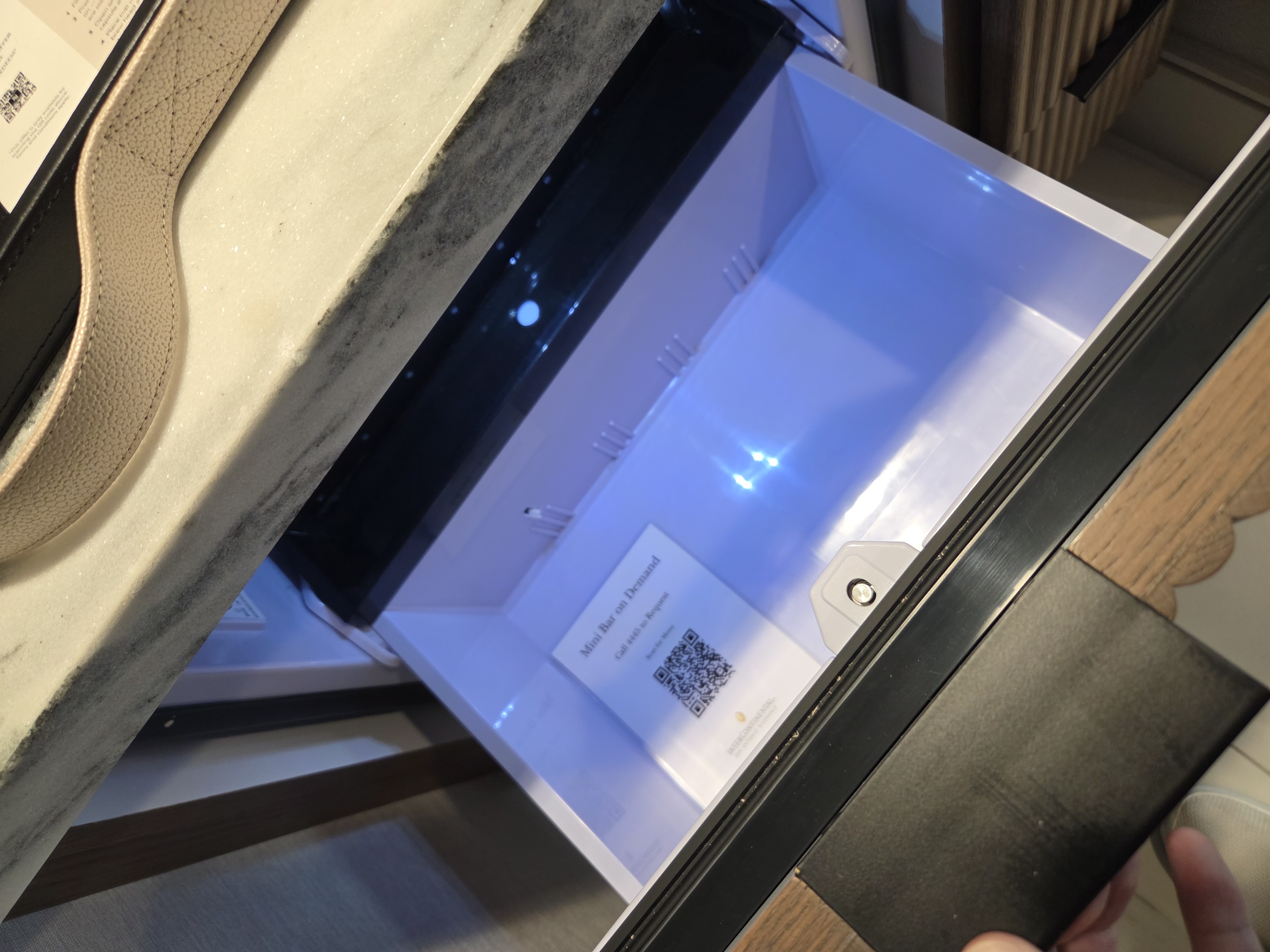 미니바의 어매니티로는 물컵 2개, 와인잔 2개, 머그컵 2개, 에스프레소 잔 2개가 있었고, 커피 머신은 네스프레소 머신으로 디카페인 캡슐 2개 포함 총 6개의 네스프레소 캡슐이 있었습니다. 허니 스틱을 포함해 액상 크리머, 설탕, 스위트너 등도 충분히 있었습니다. 차의 경우 캐모마일 티, 잉글리시 브랙퍼스트 티를 포함해 총 4종류의 티백이 각각 2개씩 6개가 위치하고 있었습니다. 아이스 버킷과 비닐봉지도 있었는데 아이스 버킷의 청소 상태가 괜찮았고요. 단, 냉장고의 경우 비어있었고 미니바 이용을 원하면 룸 서비스로 주문하라고 되어 있었는데요, 장점이라면 (아주 시원하지는 않아도) 냉장고에 공간이 충분하다는 점을 꼽을 수 있고, 단점이라면 미니바를 이용하고 싶으면 룸 서비스를 통해 주문해야 하기 때문에 딜리버리 차지 등 추가 요금이 부과될 수 있다는 점입니다.