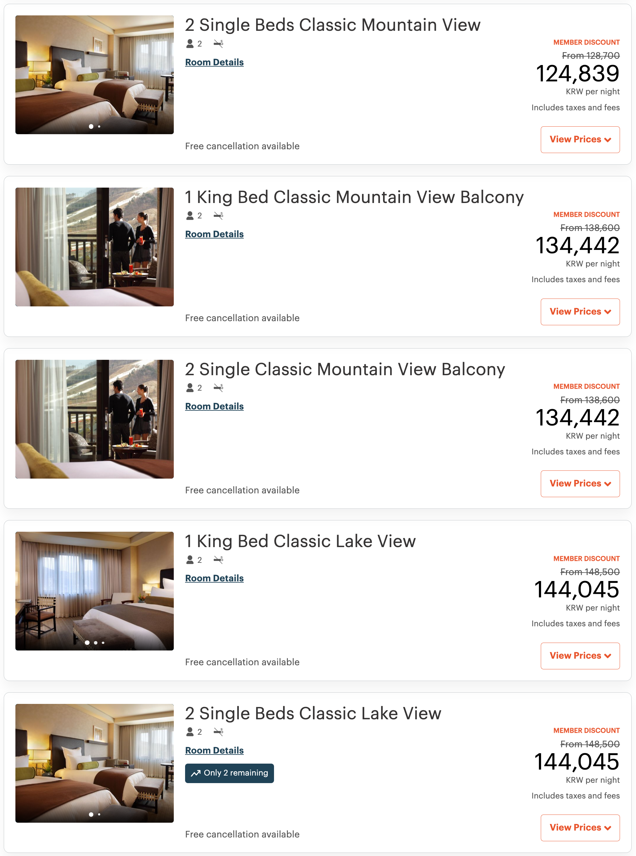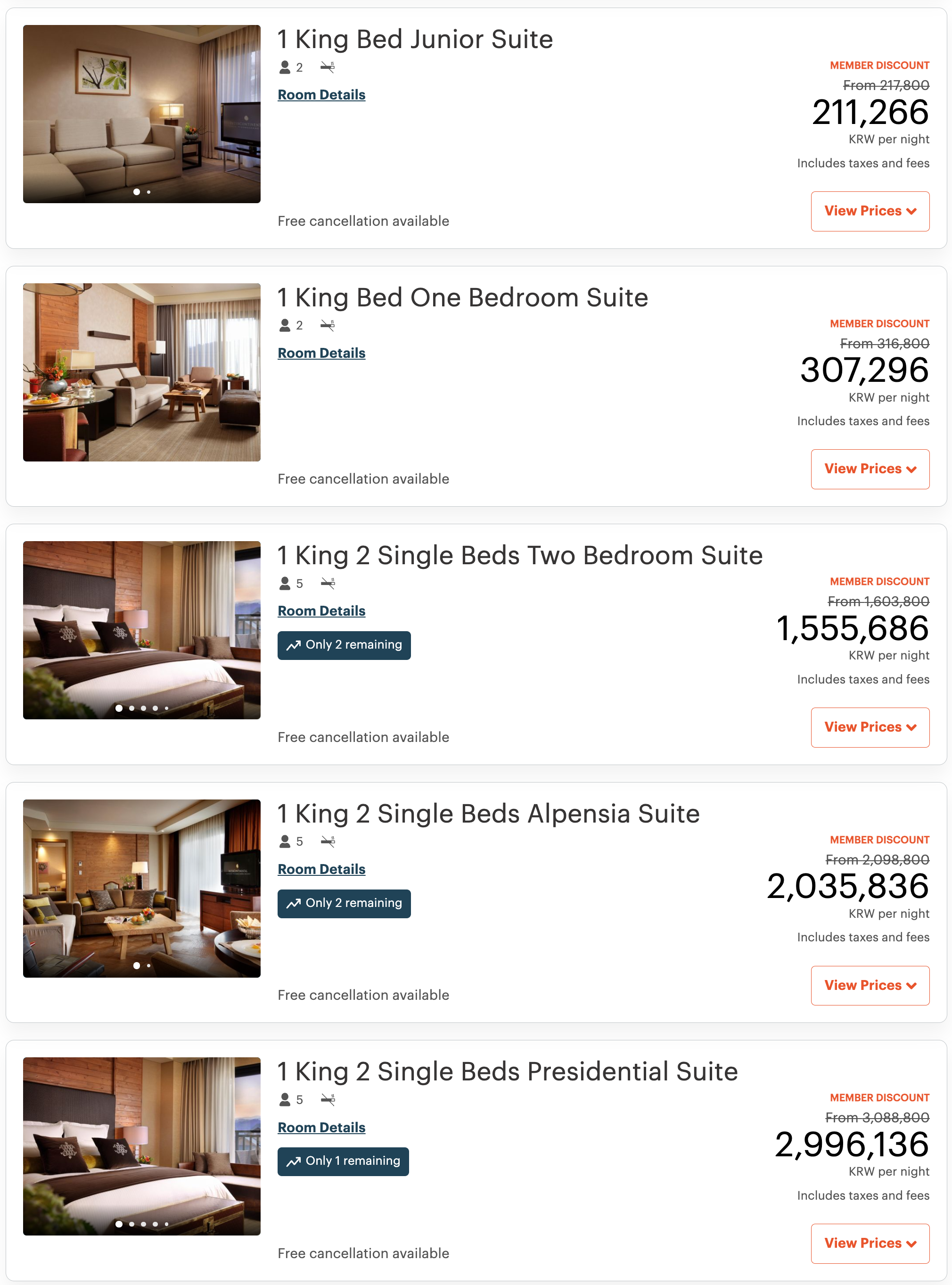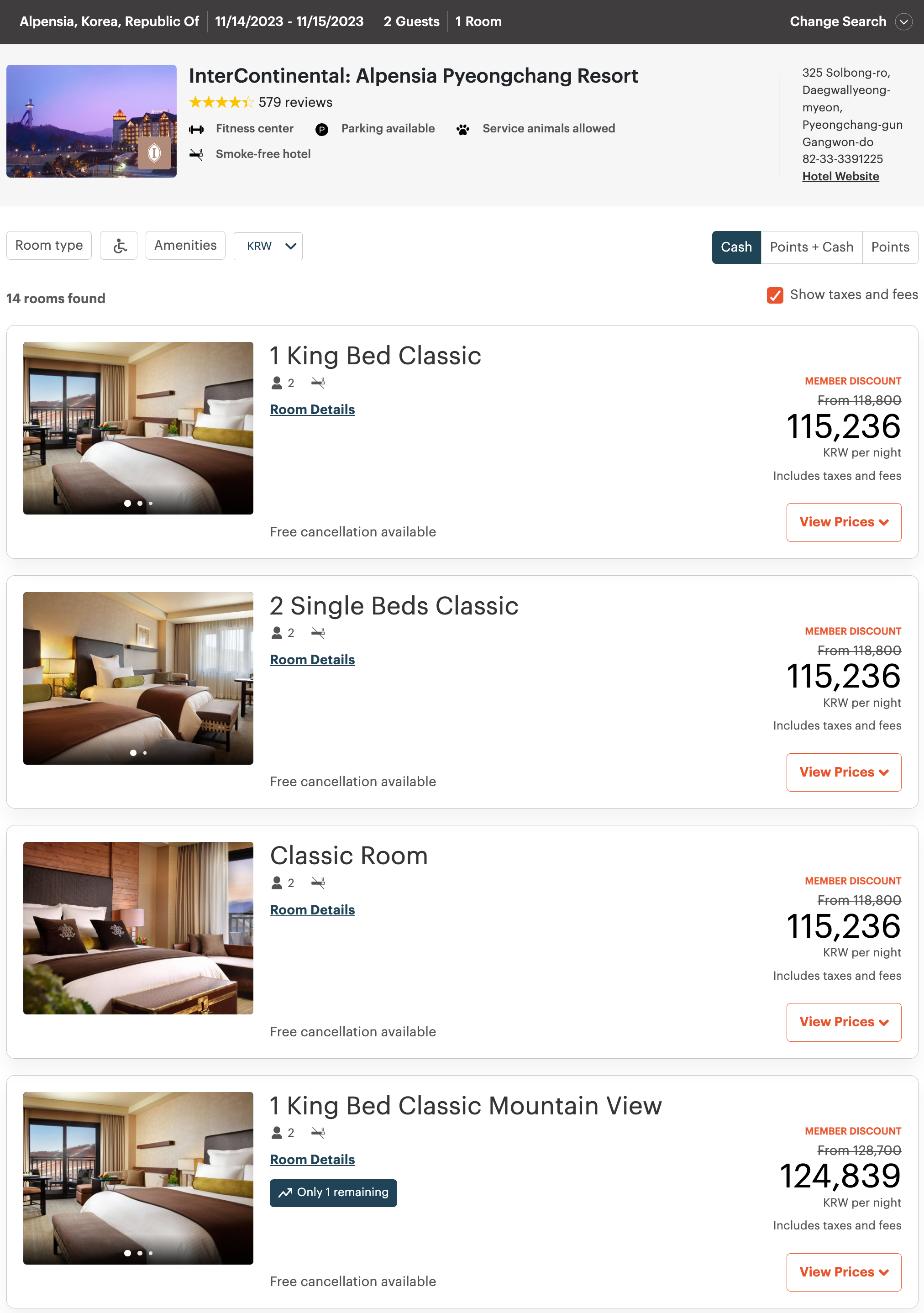인터컨티넨탈 알펜시아 평창 리조트 룸 레이트 (c) ihg.com 평창 지역이 겨울에 스키여행으로 주로 찾는 곳이기에 상대적 비수기인 여름에는 방 가격이 인터컨티넨탈 급의 호텔 치고는 매우 저렴합니다. 특히 비수기 주중 기본방 기준으로는 10만원대 초반까지 떨어지고 주말에도 10만원 중후반에 시작되기 때문에 비수기인 여름에는 가성비가 좋은 호텔입니다. IHG 포인트를 이용한 숙박도 가성비가 좋은 편으로 비수기에는 1만 포인트 후반대에서부터 예약이 가능해 3+1 박이 가능한 체이스 IHG 리워드 프리미어 카드 (Chase IHG Rewards Premier Credit Card)를 소지하신 분께는 가성비가 더 좋은 호텔입니다. 겨울에는 아무래도 성수기인 만큼 가격이 30만원 근처에서 시작합니다. 하지만 인터컨티넨탈의 브랜드 네임과 호텔 상태를 봤을 때, 아주 비싼 가격은 아닌 것으로 생각합니다. ▲ 목차로 돌아가기