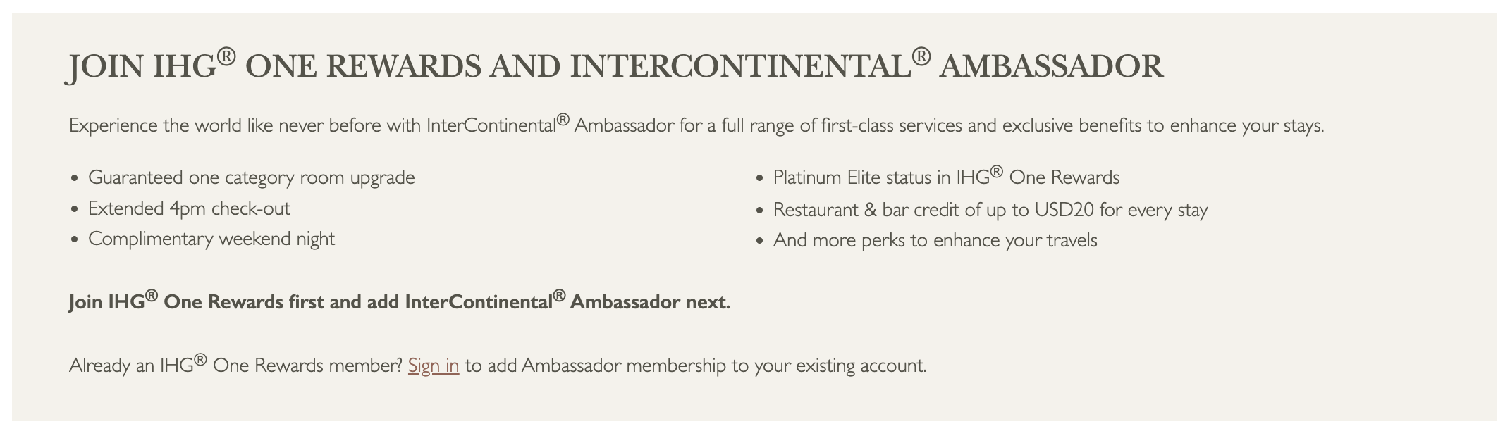 IHG One Rewards Membership Summary (c) ihg.com IHG One Rewards 다이아몬드 회원의 주요 혜택으로는 엘리트 회원 전용 체크인 카운터 이용, 얼리 체크인과 오후 2시 레이트 체크아웃, 웰컴 어매니티로 조식 선택 가능이 있습니다. 이중 웰컴 어매니티로 조식 선택은 차상위 회원등급인 플래티넘 회원도 받지 못하는 오직 다이아몬드 회원만의 혜택입니다. 인터컨티넨탈 엠버서더 회원의 주요 혜택으로는 객실 1등급 업그레이드 보장, 오후 4시 레이트 체크아웃, 숙박당 20 미국달러 또는 20000원 (호텔 위치에 따라) 호텔 크레딧 등이 있습니다. 원래 인터컨티넨탈 엠버서더 회원의 혜택은 포인트로 숙박을 하는 Reward Nights 에는 보장이 되지 않고, 돈을 내고 숙박하는 일반 숙박에만 적용이 되지만, 호텔에 따라 Reward Nights에도 보장해주는 호텔도 있습니다.