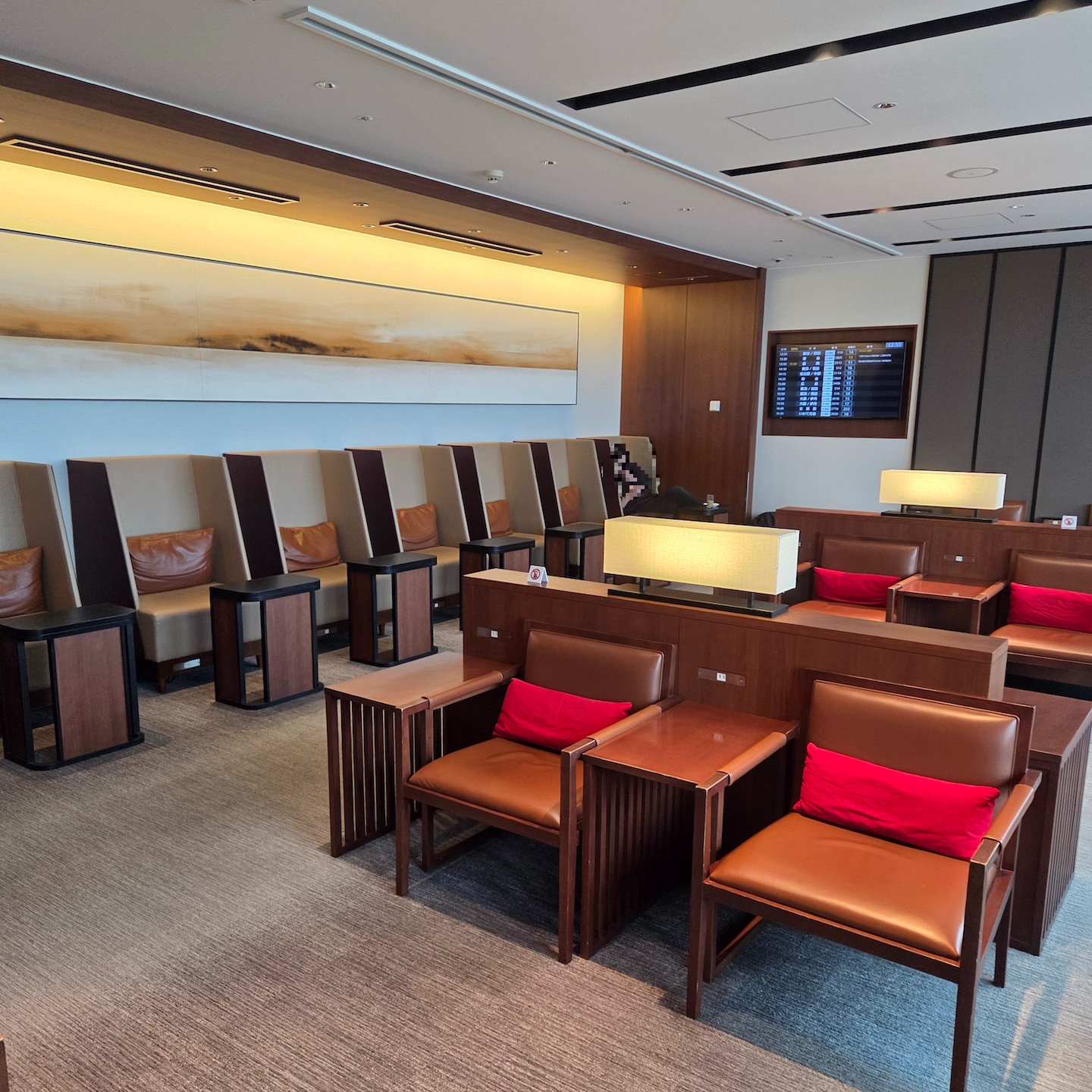 라운지는 유명 인테리어 디자이너인 코사카 류(Ryu Kosaka)가 설계했으며 일본항공의 시그니처 컬러인 레드 컬러와 일본 전통 소재의 질감을 잘 살린 인테리어로 꾸며져 있습니다. 또한 라운지 입구 에스컬레이터 근처에 일본의 유명 서예가 시슈(Sisyu)의 서예 작품이 전시되어 있으니 라운지 이용 전에 꼭 한번 신경써서 감상하는 걸 추천드립니다.
