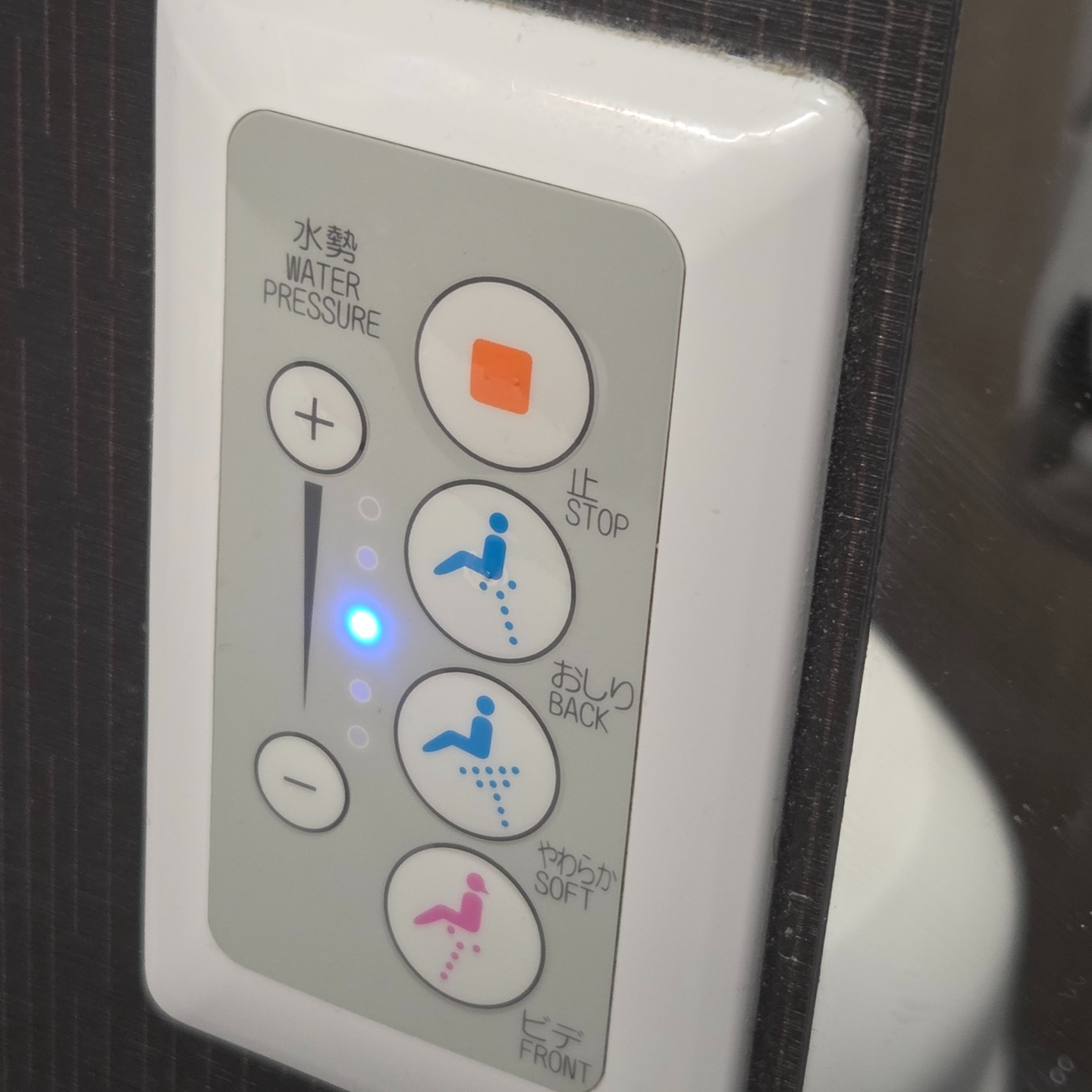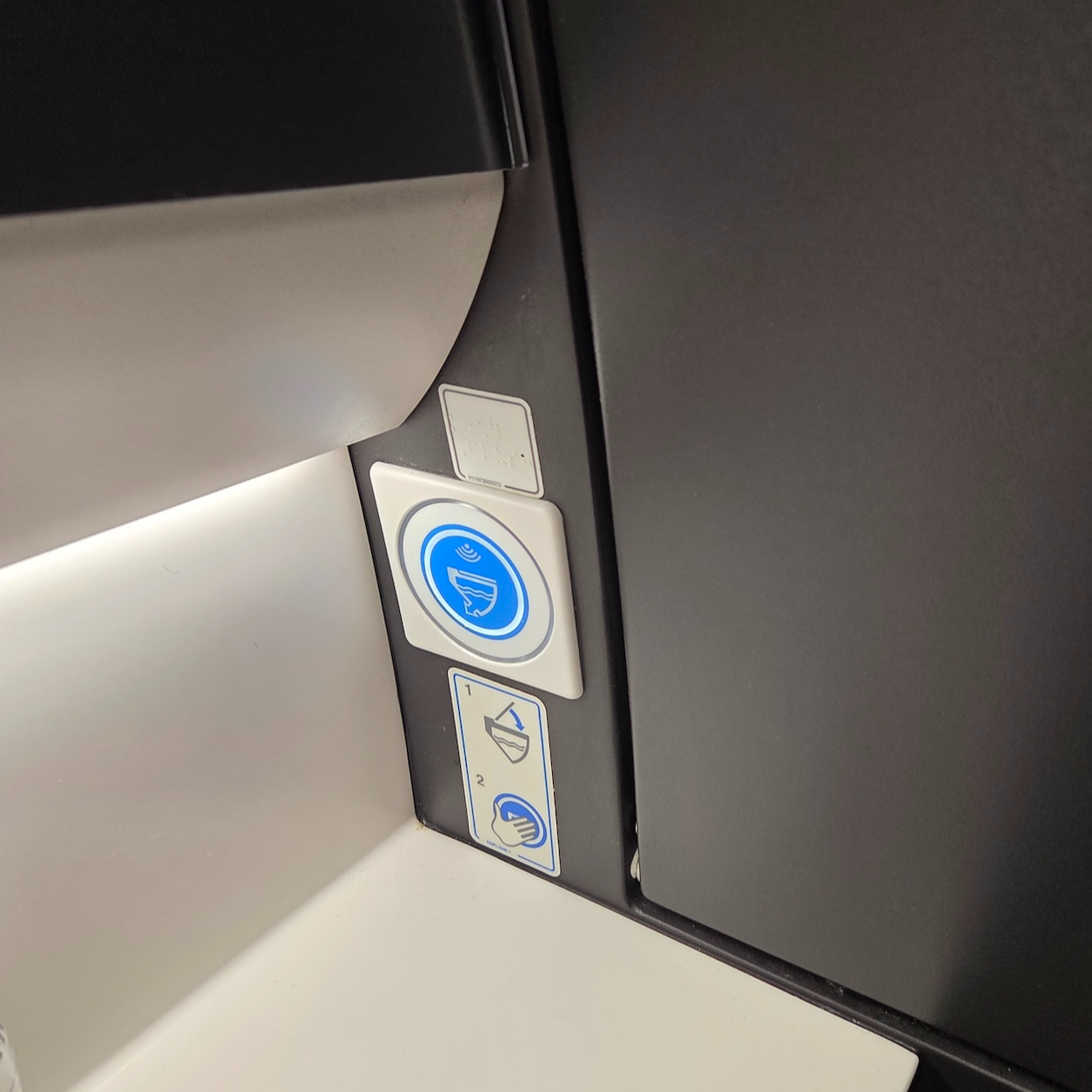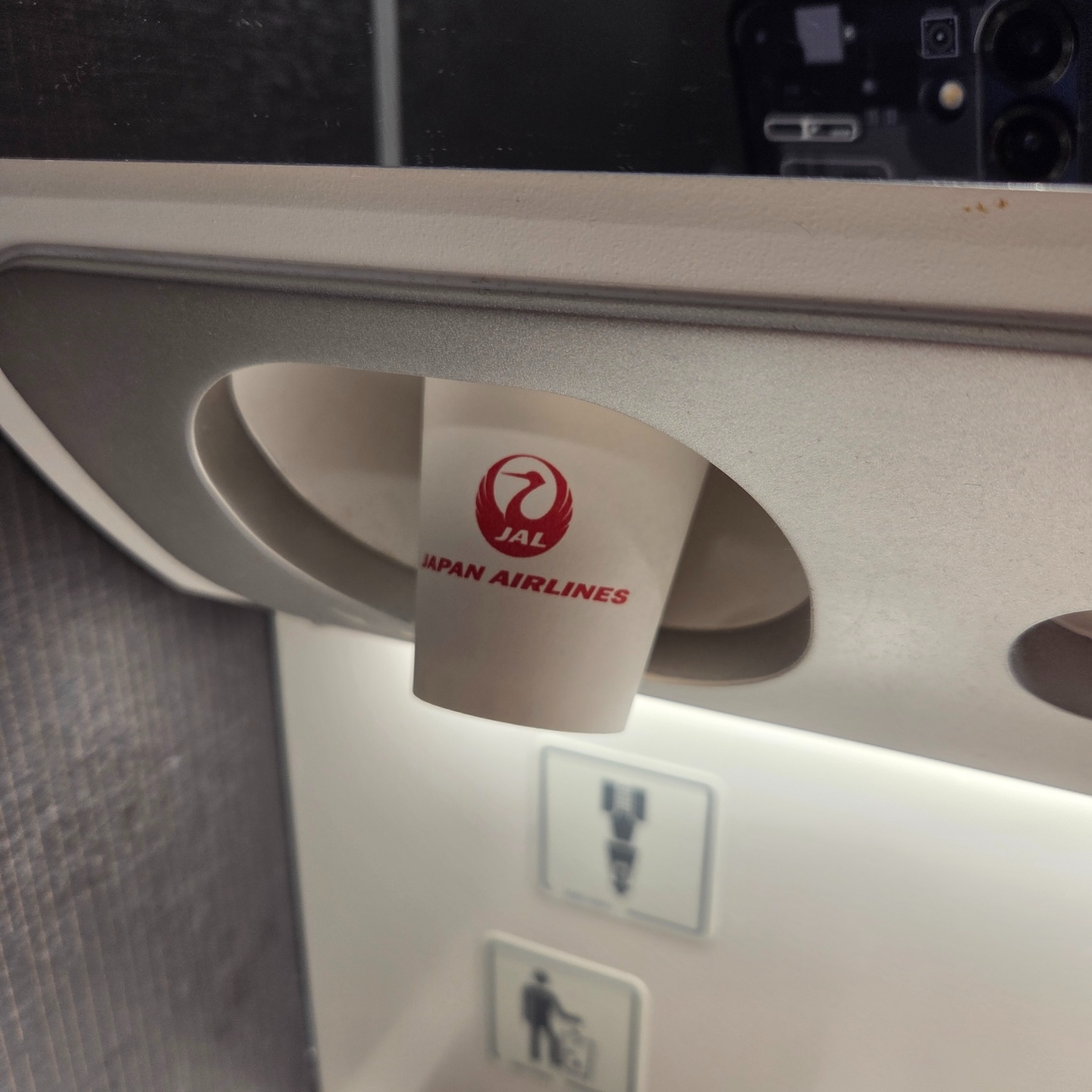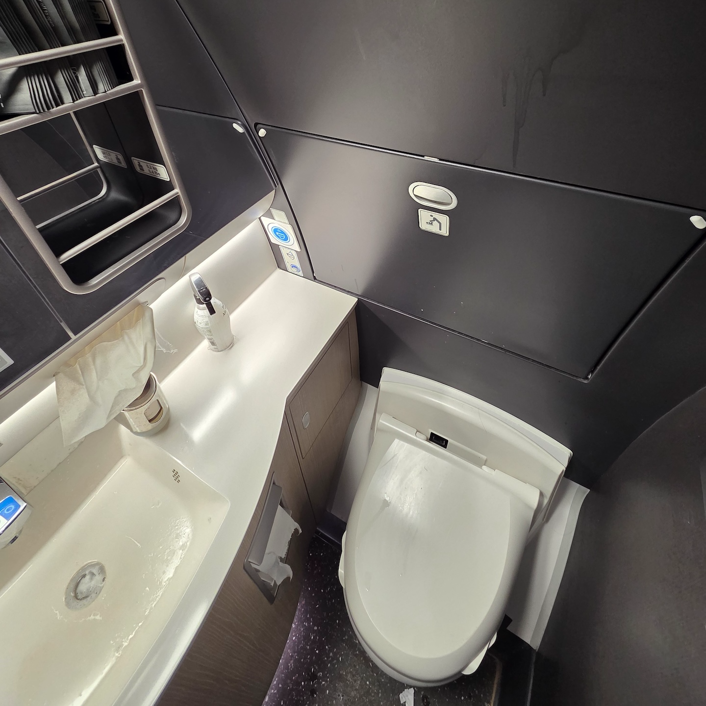 일본항공 A350-1000 이코노미 클래스 화장실 비데 스위치와 물내림 스위치 일본항공 A350-1000 이코노미 클래스의 경우 이코노미 캐빈 전방 우측에 이코노미용 화장실 1개와 이코노미 캐빈 후방에 화장실 3개가 배치되어 있어 약 52명당 하나의 화장실을 사용할 수 있습니다. 일본항공 답게 4개의 화장실 모두에 비데가 설치되어 있으며 우측 우방 화장실 하나를 전부 제외하고는 기저귀 교환대도 설치되어 있었습니다. 화장실의 경우 일반적인 화장실이었지만 첫 비행으로부터 이제 1.5년밖에 되지 않은 비행기였기에 깨끗한 상태로 관리되고 있었습니다. 변기와 세면대 부분을 제외하고는 전부 어두운 색으로 마감되어 있어 화장실 치고는 굉장히 중후한 분위기여서 재미있었습니다. 화장실 내부에는 스프레이 방향제와 핸드워시, 그리고 양치 때 요긴하게 사용할 수 있는 작은 종이컵도 마련되어 있었습니다. 최신 항공기답게 변기의 물을 내리는 버튼은 굳이 누르지 않아도 되는 터치리스 방식으로도 작동이 가능했습니다.