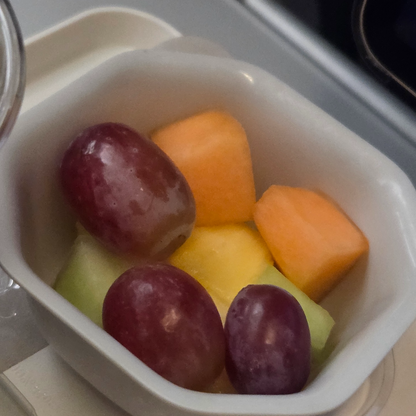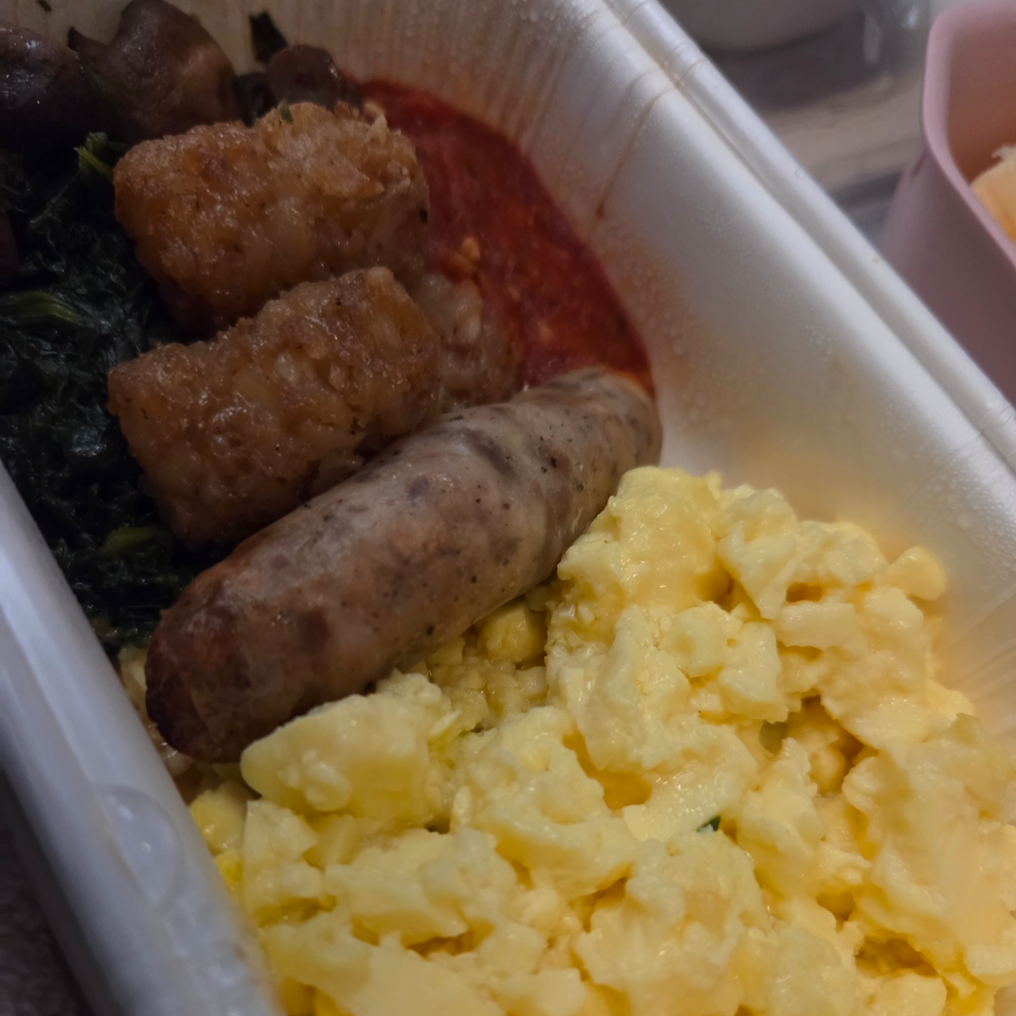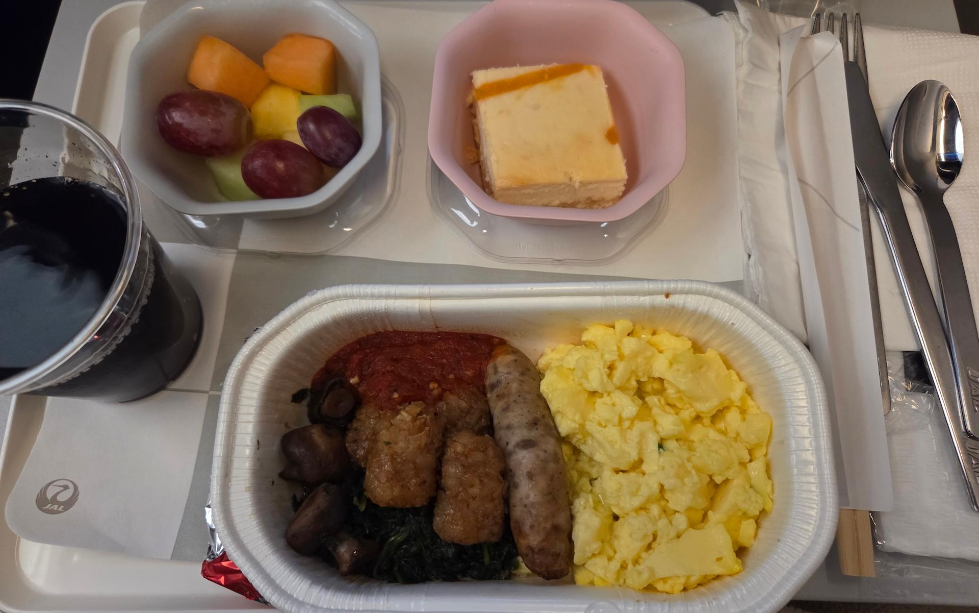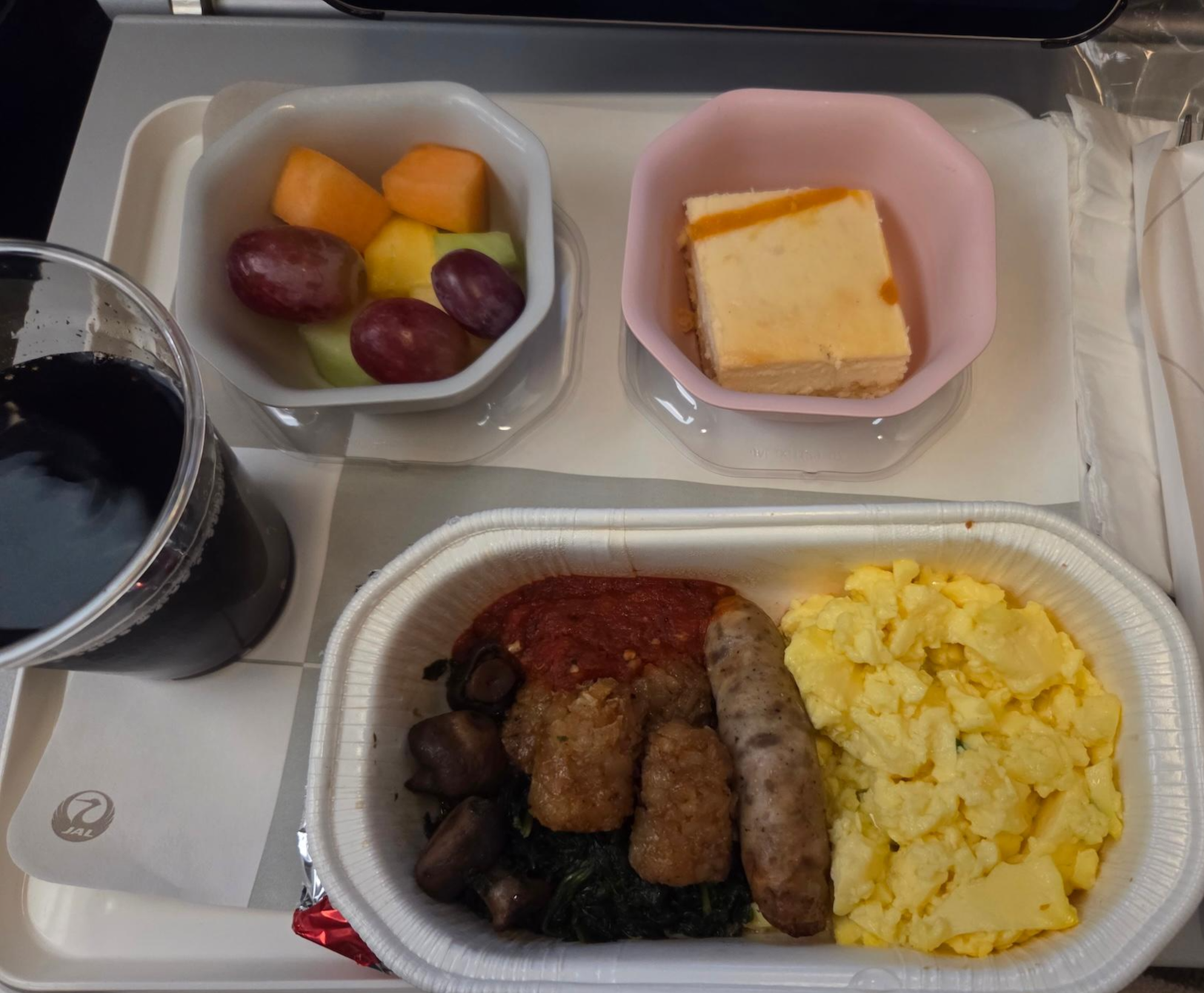 일본항공 장거리 이코노미 클래스 JL11편 착륙 전 기내식 착륙 전 식사 메뉴는 단일 메뉴로 제공되었습니다. 메뉴는 스크램블드 에그, 돼지고기 소시지, 시금치 볶음, 테이터 탓츠였으며 디저트로는 과일, 패션후르츠 치즈케이크, 커피/홍차/녹차가 제공되었습니다. 테이터 탓츠라고 불리는 작은 튀긴 감자볼의 경우 냉동 향이 살짝 나면서 눅눅해서 아쉬웠습니다. 스크램블드 에그는 다시 데워서 제공되는 기내식 치고는 식감이 탱탱해서 좋았고, 돼지고기 소시지의 경우 약간의 고기 누린내가 느껴졌는데 간과 향신료를 세게 사용하는 미국식이 아닌, 일본식 소시지라서 더 그렇게 느껴졌던 것 같습니다. 함께 나온 버섯과 시금치 모두 간이 세지 않아서 버섯과 시금치 향이 잘 느껴져서 좋았습니다. 과일들은 전반적으로 신선했지만 포도를 제외하고는 아주 달고 맛있는 과일이라 하기는 애매했으며 치즈케이크는 패션후르츠 맛이 은은하게 나서 맛있었습니다.