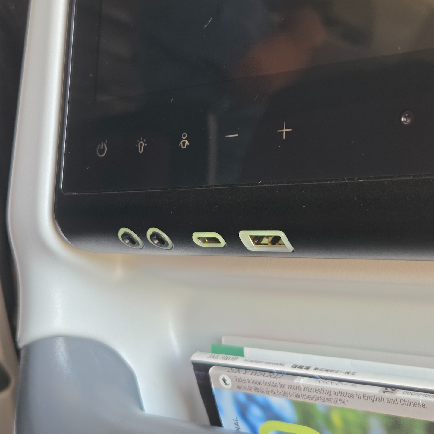 일본항공 A350-1000 이코노미 클래스 충전기, 오디오 단자, 유니버셜 전원 플러그 이 스크린에는 USA-A 타입 뿐 아니라 USB-C 타입 단자도 함께 설치되어 있어 단자 종류와 상관없이 디바이스 충전이 가능했고 디스플레이뿐만 아니라 팔걸이 부분에도 오디오 아웃풋 단자가 설치되어 있어 밥을 먹거나 옆 사람이 오갈 때도 유선 이어폰 선이 걸리적거리지 않는다는 장점도 있었습니다. USB 단자 이외에도 110v가 들어오는 유니버설 전원 플러그가 좌석마다 제공되어 프리볼트 충전기라면 220v 플러그로도 충전기를 연결할 수 있었습니다. 다만, 이 전원 플러그가 조금 헐거운 데다가 전원 플러그가 바닥 방향을 보고 있어 충전기를 살짝 건드리거나 하는 경우에 플러그에서 잘 빠지는 아쉬움이 있었습니다. 또한 전원 플러그와 USB 단자 모두 지상이나 저고도에서는 작동하지 않고 고도 10000피트 이상에서만 작동했습니다.