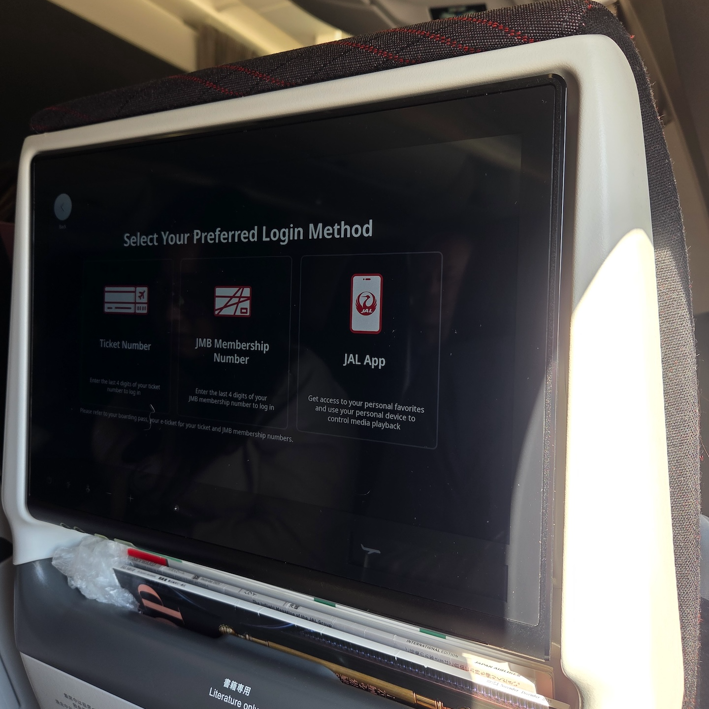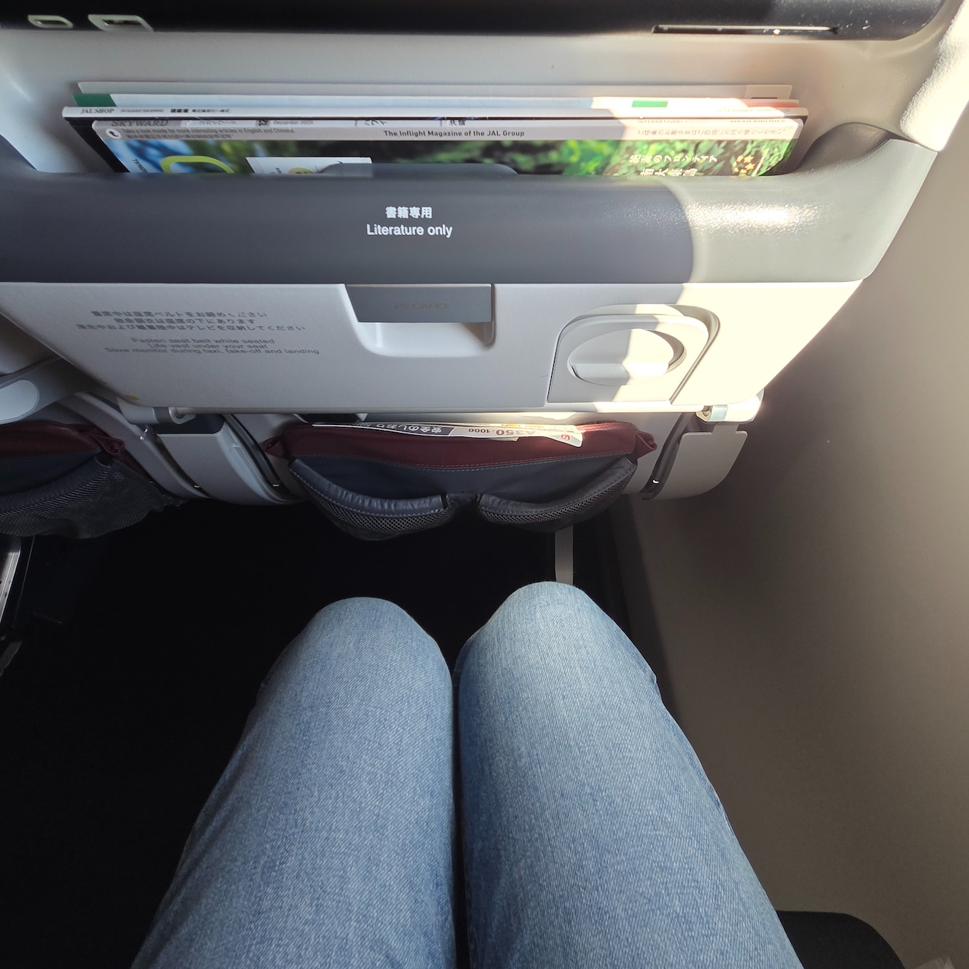 일본항공 A350-1000 이코노미 클래스 기내 책자 디스플레이 하단에는 기내 매거진 등의 책자류를 넣을 수 있는 공간이 마련되어 있었습니다. 일본항공의 경우 좌석마다 각 좌석에 대한 이용 안내문을 비치해 놓는데 이 안내문도 이 공간에 비치되어 있었고, 기내 와이파이 이용 설명서와 기내 면세 판매 책자도 이곳에 비치되어 있었습니다.