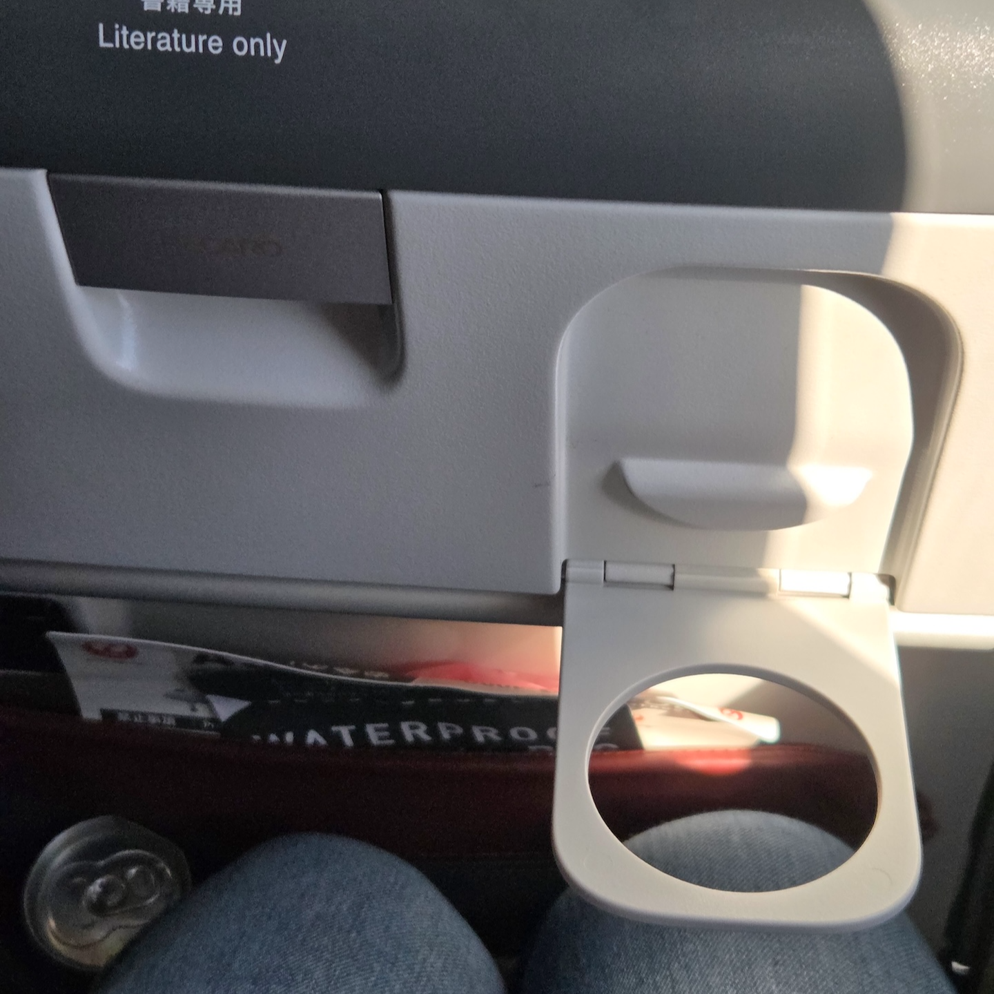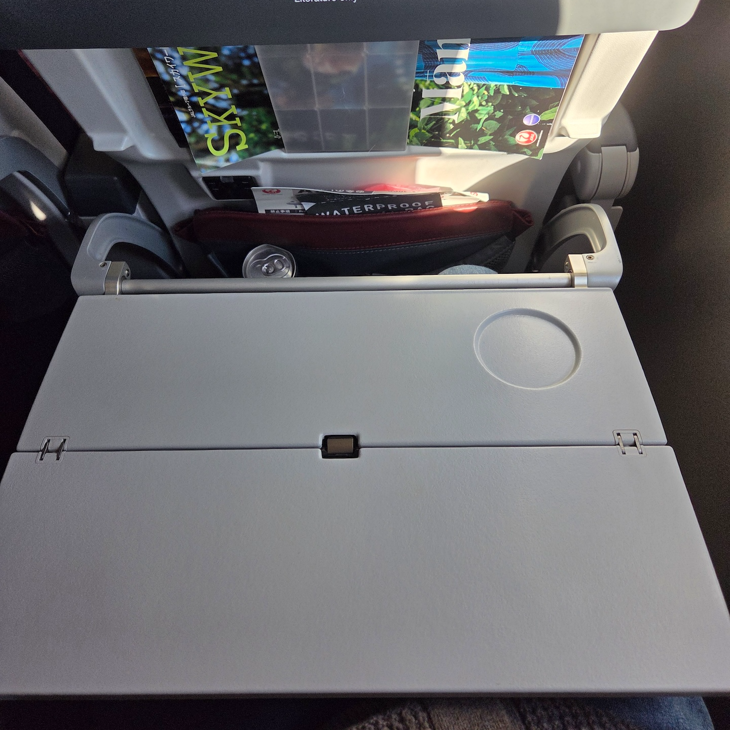 일본항공 A350-1000 이코노미 클래스 테이블 그 아래로는 두번 접을 수 있는 테이블이 설치되어 있었습니다. 한 번만 펼쳤을 때는 작은 스낵과 함께 종이컵을 올려놓을 수 있도록 홈이 파진 테이블이 되고 두 번 모두 펼쳤을 때는 기내식 트레이가 전부 들어갈 수 있는 큰 테이블이 되었습니다. 테이블을 모두 접었을 때도 따로 펼칠 수 있는 컵 홀더가 마련되어 있어서 아주 편리했습니다.