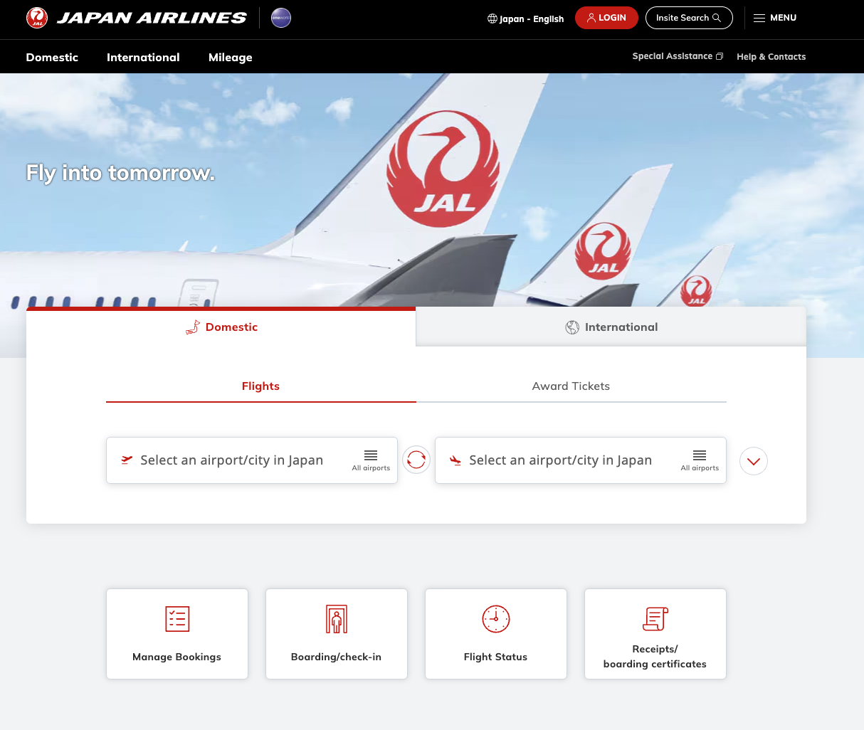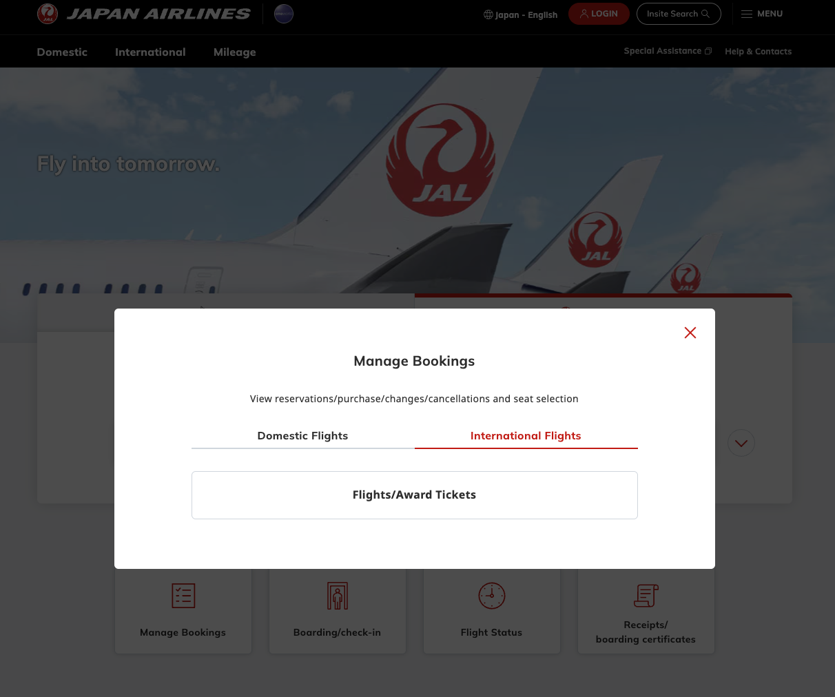 일본항공 웹사이트 (c) jal.co.jp/jp/en/ 만약 저와 같이 일본항공 운항 항공편을 일본항공에서 직접 구입한 것이 아닌, 다른 항공사의 편명을 달고 있는 코드셰어편으로 구입하셨을 때 일본항공 좌석 지정을 하기 위해서는 두 가지 방법이 있습니다. 첫째는 발권 항공사에 직접 연락을 하는 방법입니다. 둘째는 일본항공 웹 사이트를 이용하는 방법입니다. 일본항공 웹 사이트에서 직접 좌석지정을 하는 방법은 다음과 같습니다. 먼저 일본항공 일본 웹사이트로 들어갑니다. 표시 언어는 상관없으나 일본 지역 웹사이트로 들어가야 합니다. (이 링크를 통해 일본항공 일본 지역 웹사이트의 영어 표시 사이트로 들어가실 수 있습니다. ) 그 다음은 중앙 우측에 있는 ‘Manage Bookings’ 버튼을 누릅니다. 이 버튼을 누르면 열리는 팝업에서 ‘International Flights’를 누르신 후 ‘Flights/Award Tickets’를 누르면 정보를 입력하고 예약을 조회하는 화면으로 넘어갑니다.