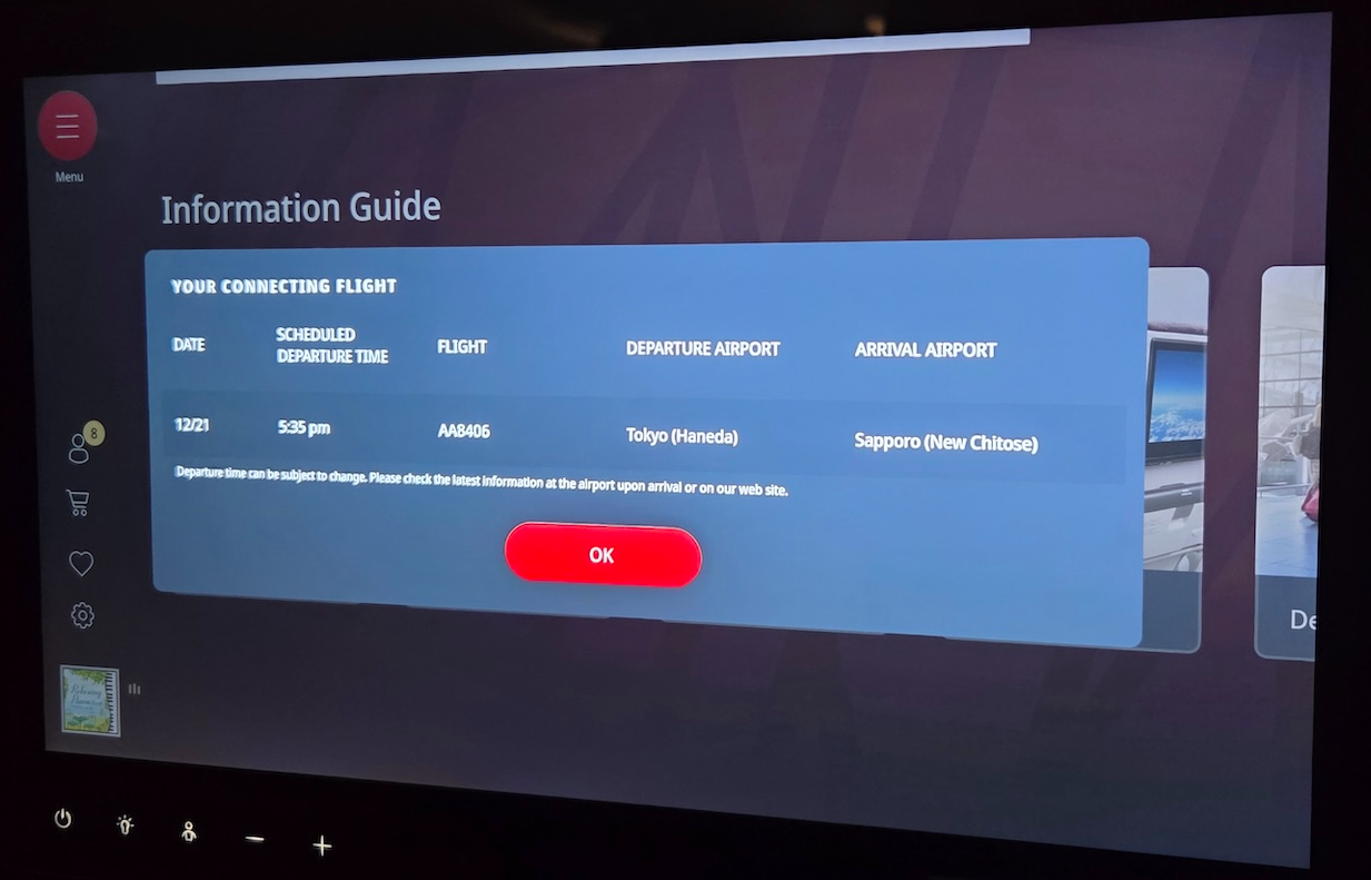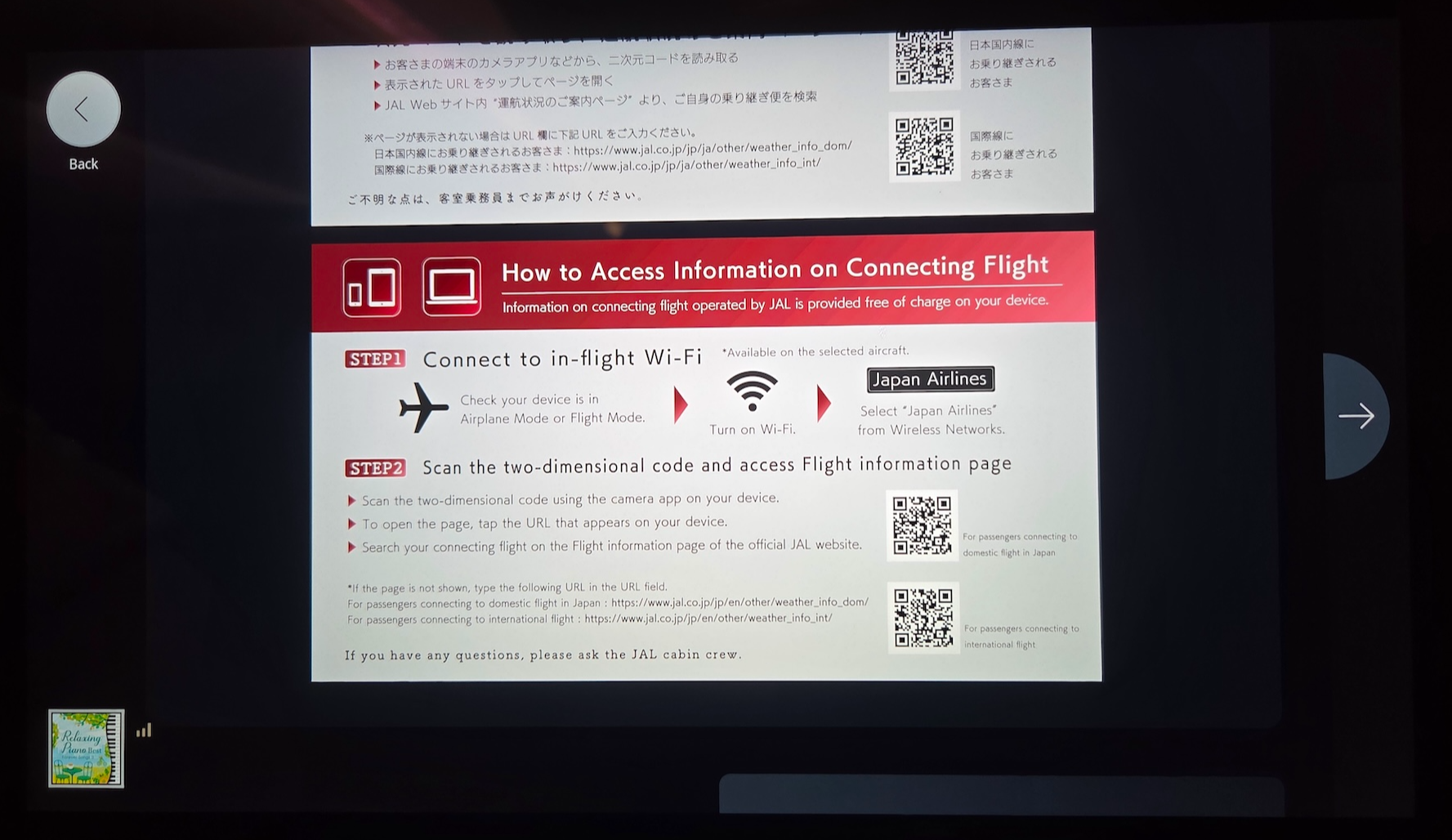 일본항공 A350-1000 이코노미 클래스 캐빈 안내도와 환승편 안내화면 이 외에 기내 시설이 표시되어 있는 항공기 레이아웃, 기내식 메뉴 및 주류&음료 메뉴, 다양한 음악 컨텐츠도 기내 엔터테인먼트 모니터를 통해 확인할 수 있습니다. 환승 항공편 정보도 기내 모니터를 통해 확인할 수 있는데, 출발 게이트나 터미널 정보가 함께 표시되는 게 아닌, 편명, 출발시간, 도착지 등만 간단하게 표시해 주는 수준이라 큰 효용성은 없었습니다.