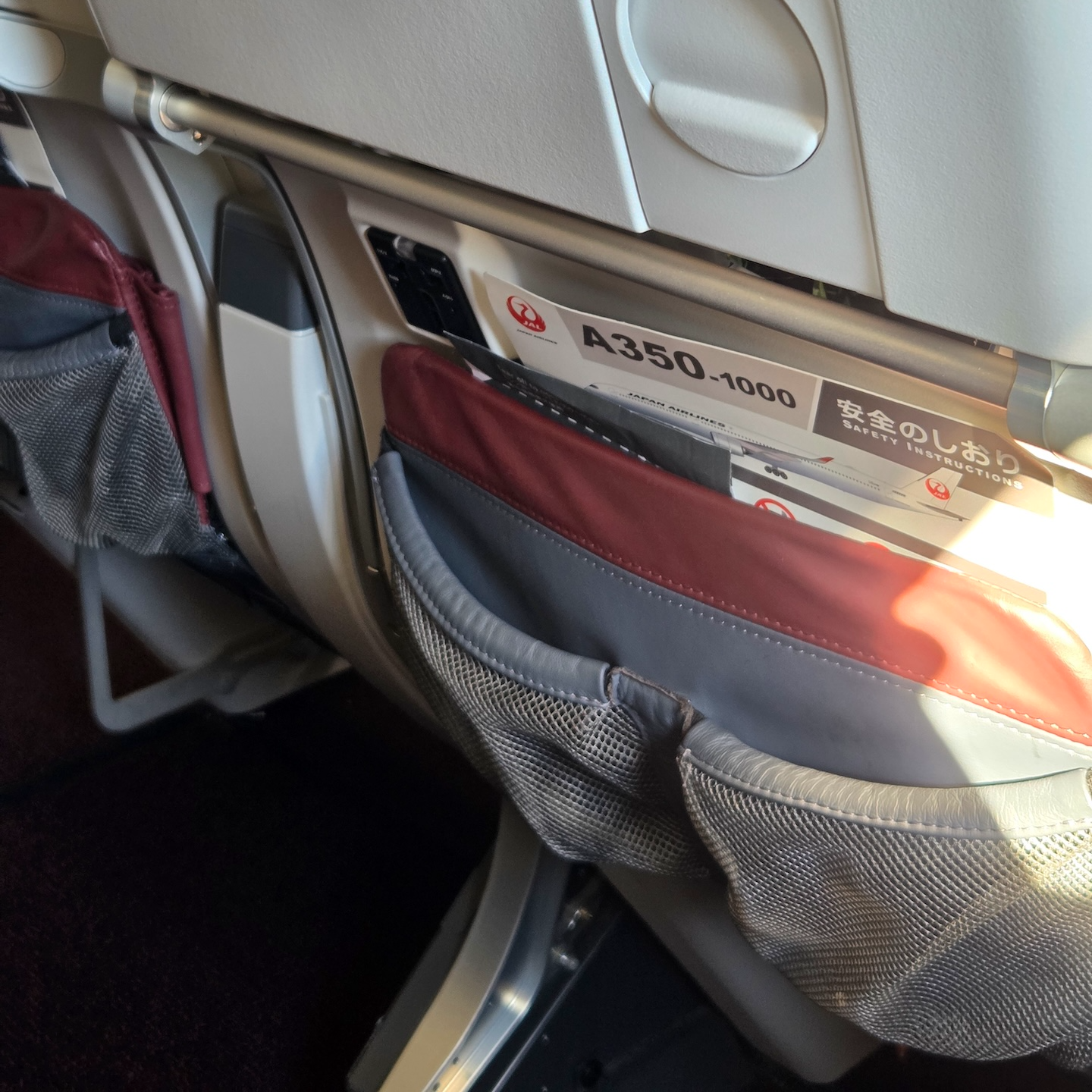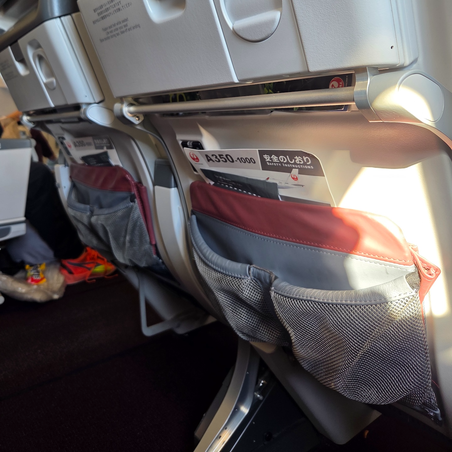 일본항공 A350-1000 이코노미 클래스 수납 주머니와 후크, 안전 책자 테이블 아래로는 크기가 다른 수납 주머니들이 설치되어 있었습니다. 큰 수납 주머니에는 위생봉투와 안전책자가 있었고, 작은 수납 주머니에는 핸드폰이나 물병과 같은 물건을 놓기에 편리했습니다. 일반적으로 이곳에 물건을 수납하면 레그룸이 좁아지는 단점이 있긴 하지만, 애초에 레그룸이 충분한 좌석이다 보니 어느 정도 물건을 수납해도 크게 불편하지는 않았습니다. 그 외에는 K열 좌석 기준으로는 앞 좌석 왼쪽, 나머지 열 기준으로는 앞 좌석 왼쪽에 옷이나 액세서리를 걸 수 있는 후크가 마련되어 있었습니다.
