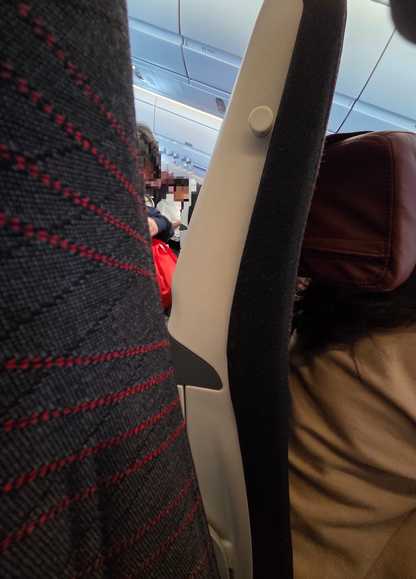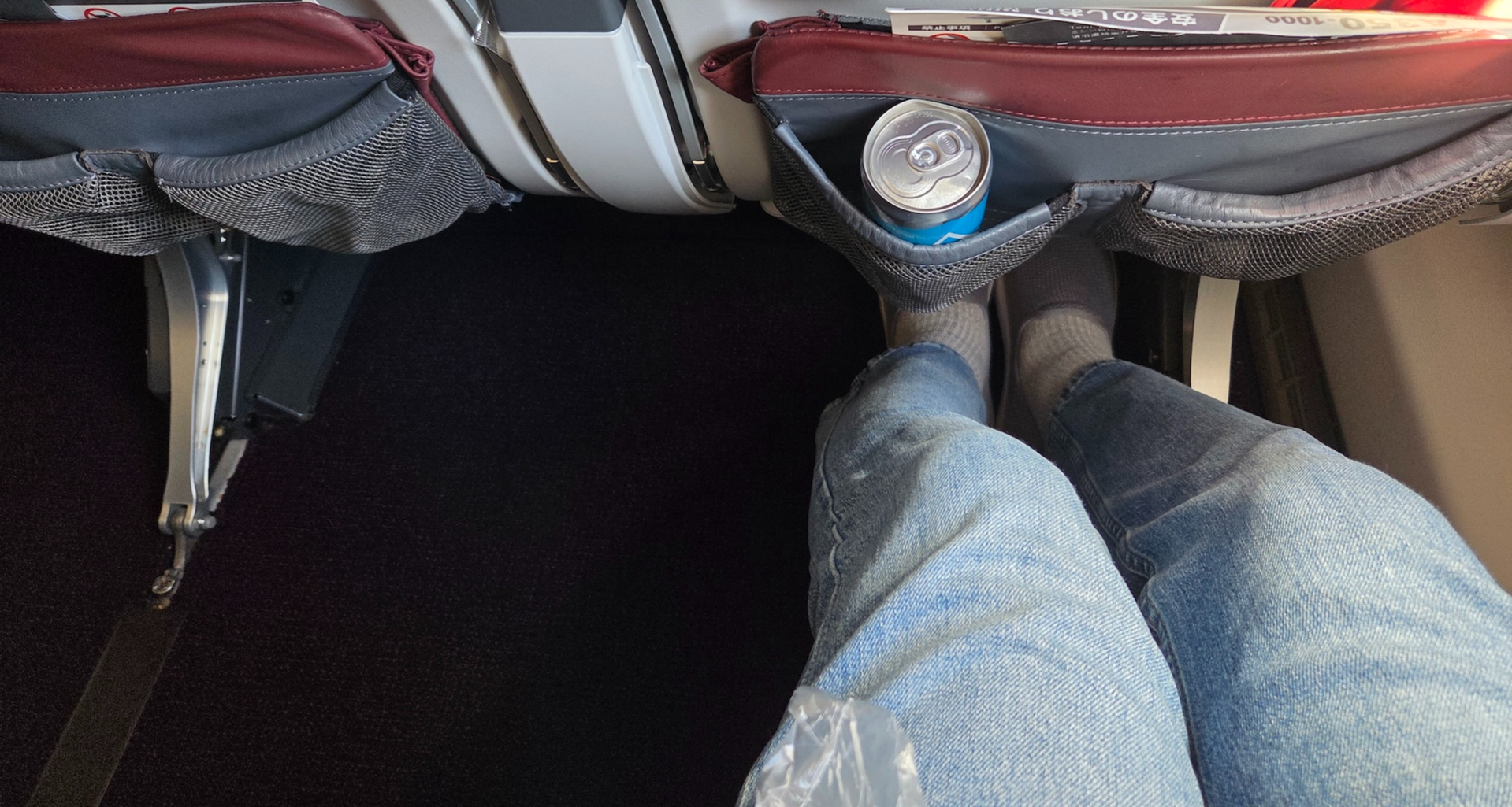 일본항공 A350-1000 이코노미 클래스 앞 좌석 의자 다리 위치 애초에 하드웨어 스펙 상으로도 33인치가 넘는 좌석간격은 충분히 넓은 좌석간격이지만 최신 좌석답게 무릎이 닿는 부분의 앞 좌석을 최대한 얇게 뽑아 실제로 체감되는 좌석 간격은 그 이상이었습니다. 180cm 남성이 엉덩이를 최대한 붙이고 앉았을 때 앞 좌석과 무릎 사이에 주먹 1개 반이 충분히 들어갈 정도의 좌석간격이었습니다. 일반적으로 미국 항공사들이 엑스트라 레그룸으로 판매되는 좌석의 좌석 간격이 34인치인데 그런 좌석들과 체감상 크게 차이가 나지 않는 좌석이었습니다. 즉, 일본항공 A350-1000 이코노미 클래스는 모든 좌석이 엑스트라 레그룸이라고 해도 아주 틀린말은 아닌 거죠. 더불어 일반적으로 창가 자리에 앉으면 앞 좌석을 동체에 고정시키는 다리의 공간이 애매한 경우가 많은데, 일본항공의 A350-1000의 경우 앞 좌석 의자 다리를 최대한 창가 방향으로 뺀 덕분에 이 의자 다리 위치가 불편하게 느껴지지 않았습니다.
