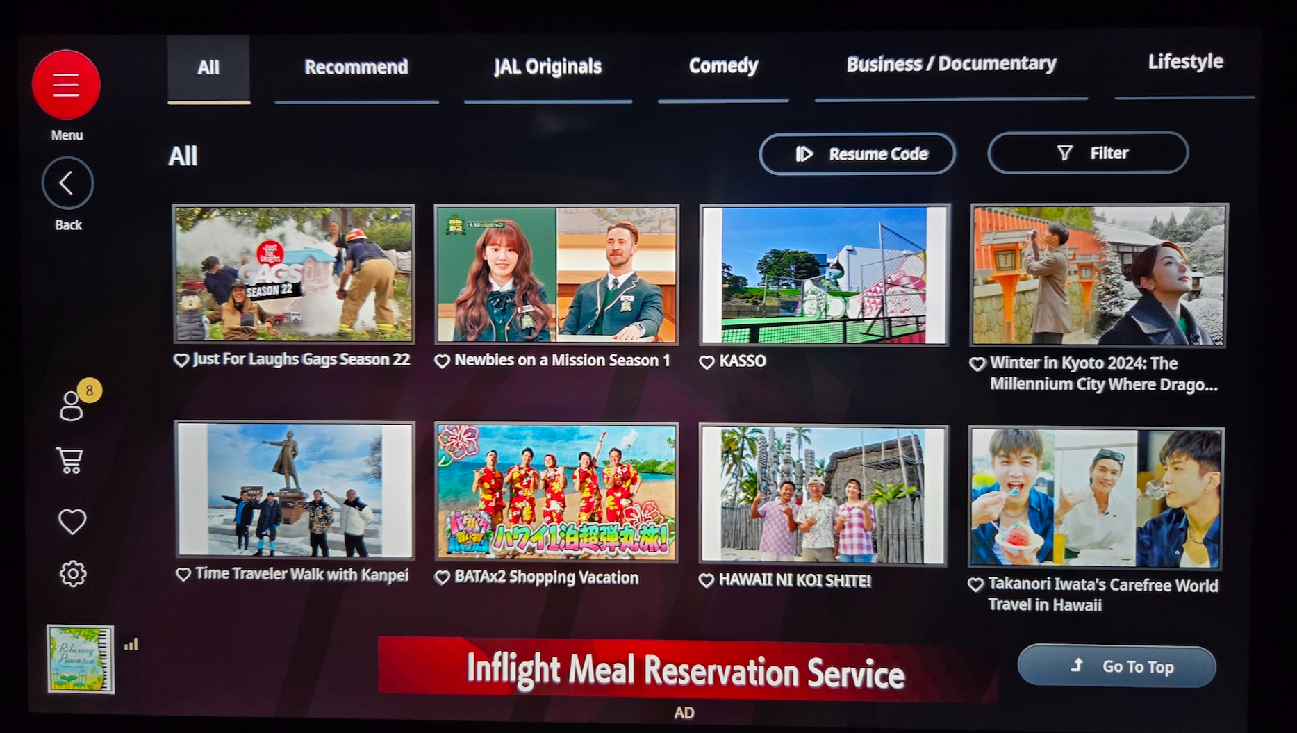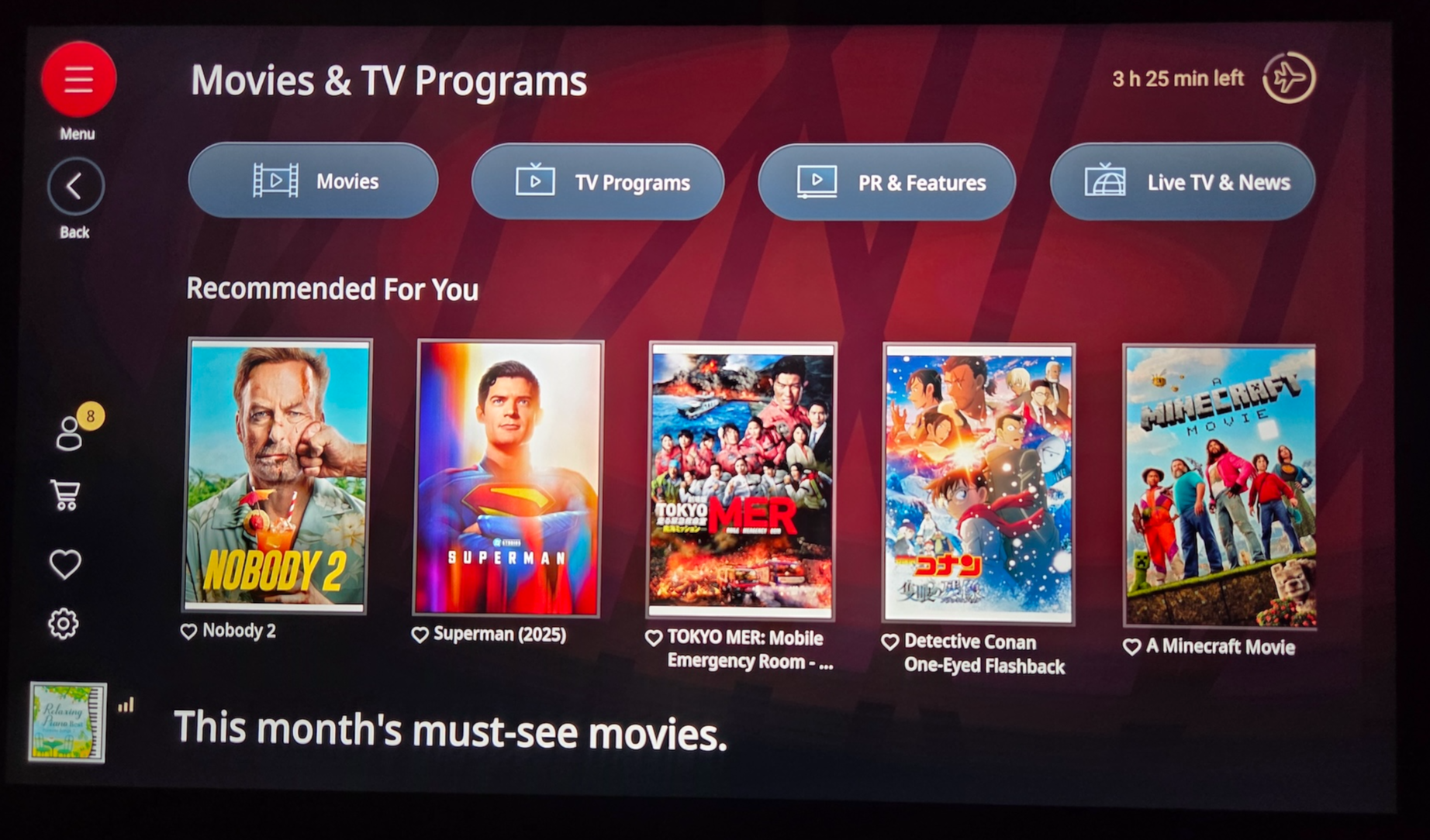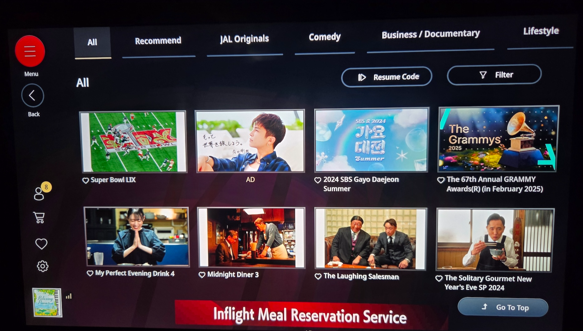 일본항공 A350-1000 기내 엔터테인먼트 시스템 컨텐츠 그래도 방금 언급한 대로 시민 덕희, 히트맨 2 등의 한국 영화, 아는 외고와 같은 한국 예능, SBS 가요 대전과 같은 한글로 된 음악 컨텐츠들도 들어있었습니다. 최근 새로운 아바타 시리즈가 개봉해서인지 지금까지 개봉한 아바타 2편을 비롯해 2025년에 개봉한 슈퍼맨도 들어있었고, 일본 콘텐츠로는 많은 한국 분들이 좋아하시는 고독한 미식가도 들어있었습니다.