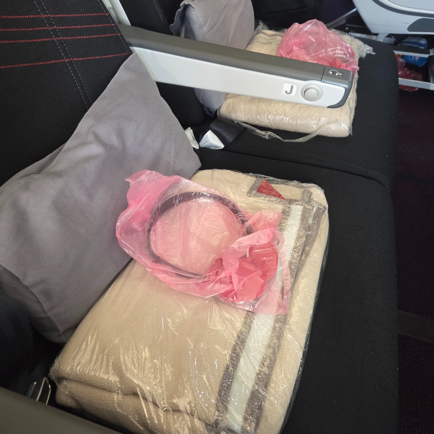 일본항공 장거리 이코노미 클래스 기내 어매니티 일본항공의 장거리 이코노미 클래스의 어매니티로는 기본적인 아이템들인 담요와 베게, 헤드셋이 제공됩니다. 담요의 경우 일반적인 모포 재질이었고 일본항공 특유의 모서리 한쪽을 접고 빨간색으로 마무리한 디자인이 인상적이었습니다. 다만, 일본항공의 기내 온도도 낮은 편이 아니라 추위를 많이 타시는 분이 아니라면 굳이 쓰지 않아도 될 정도였습니다. 베개의 경우 평범한 낮은 베개였는데 대한항공과 달리 베개 피가 면으로 되어 있어 촉감은 훨씬 좋은 편이었습니다. 헤드셋의 경우 노이즈 캔슬링 헤드폰이 아닌 일반적인 헤드폰이었으며 장시간 끼면 귀가 아픈 이어폰보다는 좋지만, 일본항공의 A350-1000의 경우 모든 좌석의 개인 엔터테인먼트 시스템에서 블루투스 오디오 디바이스 연결을 지원하기 때문에 크게 쓸 일은 없어 보였습니다. 처음에 탑승했을 때 생수가 있지 않아 생수를 주지 않는 건가 싶었지만, 첫 번째 기내식 때 밀 트레이에 350ml 정도 되는 작은 생수병이 함께 제공되었습니다. 이 외에 요청시 제공되는 어매니티로는 안대, 이어플러그, 엽서 등이 있습니다.