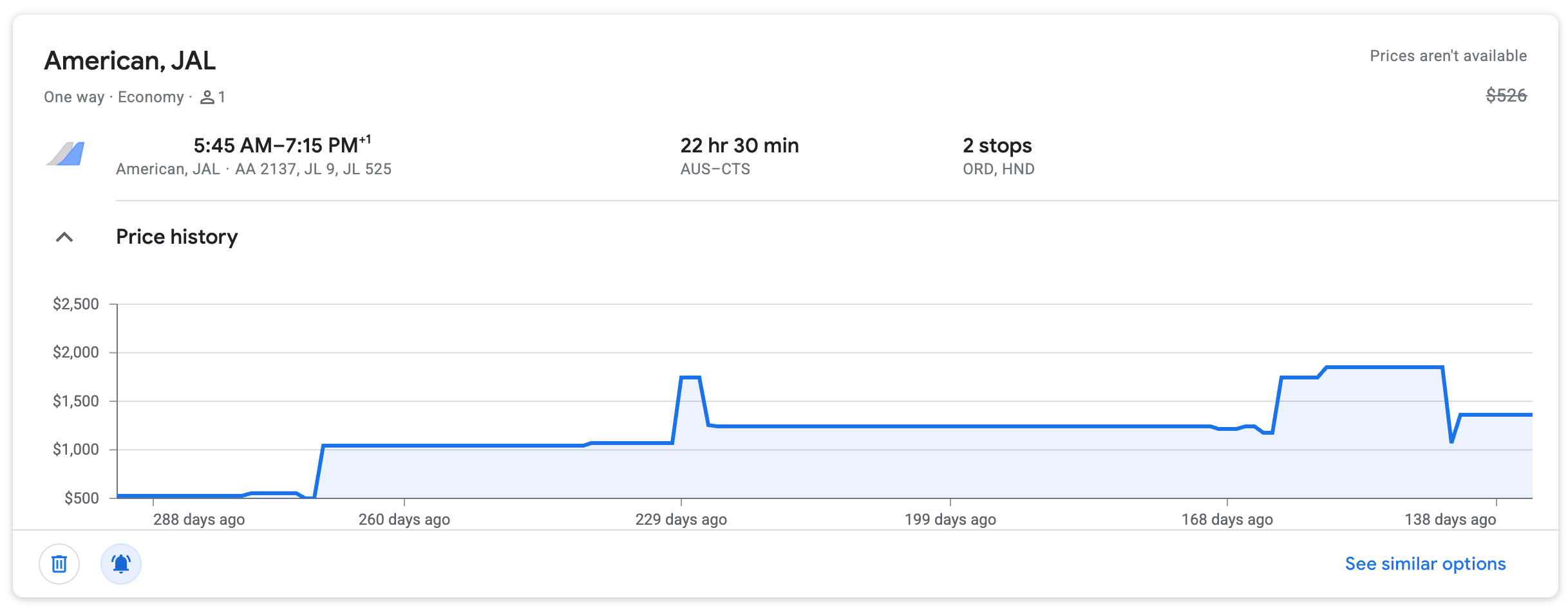 오스틴에서 출발해 시카고, 도쿄 하네다를 거쳐 삿포로로 향하는 항공권의 가격 변동 정보 (c) google.com/travel/flights 대략 출발 10달 전이었던 2025년 2월에 저는 해당 기간에 일본으로 가는 편도 항공권이 600 달러도 안되게 나온걸 확인하고 바로 발권을 했습니다. 이 일정이 원래 시카고 오헤어 공항으로 가서 도쿄 하네다행 일본항공을 탄 다음 삿포로로 가는 일정이었고요. 원래는 일요일 출발이었습니다. 사실 일요일 출발임에도 이 시즌에 이 정도 가격은 아주 싼 게 맞아서 별로 고민도 없었고, 꽤 만족하고 있었습니다. 하지만 올해 6월 일본항공에서 도쿄 나리타에서 시카고 오헤어 공항으로 가는 항공편을 재개하면서 시카고행 항공편들의 시간 조정이 일어났고 이에 따라 시카고에서 도쿄 하네다로 가는 항공편이 밤비행기로 조정되면서 원래 월요일에 삿포로에 도착했어야 하는 일정이 화요일로 미뤄집니다. 이는 항공편 무료 변경이 가능한 정도의 일정 변경이었기에 저는 아메리칸 항공으로 전화를 해서 댈러스를 경유하는 항공편으로 바꿨습니다.