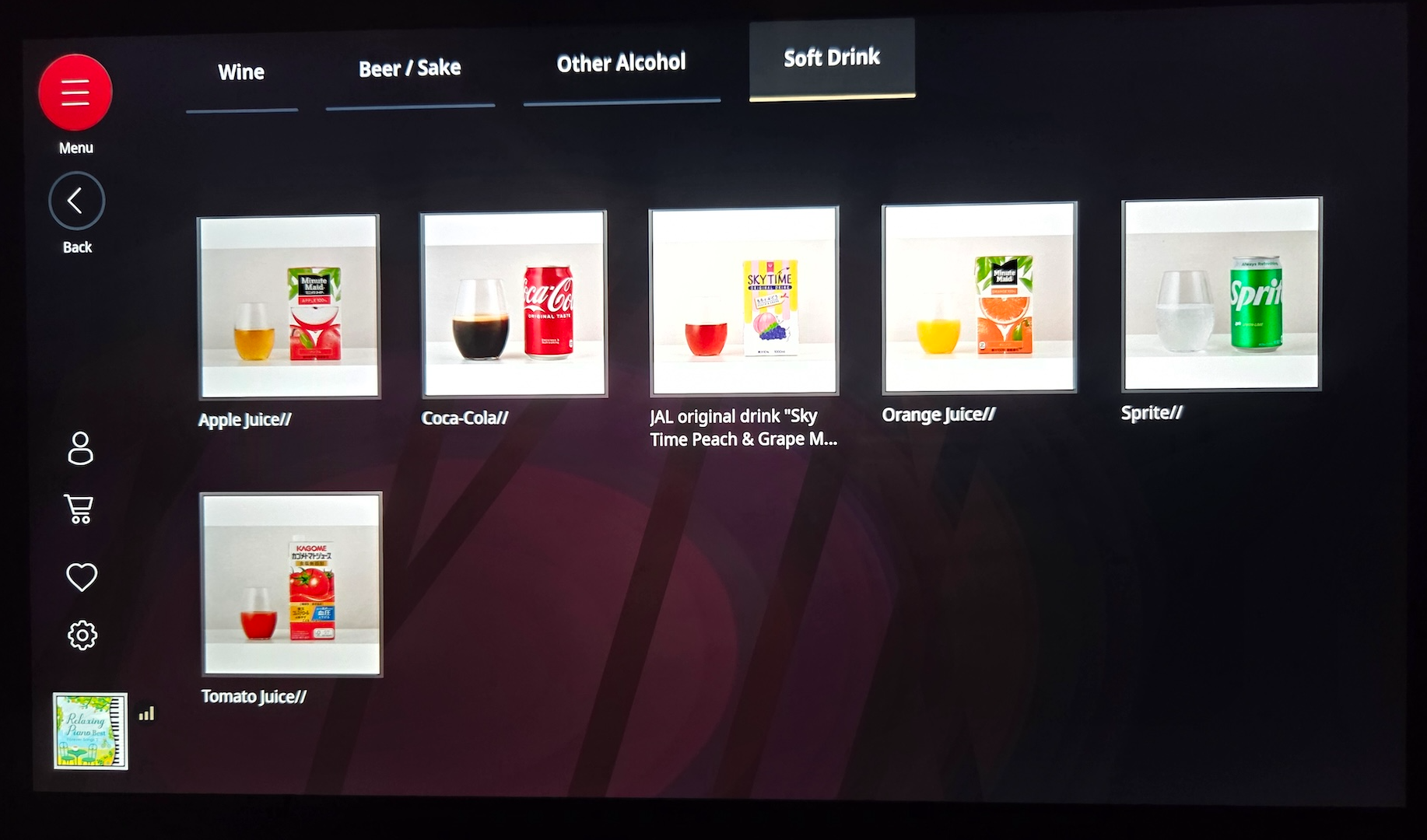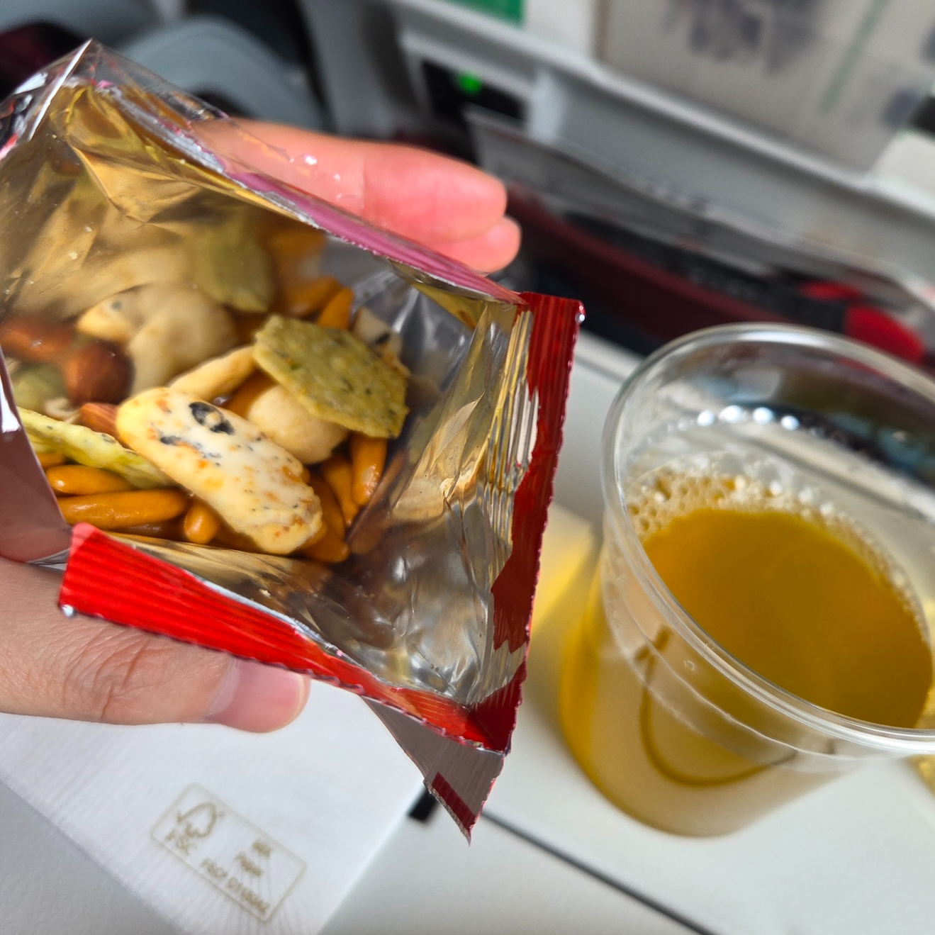 일본항공 장거리 이코노미 클래스 음료 및 주류 메뉴 주류를 제외한 음료로는 JAL의 오리지널 드링크인 스카이 타임 복숭아 & 포도, 오렌지 주스, 사과 주스, 토마토 주스, 코카콜라, 제로 콜라, 스프라이트, 냉녹차, 따뜻한 녹차(우지차), 커피, 홍차가 제공되었습니다. 선택지만 놓고 보면 아주 훌륭하지는 않아도 기본적인 것들은 다 있는 메뉴였는데요, 너무나 아쉽게도 제가 탑승한 JL11에서는 스카이 타임의 재고 부족으로 이코노미 클래스에서는 스카이 타임을 마실 수 없다는 안내를 받았습니다. 개인적으로 스카이 타임이 없는 일본항공은 상상해 본 적도 없어 의아하면서도 너무 아쉬웠습니다. 또한 탄산음료를 캔 채로 던져주는 미국 항공사에 너무 익숙해진 탓인지 작은 종이컵에 조금 담아주는 제로 콜라의 양도 아쉽게 느껴졌습니다.