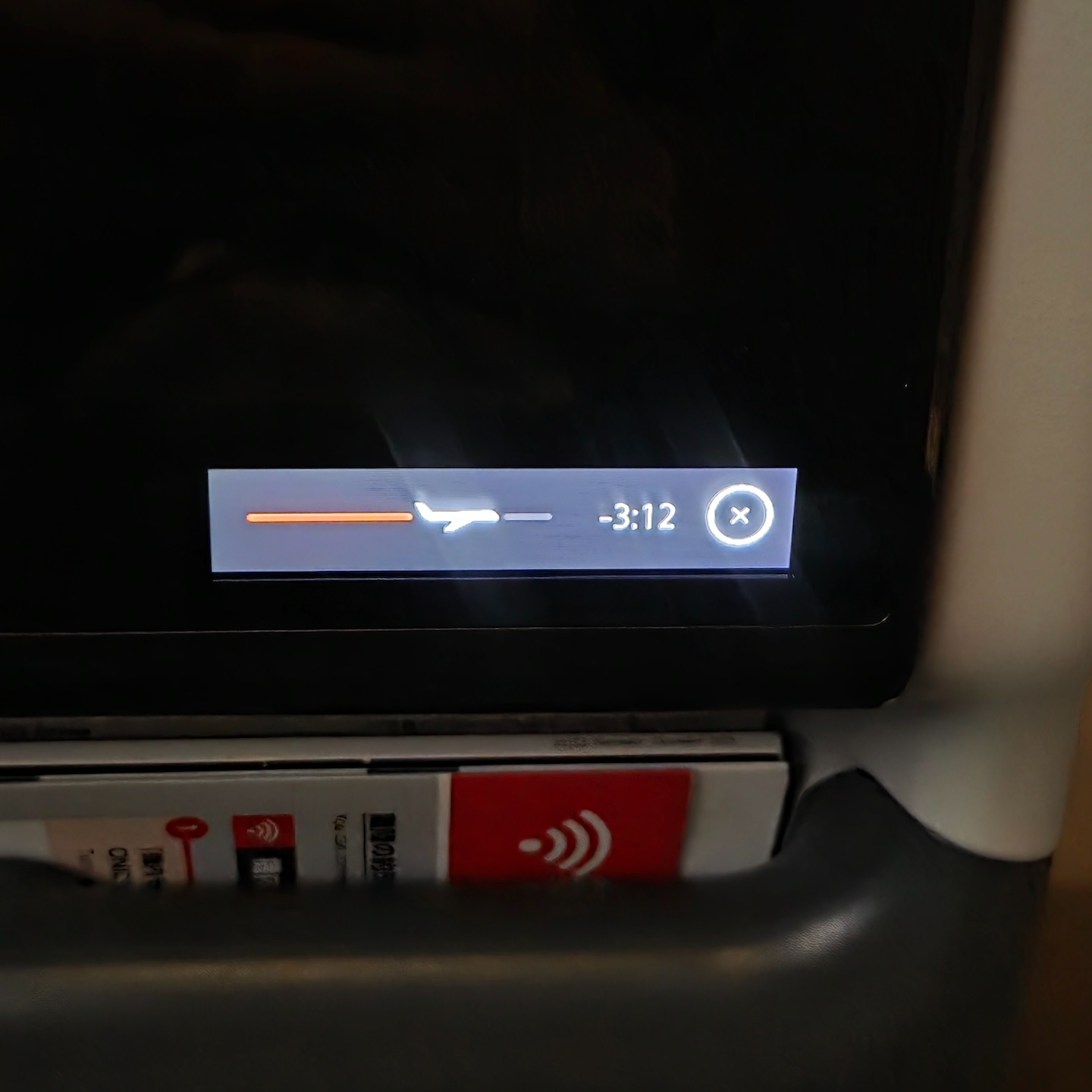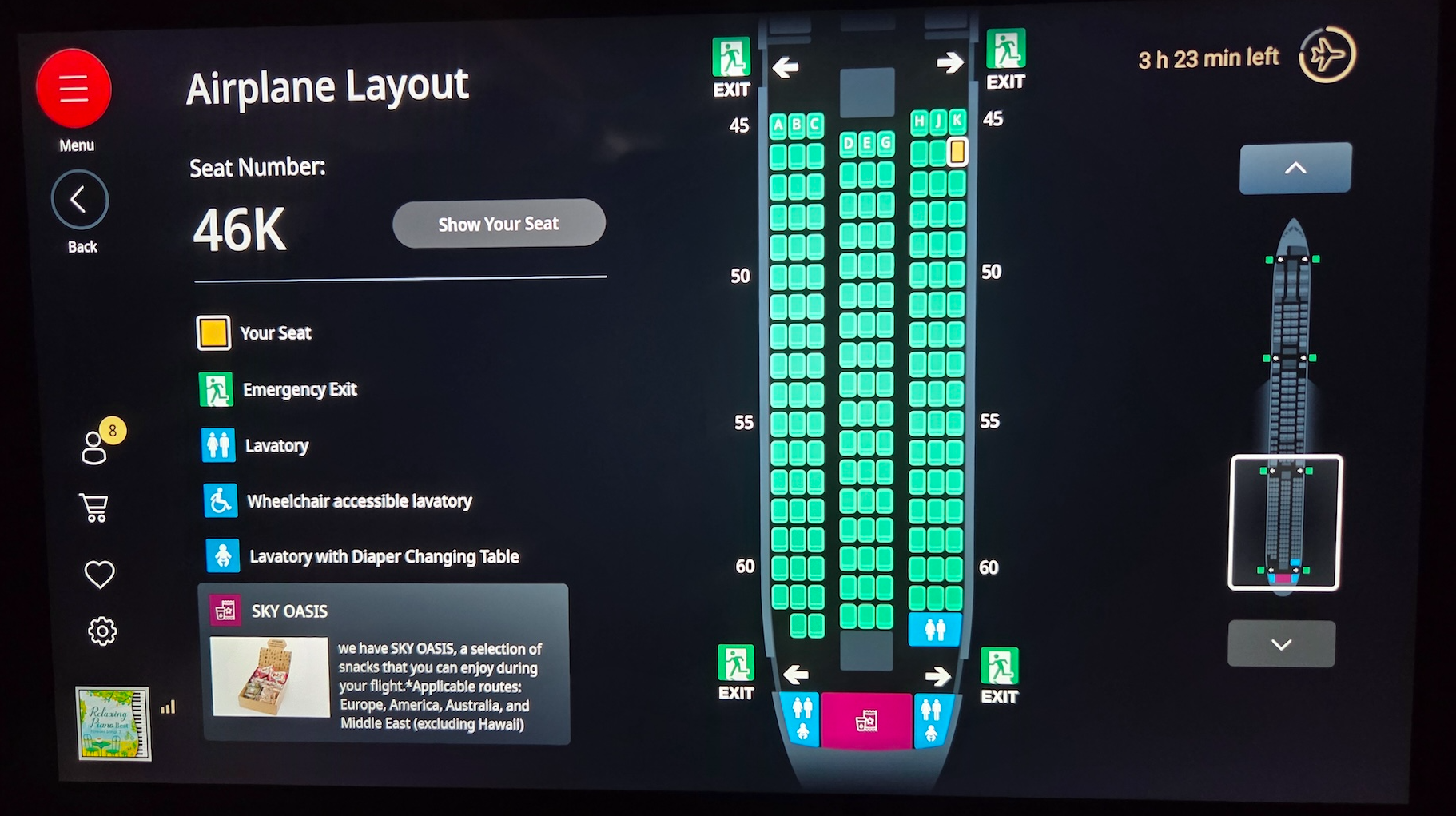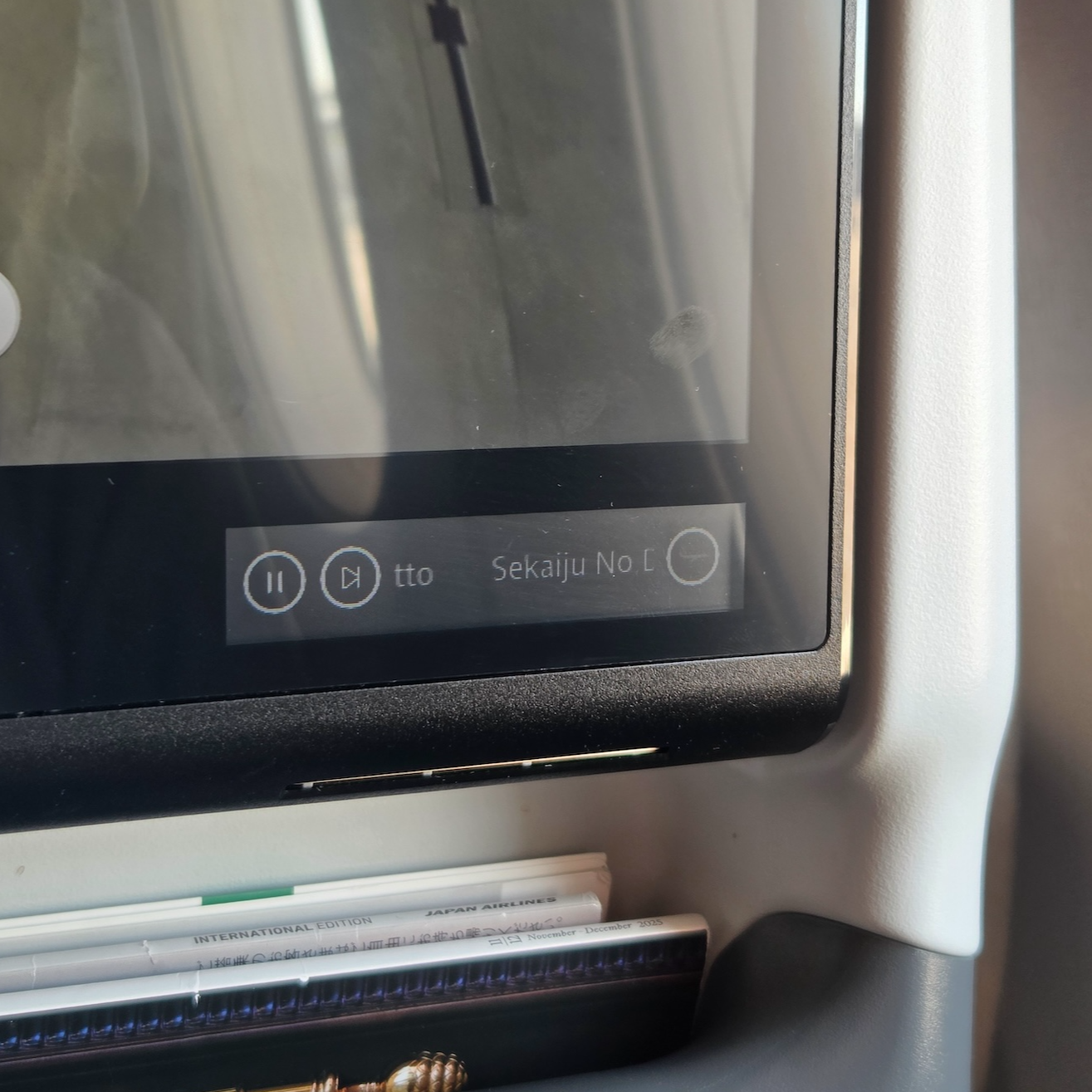 일본항공 A350-1000 이코노미 클래스 터치 스크인 안내창 좌석 간격과 더불어 일본항공 A350-1000의 이코노미 클래스 좌석을 더욱 특별하게 만들어주는 많은 요소들이 있습니다. 가장 큰건 앞 좌석을 가득 채울 정도로 큰 13인치 4K 기내 엔터테인먼트 디스플레이입니다. 스크린의 크기로만 크면 가장 큰 엔터테인먼트 디스플레이는 아니지만, 4K라는 독보적인 화질과 합쳐져 굉장히 몰입도가 높은 디스플레이를 제공합니다. 반사 반지 코팅은 되어 있지 않은지 빛 반사는 있는 편이지만 기내가 어둡거나 외부 빛이 들어오지 않는 상태에서는 크게 나쁘지 않았습니다. 또한 메인 디스플레이 오른쪽 아랫부분에 작은 사이드 디스플레이가 설치되어 있었는데 이곳으로는 현재 재생 중인 미디어, 목적지까지 남은 시간 등이 표시되어서 비행 중에 편리하게 이용했습니다. 참고로 이 작은 디스플레이도 터치가 가능해서 이 디스플레이의 재생, 일시중지 같은 버튼도 이용가능했습니다.