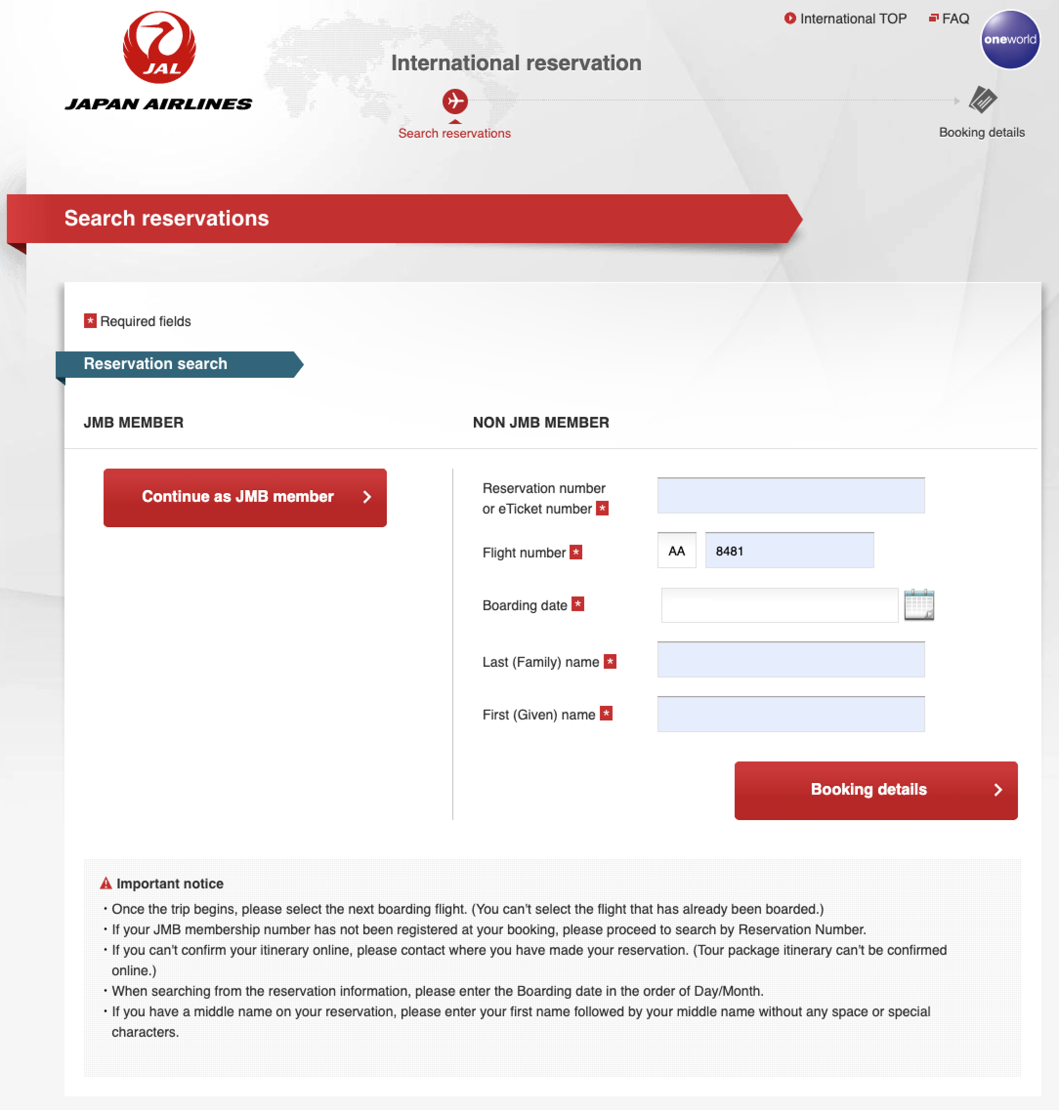 일본항공 웹사이트 예약조회 화면 (c) jal.co.jp/jp/en/ 그다음은 예약 정보를 입력해야 합니다. 첫 입력란에는 이 티켓 번호나 예약번호를 입력해야 합니다. 티켓번호는 숫자 13자리로 구성된 번호를 말하며, 예약 번호는 알파벳 또는 숫자 조합으로 이루어진 6자리를 뜻합니다. 이때 주의해야 하는 부분은 티켓번호는 무조건 1개만 존재해서 상관이 없지만, 예약번호의 경우 항공사별로 존재할 수 있습니다. 예를 들어 저와 같이 아메리칸 항공에서 예약하신 경우 아메리칸 항공의 예약 번호 (Confirmation code)뿐만 아니라 일본 항공의 예약번호 (JL confirmation code)를 확인하실 수 있는데요, 이때 반드시 일본항공의 예약번호를 입력하셔야 합니다. 그다음으로 중요한 건 Flight number 입력인데요, 코드셰어 항공편을 예약하신 경우는 반드시 실제 운항 항공편 번호가 아닌 코드셰어 항공편을 입력하셔야 합니다. 저의 경우 AA8481편을 예약했기 때문에 앞에 두 글자의 항공사 코드를 포함해서 AA8481로 입력하셔야 합니다. 세 번째 입력란에는 탑승날짜를, 네 번째 입력칸에는 성을 입력하시면 됩니다. 마지막 입력칸에는 이름을 입력하셔야 하는데 만약 Middle Name을 넣어서 발권하셨다면 중간에 공백 없이 이어서 First Name과 함께 Middle Name을 입력하시면 됩니다. 모든 정보를 입력하셨다면 Booking Details 버튼을 누르시면 되고, 이후 예약 정보창으로 이동합니다.