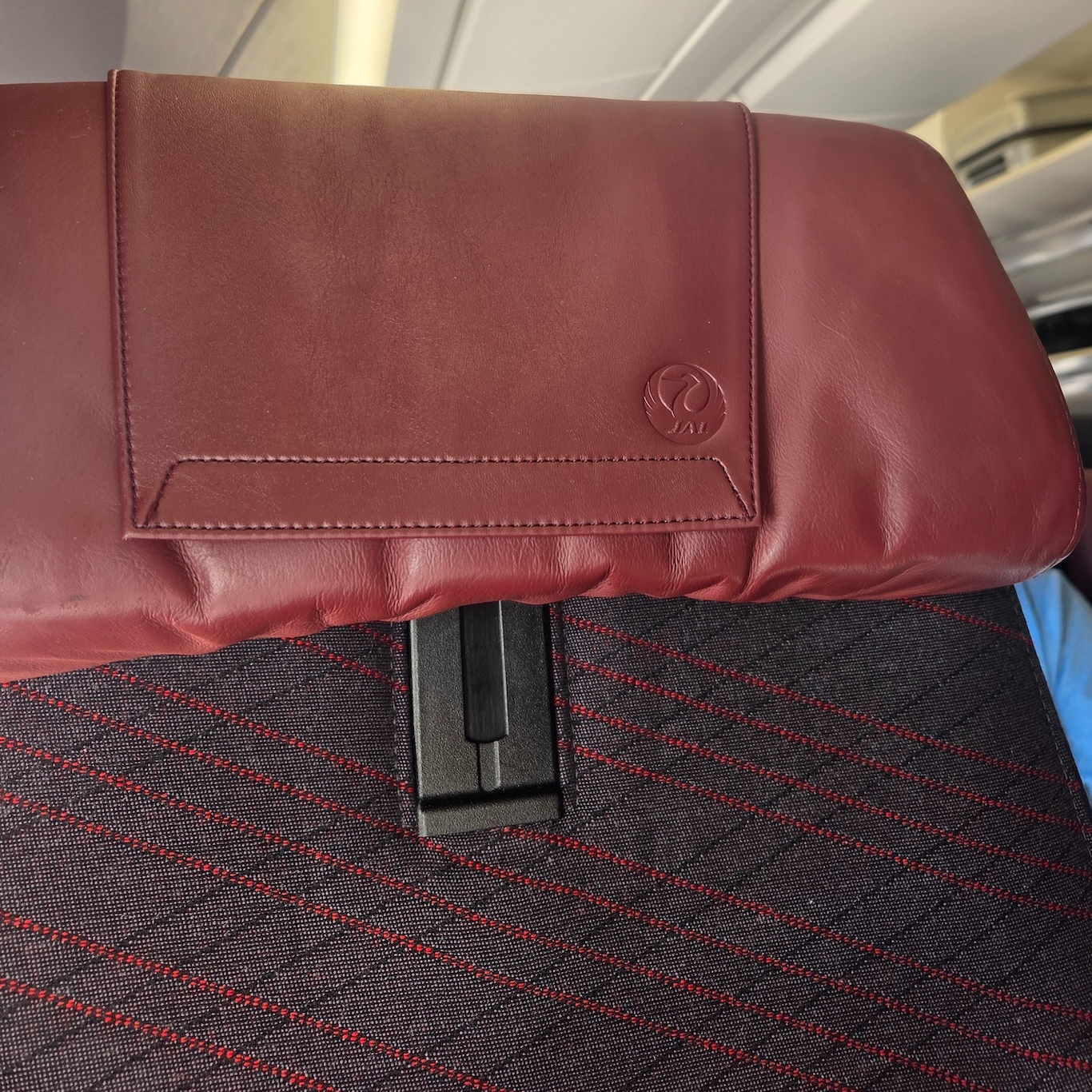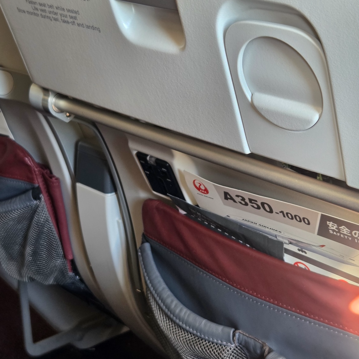 일본항공 A350-1000 이코노미 클래스 좌석 헤드레스트 이번 비행에서 저는 창가 좌석인 46K를 이용했습니다. 좌석은 장시간 앉아있어도 시트와 맞닿는 부분의 공기가 통할 수 있도록 천 재질로 마감되어 있었습니다. 최신 이코노미 좌석인만큼 시트의 두께가 두껍고 푹신한 수준은 아니었지만 장시간 비행에도 불편하지 않을 정도의 쿠션감은 있었습니다. 등받이는 최대 5도까지 뒤로 기울일 수 있었는데 생각보다 많이 젖혀지지 않는 것 같으면서도 모두 젖히면 꽤 편한 포지션이 되었습니다. 헤드레스트는 가죽으로 마감되어있었고 여섯 방향으로 조정이 가능했습니다. 여섯 방향이라 함은 헤드레스트의 위치를 위, 아래로 조정이 가능하고, 헤드레스트의 양 끝을 접었다 펼 수 있으며, 헤드레스트의 아랫부분, 목이 닿는 부분을 앞으로 당기고 뒤로 밀 수 있는 걸 말합니다. 좌석 팔걸이는 3 좌석에 4개가 설치되어 있었고 열 번호가 쓰여 있어 열 번호를 헷갈리지 않을 수 있게 한 세심함이 돋보였습니다.