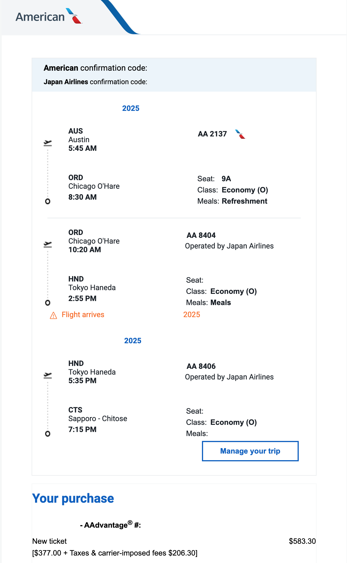 오스틴에서 출발해 시카고, 도쿄 하네다를 거쳐 삿포로로 향하는 최초 항공권 정보 저는 원래는 텍사스에 있는 오스틴 공항에서 출발해 시카고 오헤어 공항, 도쿄 하네다 공항을 거쳐 삿포로 신치토세 공항으로 가는 2 경유 편도 항공편을 아메리칸 항공에서 총액 583.30 미국달러에 구입을 했습니다. 이 항공권이 댈러스 경유로 바뀐 데는 조금 사연이 있습니다. 12월 중순부터는 미국에서 아시아로 향하는 항공권들의 가격이 매우 비싸집니다. 특히 크리스마스 전 마지막 목요일이나 금요일 정도부터는 항공권 가격이 많이 오르고요. 저는 어차피 매년 12월 말에 일본이나 한국을 가는 건 정해져 있으니 항공권이 풀리는 출발 12~11달 전부터 항공권 가격을 확인하곤 합니다. 처음에는 어차피 정상운임 항공권이 먼저 풀리지만 때에 따라 저렴한 항공권이 풀리기도 하니까요.