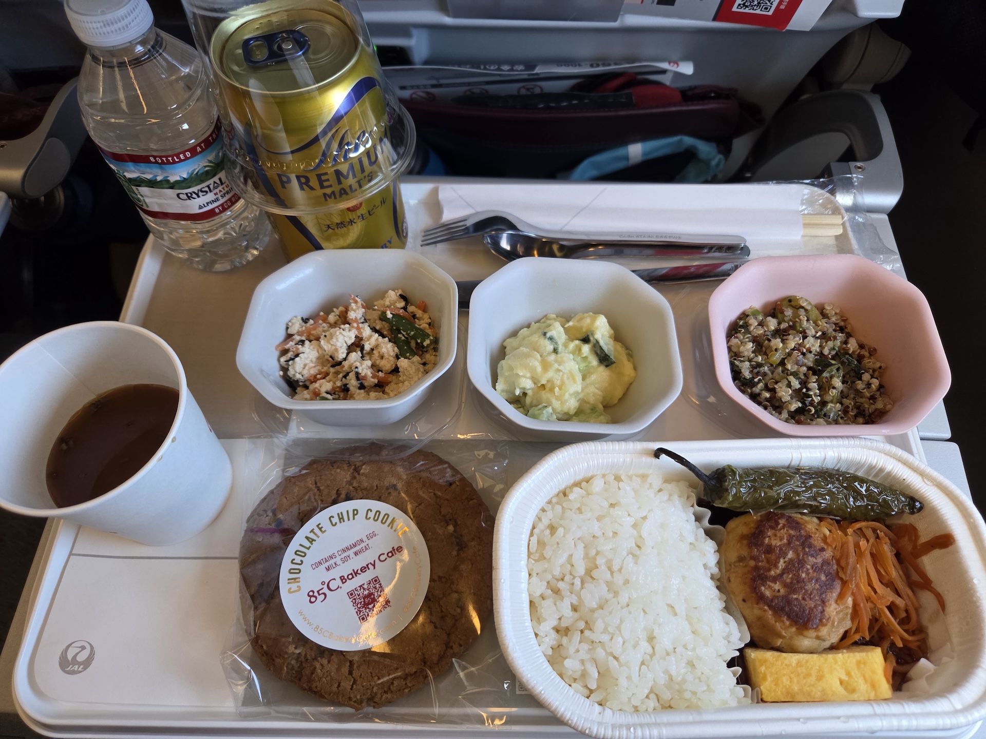 일본항공 장거리 이코노미 클래스 JL11편 이륙 후 기내식 디저트 브로콜리 샐러드의 경우 전반적으로 상큼한 느낌보다는 참기름 향이 잘 느껴지는 고소한 느낌의 샐러드였습니다. 두부 & 채소 볶음의 경우 달달하면서 고소했습니다. 와사비 풍미 감자 어묵 샐러드의 경우 와사비 향이 아주 은은하게 나면서 맵지 않으면서 상큼하고 오이의 식감이 좋은 샐러드였습니다. 메인으로는 일식인 테리야키 소스를 곁들인 치킨 미트볼을 골랐습니다. 밥에서 살짝 냉동 밥의 향이 느껴졌지만 아주 거슬리는 정도는 아니었습니다. 달걀의 경우 달달한 일본식 달걀말이 느낌이었고 당근은 살짝 오버쿡 되어서 식감이 아쉬웠습니다. 고추의 경우 생각보다 매웠지만 조금씩 베어 먹기에 좋았고 치킨 미트볼의 경우 식감은 조금 퍽퍽했지만 닭 비린맛도 나지 않았고 데리야키 소스와 함께 먹기에 좋았습니다. 종이컵에 미소 된장국도 받을 수 있었는데 은은한 맑은 된장국보다는 된장의 진하면서 쿰쿰함이 느껴지는 미소국이었습니다. 쿠키는 미국에서 유명한 대만스타일의 빵집인 85’c Bakery Cafe의 초콜릿 칩 쿠키였는데 미국 쿠키처럼 엄청 달지 않으면서도 은은하게 계피 향이 느껴져서 좋았습니다. 하겐다즈는 맛있었지만 너무 딱딱하게 냉동이 된 채로 제공되어서 녹기까지 시간이 조금 걸렸습니다. 디저트로 제공되는 커피의 경우 디카페인도 고를 수 있는데 일반 커피는 직접 내린 원두커피가 제공되지만 디카페인 커피의 경우 인스턴트커피가 제공되었습니다.
