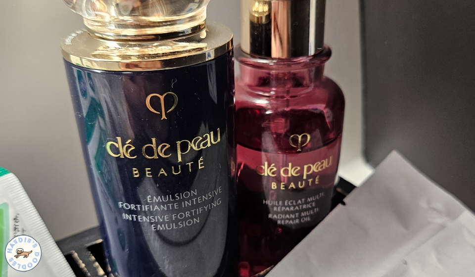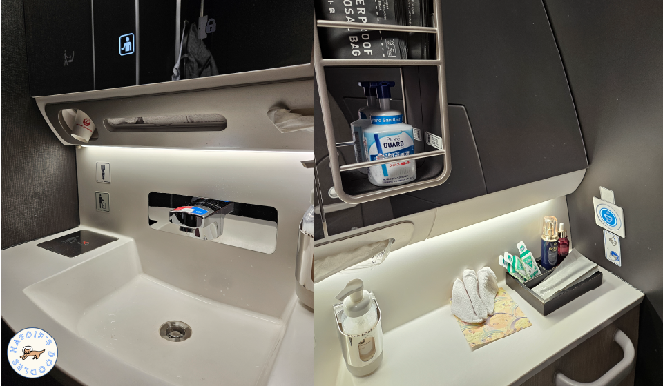 기내 어매니티로는, 비즈니스에서 조금 더 업그레이드된 어매니티 킷을 받습니다. 이게 조금 웃긴데, 진짜 살짝 업그레이드 된 느낌이에요. 예를 들면 비즈니스에서 주는 UBS케이블은 러버 재질인데 퍼스트는 패브릭 재질이라던지 ㅎㅎ. 어매니티 백과 더불어 시세이도 스킨 세트도 줍니다. 하지만 쓸 일은 없었어요. 화장실에 끌레드뽀 에멀젼과 에센스가 있기에 그걸 썼습니다. 그 외에 라운지 웨어, 슬리퍼, 단단한 베개와 부드러운 베게 등이 제공됩니다. 기본으로 제공되지 않는 건 승무원에게 요청하면 기내에 있다면 어떻게든 구해주십니다. 개인적으로 JL어매니티에서 늘 아쉬운 건 칫솔인데, 미세모 쓰는 사람에게 JL 칫솔은 좀 딱딱합니다. 화장실은 샤워부스가 있는 A388의 화장실만큼은 아니지만 그래도 꽤 여유로운 크기입니다. 일등석의 가장 좋은 점 중 하나는 화장실을 언제든지 쓸 수 있다는 것 같아요. 그리고 누가 쓴 후에는 승무원께서 바로 들어가 청소하시고 물기도 다 닦으십니다. 하지만 여전히 비행기 비데는 쓸 엄두가 안 나요...