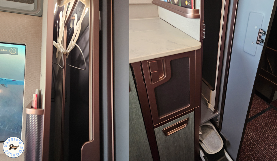 일본항공 A350-1000 일등석 후기 - A35K 일등석 좌석 3 이번에 탑승한 항공기는 일본항공이 2024년에 처음 운항을 시작한 A350-1000로 새로운 일등석이 장착되어 있었습니다. 좌석을 딱 봤을 때 들었던 생각은 ‘앞으로도 옆으로도 길다’ 였습니다. 좌우 폭은 기존 1-2-1 퍼스트 클래스 좌석에 프리미엄 이코노미 좌석 한 개를 더 붙인 정도의 넓이였고, 앞뒤 길이는 키가 5 feet 11인 제가 누워서 난리 부르스를 펴도 절대 앞 뒤의 파티션에 닿지 않는 정도였습니다. (스펙상 좌석길이가 203cm니까 당연한 말이겠지만요) 또 하나 인상적이었던 건 모니터의 크기인데요, 43인치의 4K 모니터가 자리 잡고 있습니다. ANA의 The Suite와 같은 크기의 모니터지만 1-2-1 배열이라 모니터가 한쪽 벽면을 꽉 채우고 있는 The Suite와는 다르게 모니터 주위에 어느정도의 공간이 자리잡고 있습니다. 개인적으로는 이게 조금 더 여유로워 보이고 좋았습니다. 오토만 아래에는 개인 스토리지가 있는데 여기에는 캐리온 러기지가 2개 정도 들어갈 정도로 여유로운 크기였고, 도어 프레임에는 대한항공 코스모 스위트 2.0처럼 옷장과 신발을 넣을 수 있는 공간이 마련되어 있습니다. 전반적으로 공간도 넓고 수납공간도 많은, 좌석으로만 따져도 SQ, EY의 A388 퍼스트 까지는 아니더라도 EK의 게임 체인저와 충분히 경쟁할만한, 싱글데커에서는 가장 좋은 일등석이라고 해도 부족함이 없을 정도입니다. 저는 복도를 마주하고 있는 좌석이 비어서 가운데 좌석에 침대를 만들어 주셨는데 아마도 1-1-1 배열의 화룡점정은 이 침대가 아닐까 싶습니다. 물론 조금 더 생긴 (프리미엄 이코노미 좌석 하나만큼의) 공간에 매트리스가 깔리지는 앉습니다만, 누워서도 뭔가 관에 갇힌(적은 없지만) 느낌이 아닌 작은 방에 들어온 것처럼 느껴지는 공간감이 최고의 장점인 것 같습니다. 물론 가운데 좌석이 아닌 창가 좌석도 오버헤드빈이 없기에 그 공간감을 그대로 느낄 수 있고요. 비즈니스가 눕는다는 그 사실에 초점이 맞춰져 있다면 퍼스트는 누워서 뒤척여도 공간이 남는 게 다른 점인 것 같습니다. 물론 누웠을 때 침대를 접지 않고도 옆의 작은 엑스트라 좌석에 앉을 수 있고 이 엑스트라 좌석만 따로 좌석 각도 조절도 가능하기에 다른 좌석에 침대를 만들어 주지 않아도 무리가 없을 것 같고요. 다만 침대를 만든 상태에서 엑스트라 좌석을 이용할 때는 음식을 먹기에는 테이블 공간이 마땅치 않은 건 단점입니다. 이럴 때는 어떻게 해야 할지… 잘 모르겠네요.