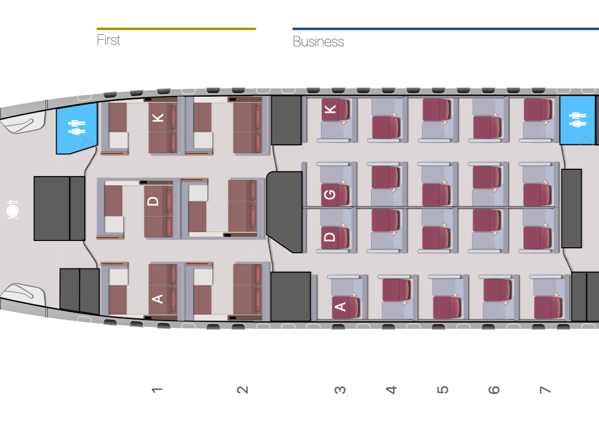 일본항공 A350-1000 일등석 좌석배치도, image courtesy of aeroLOPA 1K 좌석의 경우 원래는 좌석을 블락시켜서 좌석지정을 할 수 없는데요, 만약 좌석이 선점되지 않은 상황이라면 대략 출발일 기준 2주~1주 사이에 좌석이 지정가능한 상태로 바뀝니다. 아메리칸 항공 마일리지로 일본항공을 발권하는 경우 일본항공 홈페이지에서 좌석지정이 가능합니다. 일본항공 A350-1000 일등석의 경우 좌석배열이 1-1-1로 한 열에 3개의 좌석이 들어가는데요, 이때 창가석인 1A와 중간석인 1D가 입구를 마주 보고 있고, 다른 창가석인 1K가 혼자 복도를 사용하고 있고, 2열의 경우 2A가 혼자 복도를 사용하고, 2D와 2K가 복도를 놓고 입구를 마주 보고 있습니다. 즉 1A, 1D, 2A석이 비행기 진행방향 기준 왼쪽 복도를 사용하고, 1K, 2D, 2K가 오른쪽 복도를 사용합니다. 대부분 일등석의 경우 건너편 좌석이 점유되지 않은 상황이라면 해당 좌석을 침대로 바꿔 쓸 수 있게 해 줍니다. 따라서 1D가 비어있다면 1A를, 2D가 비어있는 상황이라면 2K를 지정하는 걸 추천드립니다.