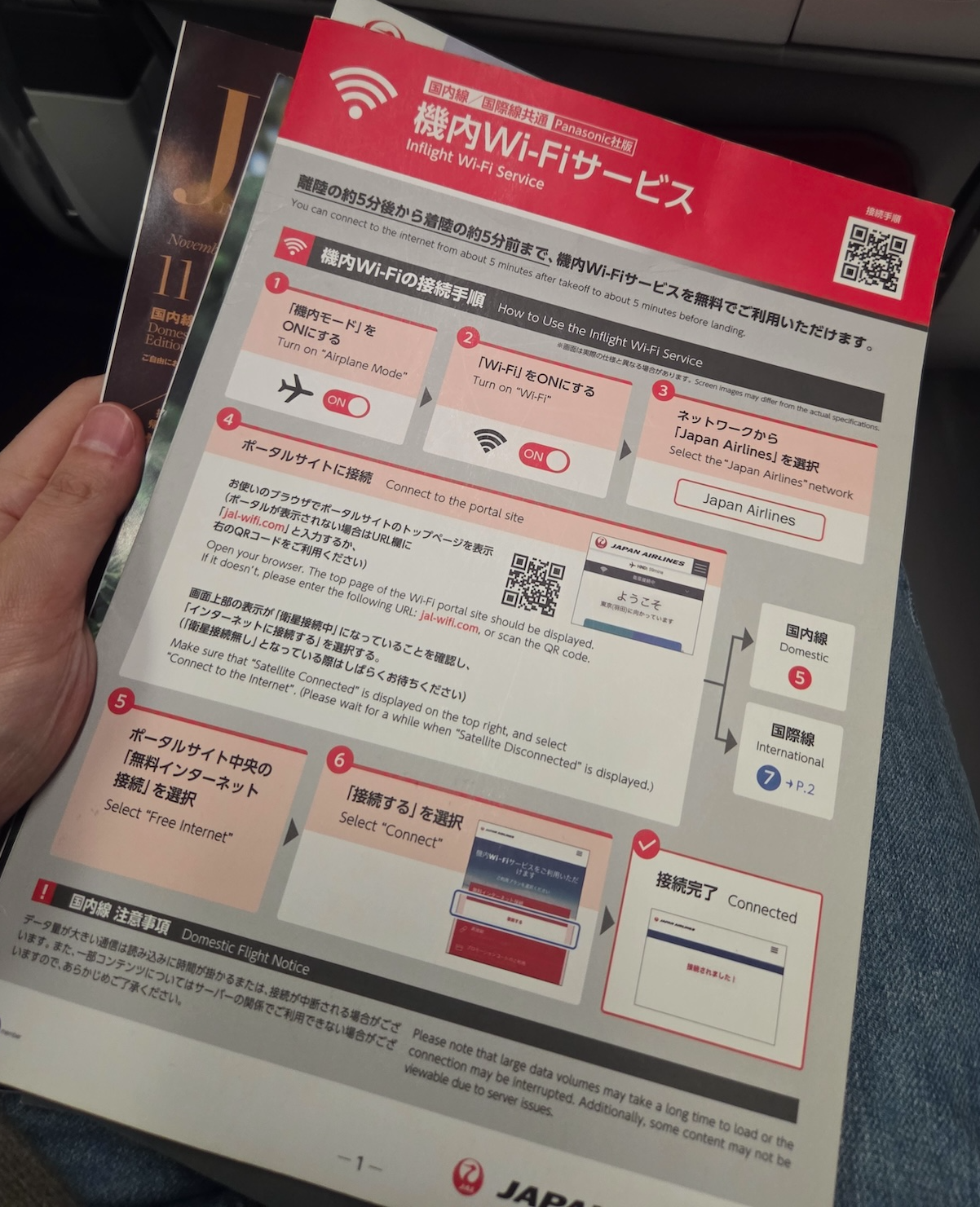 일본항공 A350-900 와이파이 접속 과정 하지만 기내 엔터테인먼트 시스템이 크게 상관이 없는 더 큰 이유가 있는데 그건 바로 일본항공에서는 국내선 노선에서 와이파이를 무료로 이용할 수 있게 해주기 때문입니다. 국제선과 달리 고도 제한 없이 와이파이를 이용할 수 있어 지상에서 이륙 전, 휴대폰을 비행기 모드로 전환한 직후부터 와이파이를 연결해 사용할 수 있고, 착륙 후에 비행기에서 내릴 때까지 사용할 수 있었습니다. 또한 도쿄 하네다 공항에서 삿포로로 향하는 항로가 일본 열도 위를 따라 가기 때문인지 와이파이 다운로드 속도도 4Mbps 정도로 나쁘지 않았습니다.