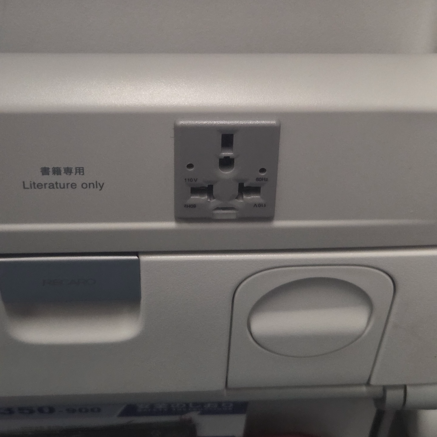 일본항공 A350-900 이코노미 클래스 기내 책자 테이블 위에는 전원 플러그와 기내 책자 수납함이 있습니다. 전원 플러그의 경우 플러그 타입과 상관없이 모든 플러그를 꽂을 수 있는 유니버셜 타입이지만 실제 들어오는 전압은 110v로 플러그를 이용하기 전 반드시 110v사용이 가능한지 확인하시는 걸 추천합니다. 일반적으로 220v용을 110v에 꽂으면 당장 고장이 나지는 않지만, 충전기에 좋지 않은 영향을 주니까요. 모바일 기기 충전기의 경우 요즘에는 대부분 모든 전압에서 사용할 수 있는 프리볼트 형태로 나옵니다. 충전기에 정격 전압이 100v ~ 250v라고 쓰여 있다면 110v, 220v 상관없이 사용이 가능한 충전기니까 걱정 없이 이용하셔도 됩니다. 책자 수납함에는 기내 판매 책자와 기내지가 들어있었습니다. 국내선 노선답게 기내지는 오로지 일본어로만 쓰여 있었고, 기내 판매 책자도 국제선용 면세 판매 책자가 아닌, 국내선용 판매 책자가 비치되어 있었습니다.