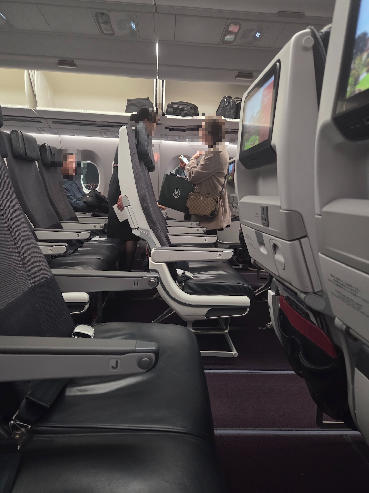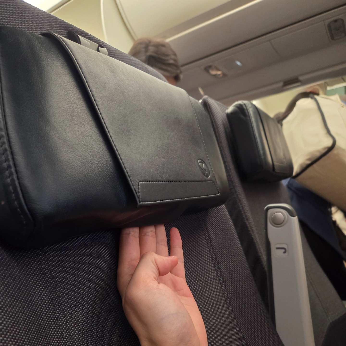 일본항공 A350-900 이코노미 클래스 좌석 제가 이번 비행에서 앉은 좌석은 28K로 클래스 J캐빈 바로 뒷 부분, 벌크헤드 좌석 다음에 위치한 좌석입니다. 전반적으로 붉은 계열이 사용된 A350-900의 퍼스트 클래스, 클래스 J좌석과는 달리 이코노미 클래스 좌석에는 어두운 무채색 계열의 색이 많이 사용되어 좋게 말하면 차분하고, 나쁘게 말하면 조금은 심심할 수 있는 느낌이 듭니다. 일본항공 A350-900의 이코노미 클래스 좌석은 일본항공 A350-1000 이코노미 클래스 좌석과 동일한 레카로 CL3710 좌석이 사용되어서 전반적인 느낌은 비슷합니다. 좌석의 엉덩이 부분은 가죽으로 되어 있어 청소가 용이하게 되어 있지만, 등받이 부분은 천으로 되어서 공기가 잘 통하는 형태였고요, 가죽으로 된 헤드레스트는 6-way로 조정이 가능해 1~3시간 내외의 국내선에서 충분히 편하게 이동할 수 있게 도와주었습니다.