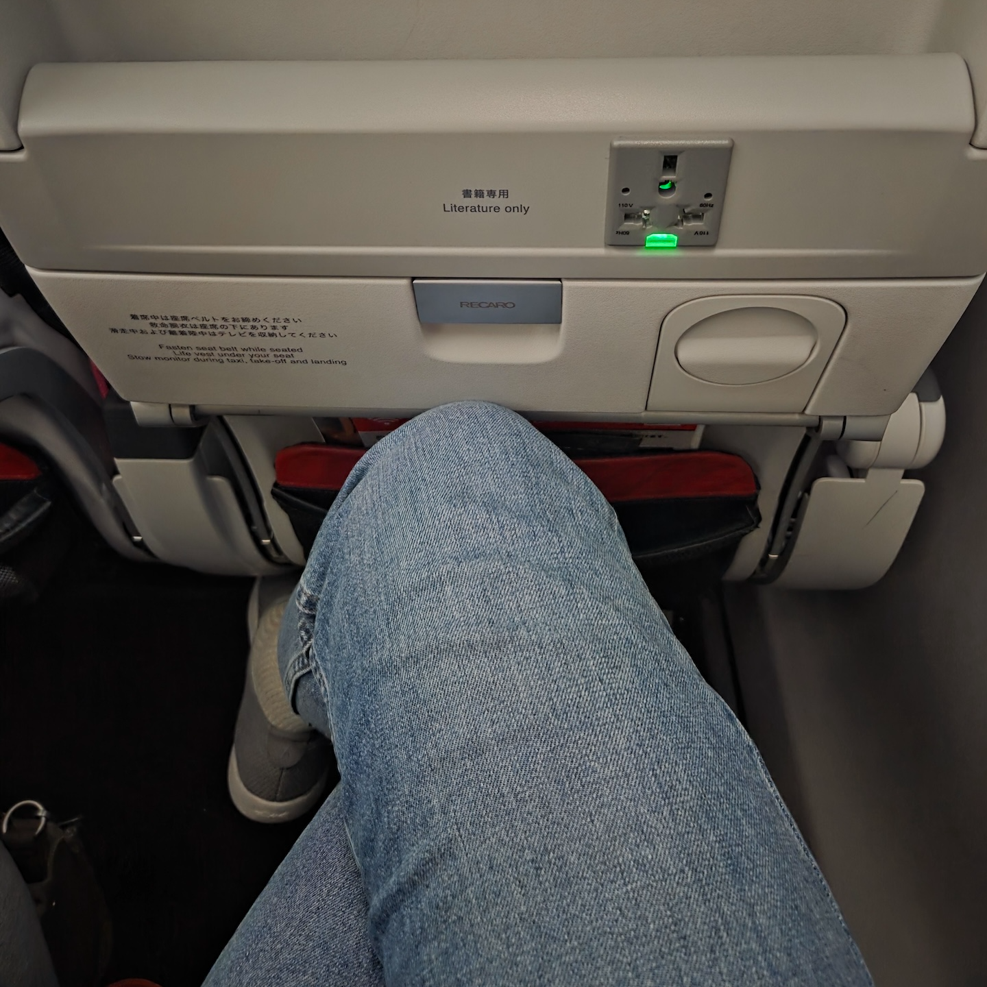 일본항공의 국내선 전용 A350-900의 이코노미 클래스는 3-3-3 배열로 구성되어 있습니다. 따라서 시트 넓이는 18인치로, 일본항공의 국제선 전용 A350-1000과 동일합니다. 하지만 A350-900의 시트 간 간격은 31인치로 A350-1000보다 2인치 이상 좁습니다. 하지만 일본항공의 국내선 전용 A350-900 항공기는 최대 3시간 이내의 국내선에만 투입되기 때문에 딱히 불편하다고 느껴지지는 않는 정도였습니다. 31인치의 좌석 간격은 일본이나 한국의 풀 서비스 항공사들 사이에서나 좁은 간격이지, 실제로 세계의 수많은 항공사들의 장거리 항공기 이코노미 클래스 좌석 간격이 31인치 정도이기도 하고요.