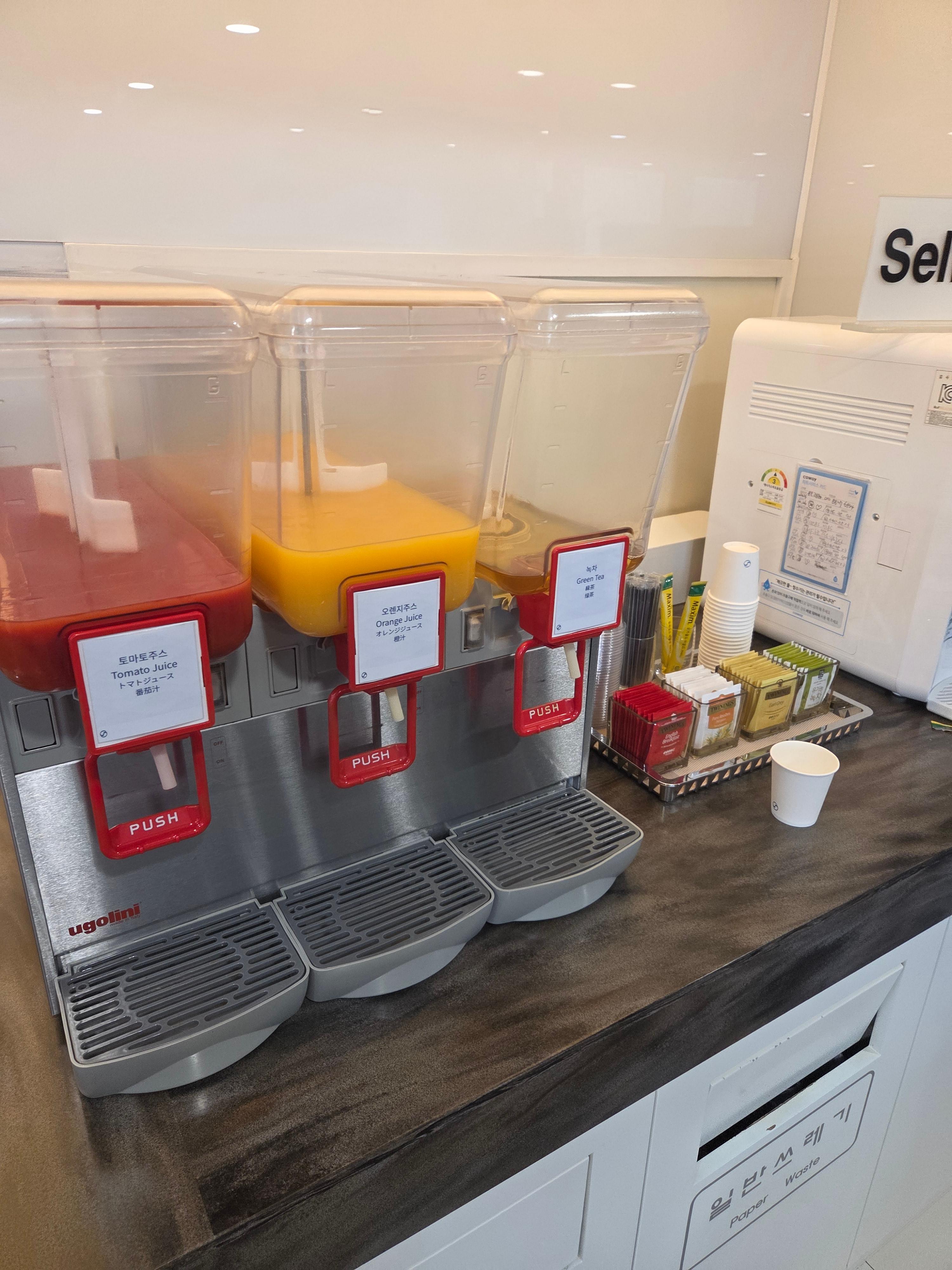 제주공항 대한항공 라운지 식음료 제주공항 대한항공 라운지도 다른 대한항공 국내선 라운지와 거의 비슷한 식음료를 제공합니다. 스낵의 경우 초코하임, 머핀, 카스타드, 마가렛트, 버터와플 등 간단한 공산품 과자류가 제공됩니다. 커피는 전자동 에스프레소 머신에서 에스프레소 베이스 음료를 마실 수 있고, 시럽도 준비되어 있습니다. 차는 Twinings 브랜드의 차로 얼그레이와 잉글리시 블랙퍼스트 티가 준비되어 있었으며 녹차 티백도 있었습니다. 시원한 음료로는 토마토 주스, 오렌지 주스, 시원한 녹차, 콜라, 제로 콜라, 식혜가 준비되어 있었고 컵생수 외에 정수기도 설치되어 있었습니다.