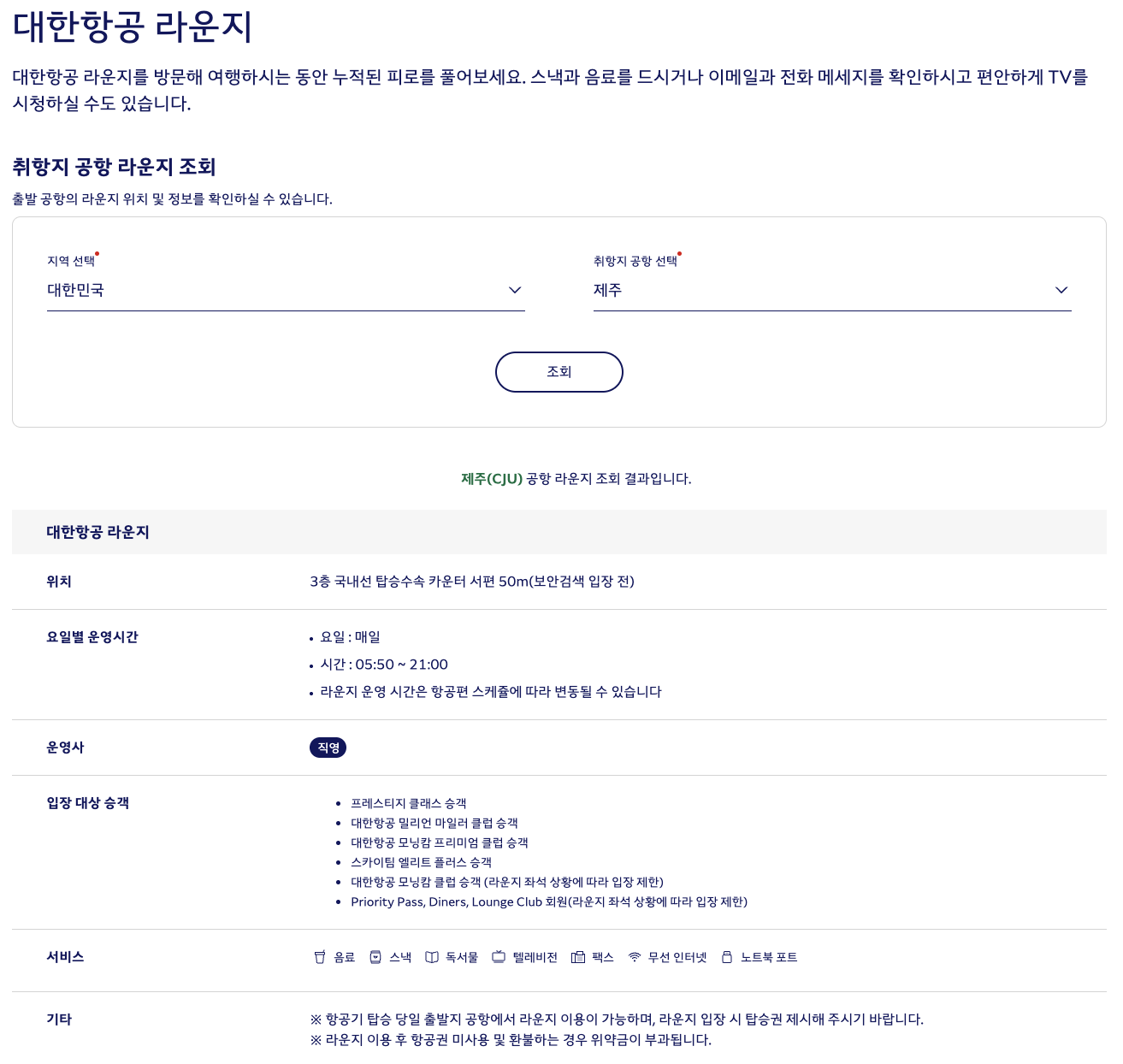 제주공항 대한항공 라운지는 대한항공이 운영하는 직영 라운지 중에서 유일하게 국내선 승객과 국제선 승객이 모두 이용할 수 있는 라운지 입니다. 또한 제주공항 대한항공 라운지는 김해공항 국내선 라운지와 더불어서 대한항공 직영 라운지 중 유이하게 보안 검색대 밖인 랜드 사이드에 위치하고 있는 라운지이기도 합니다. 제주공항 대한항공 라운지는 주 이용고객이 국내선 고객인만큼 국내선 라운지에 맞는 간소화된 서비스를 제공하고 있습니다.4. 제주공항 대한항공 라운지 입장조건