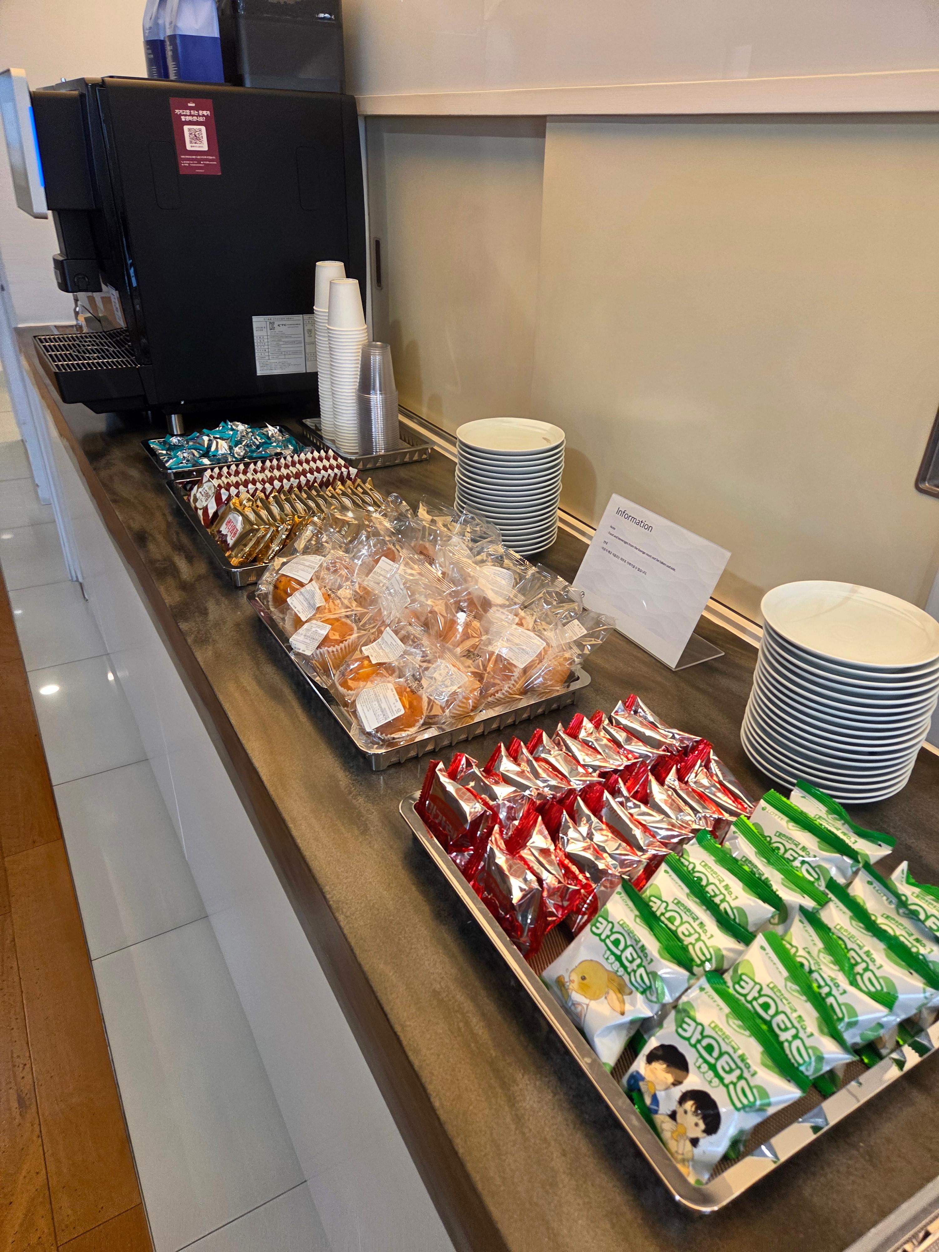 제주공항 대한항공 라운지 식음료 제주공항 대한항공 라운지도 다른 대한항공 국내선 라운지와 거의 비슷한 식음료를 제공합니다. 스낵의 경우 초코하임, 머핀, 카스타드, 마가렛트, 버터와플 등 간단한 공산품 과자류가 제공됩니다. 커피는 전자동 에스프레소 머신에서 에스프레소 베이스 음료를 마실 수 있고, 시럽도 준비되어 있습니다. 차는 Twinings 브랜드의 차로 얼그레이와 잉글리시 블랙퍼스트 티가 준비되어 있었으며 녹차 티백도 있었습니다. 시원한 음료로는 토마토 주스, 오렌지 주스, 시원한 녹차, 콜라, 제로 콜라, 식혜가 준비되어 있었고 컵생수 외에 정수기도 설치되어 있었습니다.