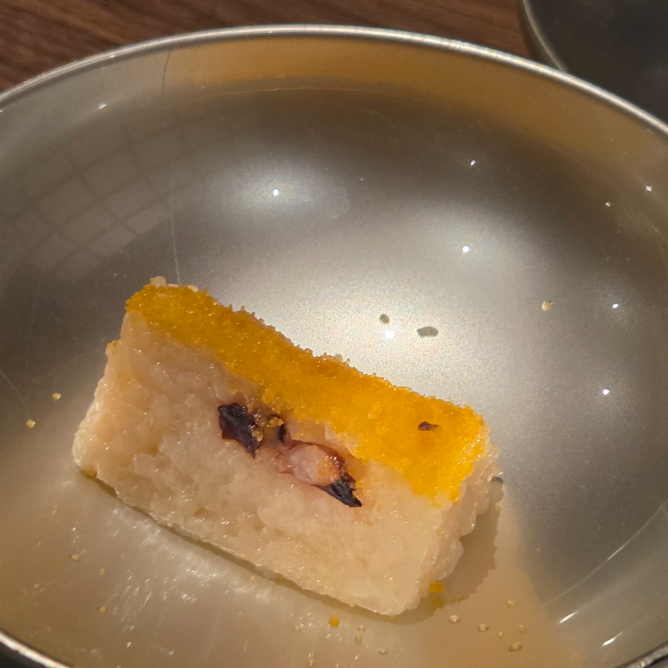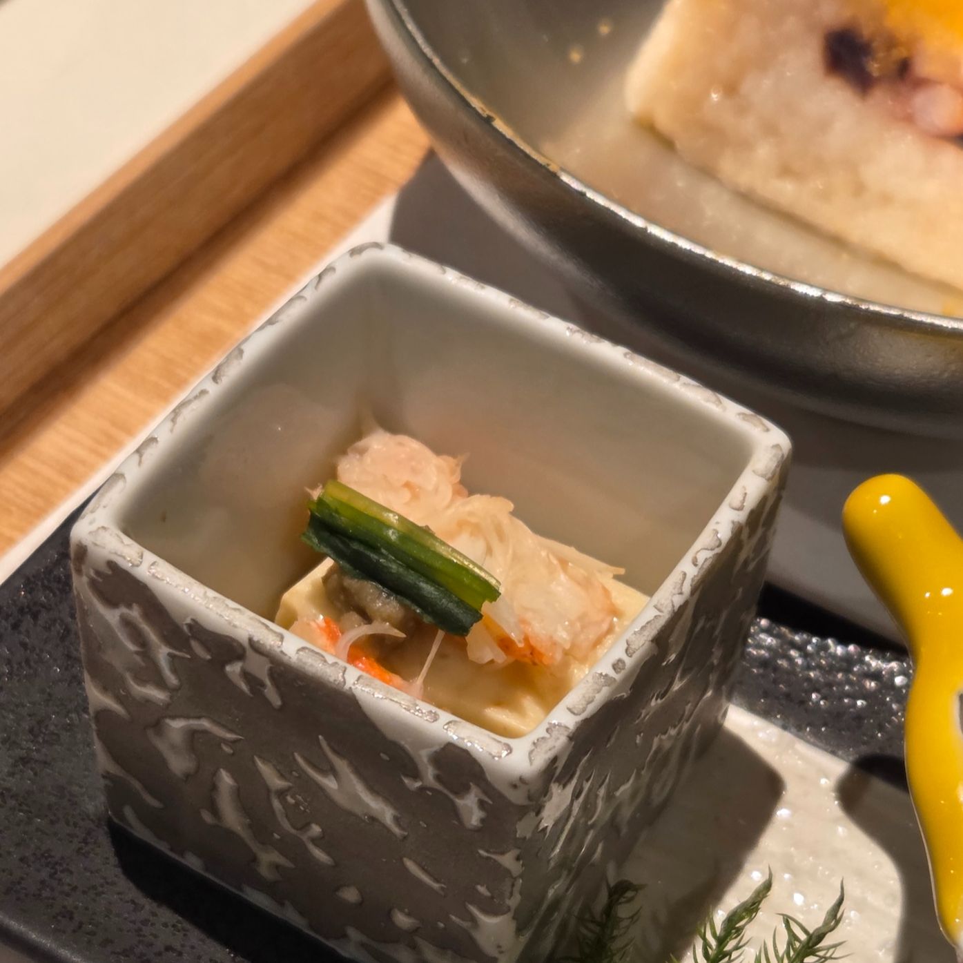 가장 먼저 나오는 식전주로는 홋카이도 배 주스를 곁들인 무알콜 칵테일이 나왔습니다. 술을 못 드시는 분들도 계실 수 있기 때문에 식전주로 무알콜 칵테일이 나오는 건 참 좋은 선택이라고 생각했고요, 배의 향이 너무 향긋하게 느껴지는 좋은 식전주였습니다. 전채요리로는 문어밥(문어 부드러운 조림), 게살과 내장을 곁들인 두부(게장두부), 단식초에 절인 생선(생선 난반즈케), 호두 드레싱을 곁들인 감자, 구운 이리를 곁들인 차완무시가 나왔습니다. 가장 먼저 문어밥은 찹쌀밥에 문어살이 들어가 있고 한 면을 생선알로 마무리한 형태였습니다. 문어 살의 양이 많아서인지 문어 살의 텍스쳐는 거의 느껴지지 않아 찹쌀밥의 식감만 느껴졌으나, 대신 문어의 향은 진하게 느껴졌고요, 비린 음식을 드시지 못하시는 분들에겐 비리게 느껴질 수 있을 정도의 향이었습니다. 게살과 내장을 곁들인 두부는 게 내장의 고소한 맛과 진한 다시 국물이 부드러운 두부와 쫄깃한 게살과 달 어울리는 좋은 전채요리였고요. 단식초에 절인 생선은 고소한 생선 살의 맛과 상큼한 식초 소스가 잘 어울렸으나 생선살의 뼈가 너무 강하게 느껴져 아쉬웠습니다. 호두소스에 곁들인 감자의 경우 전반적으로 조금 뻑뻑한 데다가 호두와 감자가 맛과 텍스처에서 겹치는 느낌이 있어서 굳이 전채요리 한자리를 차지했어야 하는가 싶은 요리였고요. 마지막의 차완무시는 이리를 불에 그을려 스치는 불향이 나면서도 고소한 이리의 맛과 부드러운 계란에 살짝 곁들여 있는 유자의 향이 너무 향긋하게 느껴지는 맛있는 차완무시였습니다.