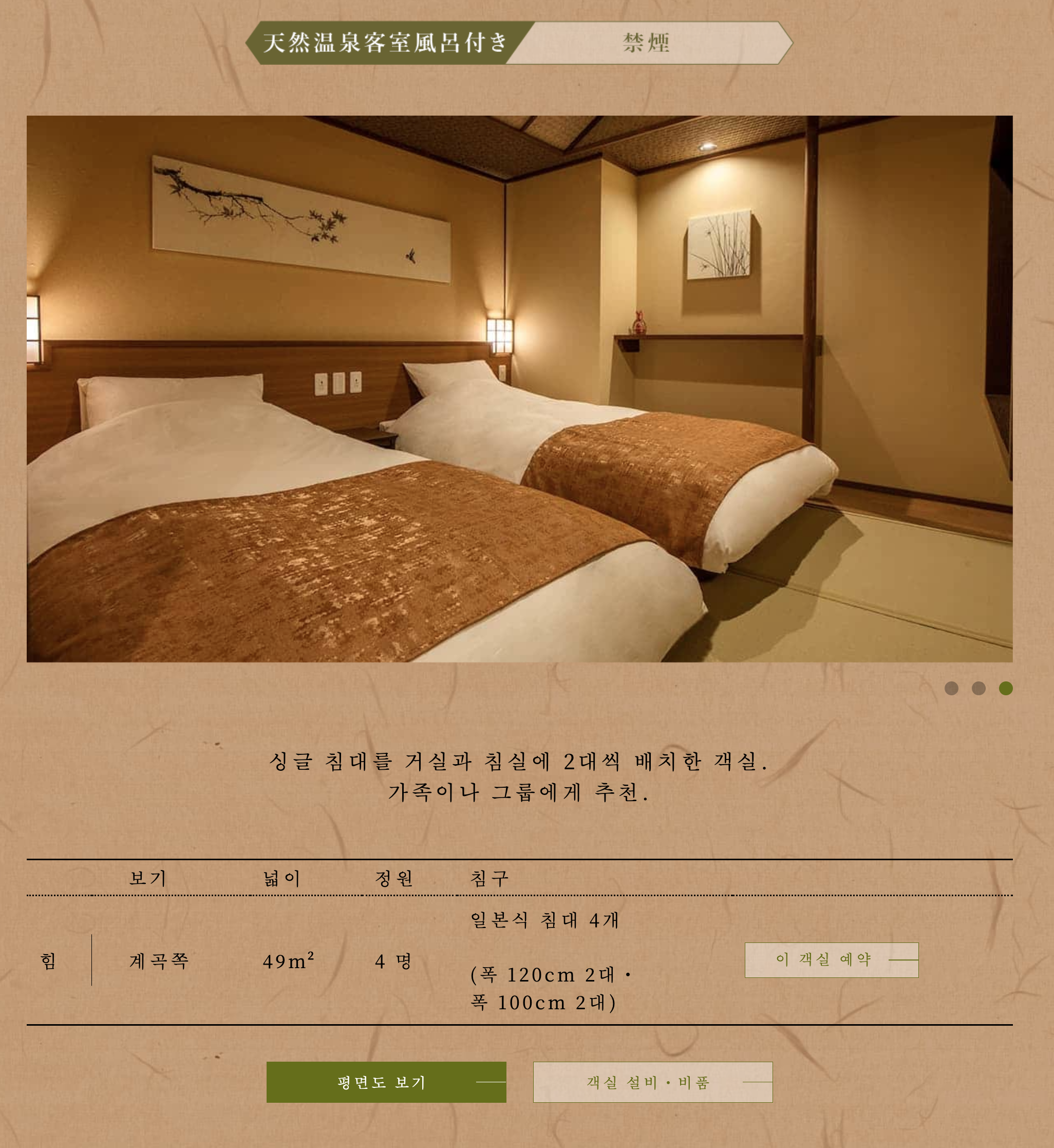트윈룸 이외에 침대 2개와 데이베드 1개가 들어가서 3명 투숙이 가능한 트리플(Triple) 룸, 침대 4개가 들어가 4명 투숙이 가능한 포스(Fourth) 룸, 침대 4개와 깔고 잘 수 있는 이불+요 세트가 2개가 제공되어 총 6명이 투숙할 수 있는 스페셜 룸이 있습니다. 이 방들은 모두 산 전망을 가지고 있으며 특히 스페셜 룸은 방 2개가 붙어있는 형식이라 화장실, 개인 욕조, 세면대 등이 각각 2개씩 설치되어 있습니다. 가격은 공식 홈페이지에서 저녁식사와 아침식사가 포함된 표준 플랜 최저가 기준 트리플 룸 성인 3인 투숙 시 1인당 약 27,000엔 (3인 기준 81,000엔), 포스 룸 성인 4인 투숙 시 1인당 약 24,500엔 (4인 기준 98,000엔), 스페셜 룸 성인 6인 투숙 시 1인당 약 29,000엔 (6인 기준 174,000엔) 정도로 1인당 투숙 가격은 오히려 트윈룸들에 비해 저렴한 경우도 있으니 3명 이상이 투숙하시는 경우 이를 잘 고려하시어 예약하시면 될 것 같습니다.