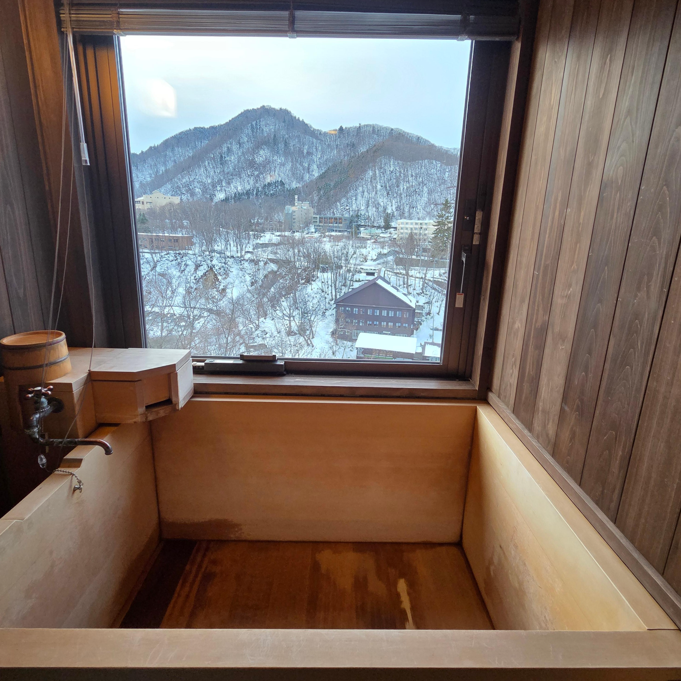 복도 가장 안쪽에는 개인탕이 있었습니다. 개인탕은 나무로 짜인 욕조와 샤워기가 설치되어 있었고 계곡방향을 바라보는 방이었기에 창 밖으로는 눈 덮인 산이 보였습니다. 나무 욕조는 크지는 않았지만 2명 정도는 들어갈 수 있을 정도의 크기였습니다. 욕조에 물은 받기 위해서는 세면대가 설치되어 있는 곳에 자동으로 물을 채워주는 버튼을 누르면 되었는데요, 어느 정도 물이 차면 자동으로 물이 멈추기 때문에 편리했습니다. 욕조가 차는 데는 대략 15분 정도가 걸렸습니다. 욕조 바로 옆에도 수동으로 물을 채울 수 있는 버튼이 있어서 필요한 경우 욕조에 물을 더 채울 수도 있었고요. 참고로 바로 나오는 온천수의 온도는 섭씨 50도 가까이 되기 때문에 온천에 물을 받고 조금 시간이 지난 후에 들어가는 게 온도가 더 좋을 수 있습니다.