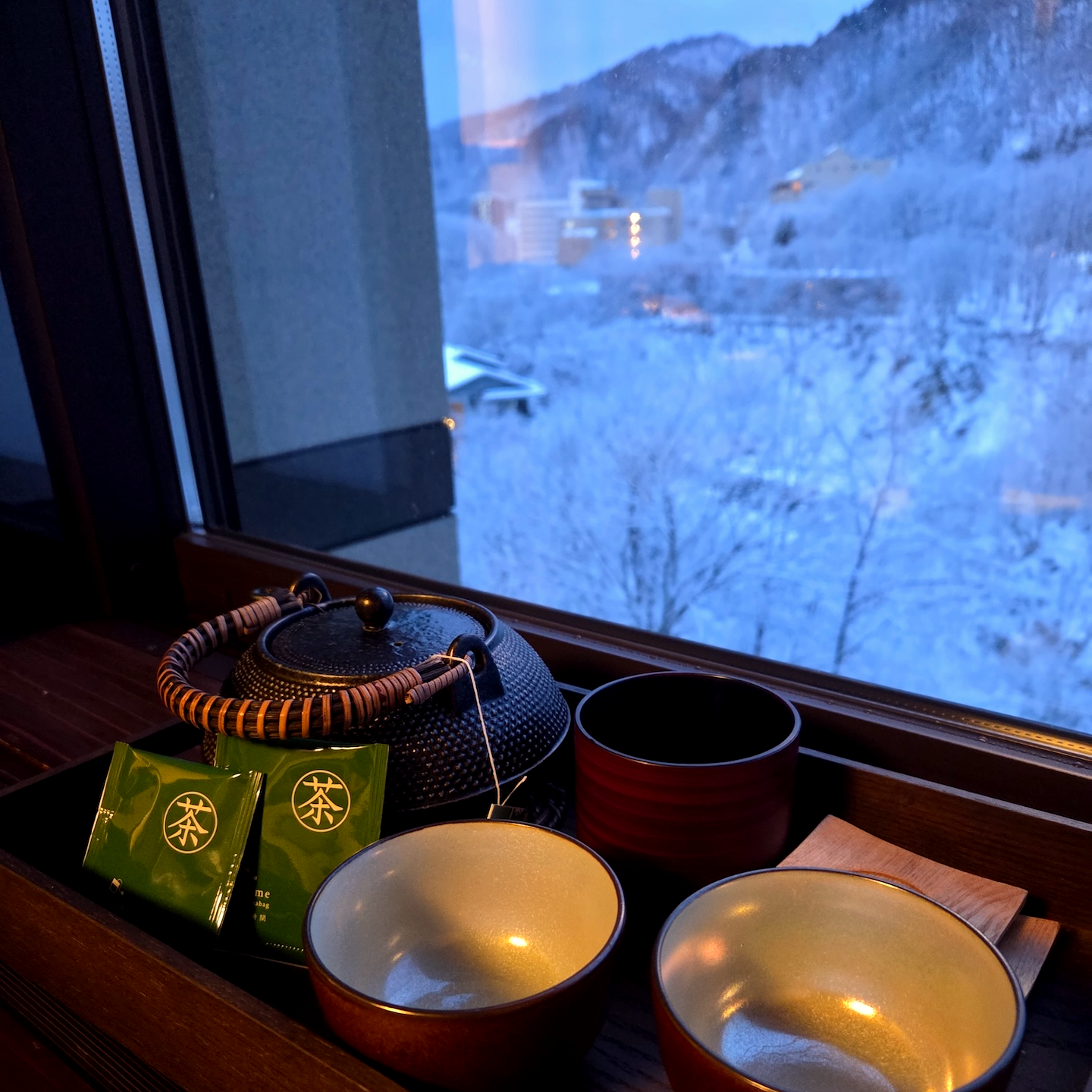 복도 오른쪽의 문으로 들어가면 메인 거실이 나옵니다. 거실에는 넓은 창과 창 밖을 조망하면서 커피나 티를 마실 수 있는 라운지체어 2개와 작은 커피테이블이 있습니다. 마찬가지로 계곡 방향을 바라보는 조망이기 때문에 창 밖으로 설산이 보이고 라운지체어에 앉으면 계곡과 더불어 온천 마을이 한눈에 보이는 평화로운 풍경을 눈에 담을 수 있습니다. 개인적으로는 이른 아침에 커피를 한잔 하면서 바라보는 고요한 풍경이 너무 마음에 들었습니다.