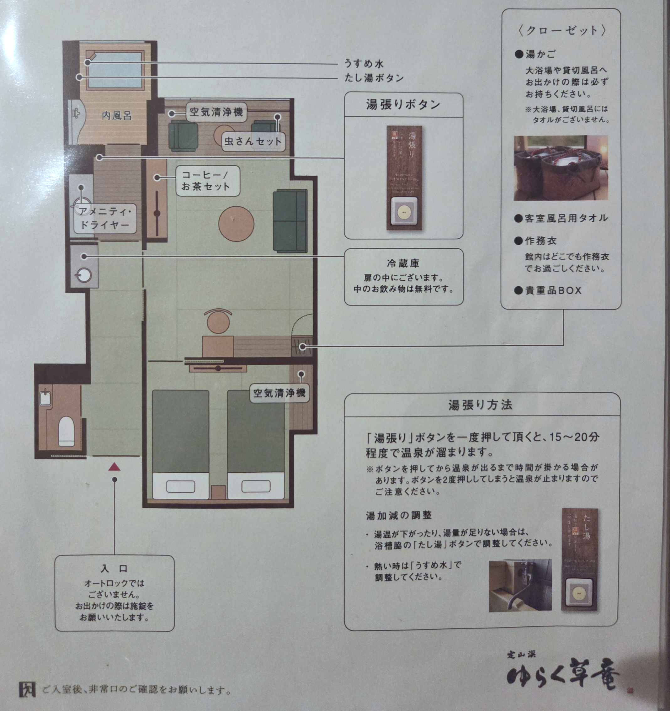 체크인의 경우 특별한 특이점 없이 무난하게 진행되었습니다. 외국인(대부분 한국인과 중국인)도 많이 방문하는 료칸답게 영어로 된 료칸 설명서나 안내문도 있어서 일본어를 몰라도 료칸을 이용하는 데는 크게 문제가 없었습니다. 다만, 료칸 직원들의 경우 영어가 유창한 편은 아니라서 본격적으로 직원들과 영어로 의사소통을 하는 건 쉽지 않았다는 점도 참고하시면 좋을 것 같습니다.