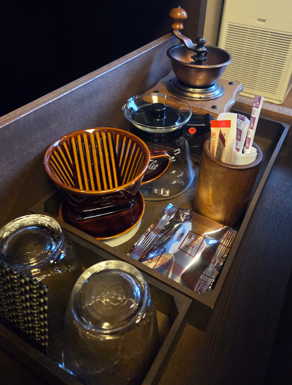 기본적인 물은 500ml 물 2병이 제공되는데요, 호텔 내의 여러 곳에서 쉽게 정수기를 찾을 수 있기 때문에 병을 버리지 마시고 필요할 때 생수병을 채워서 이용하시면 편리합니다. 룸 안에는 다도세트와 녹차가 준비되어 있습니다. 잎차가 아니라는 점이 아쉽지만 편리하면서도 분위기를 내면서 녹차를 마실 수 있어 좋았고요, 커피의 경우 커피 원두 홀빈과 그라인더, 핸드 드립 세트가 준비되어 있어 아침에 방 안을 기분 좋은 원두향으로 가득 채울 수도 있습니다. 아무래도 캡슐 커피 머신이 편리하기는 하지만 방에서 보내는 시간이 많은 료칸인 만큼 직접 천천히 원두를 갈고 커피를 내리는 경험도 나쁘지 않아 보입니다.