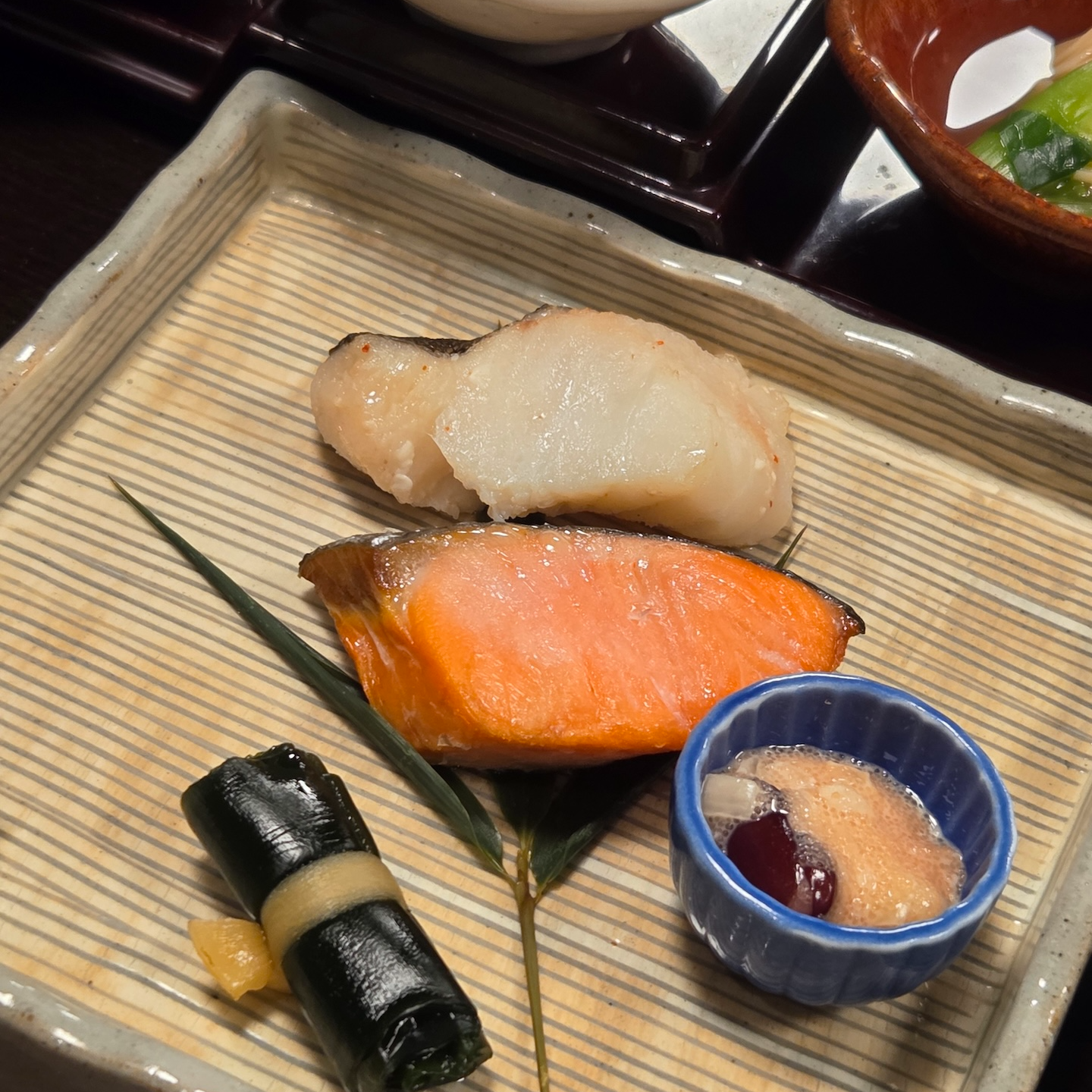 생선구이로는 구운 대구와 연어가 나왔습니다. 연어의 경우 맛은 있었으나 오버쿡 되어서 살이 퍽퍽한 느낌이 있었고 대구 또한 오버쿡이 되긴 했으나 한입에 꽉 차는 대구살을 먹는 만족감이 좋았습니다. 함께 나온 다시마 말이는 비린맛 없이 다시마의 감칠맛이 잘 느껴져서 좋았고 함께 나온 명란과 간 무도 곁들이기 좋았습니다. 일본식 오믈렛의 경우 전반적으로 부드럽고 달달해서 누구나 좋아할 맛이었고 소스는 다시 육수 소스라 감칠맛을 더해주었습니다. 일본식 오믈렛 안에는 유자후추가 들어가 있었다는데 아주 약하게 느껴지는 유자 느낌과 더불어 살짝 올라오는 후추의 킥이 잘 어울렸습니다.