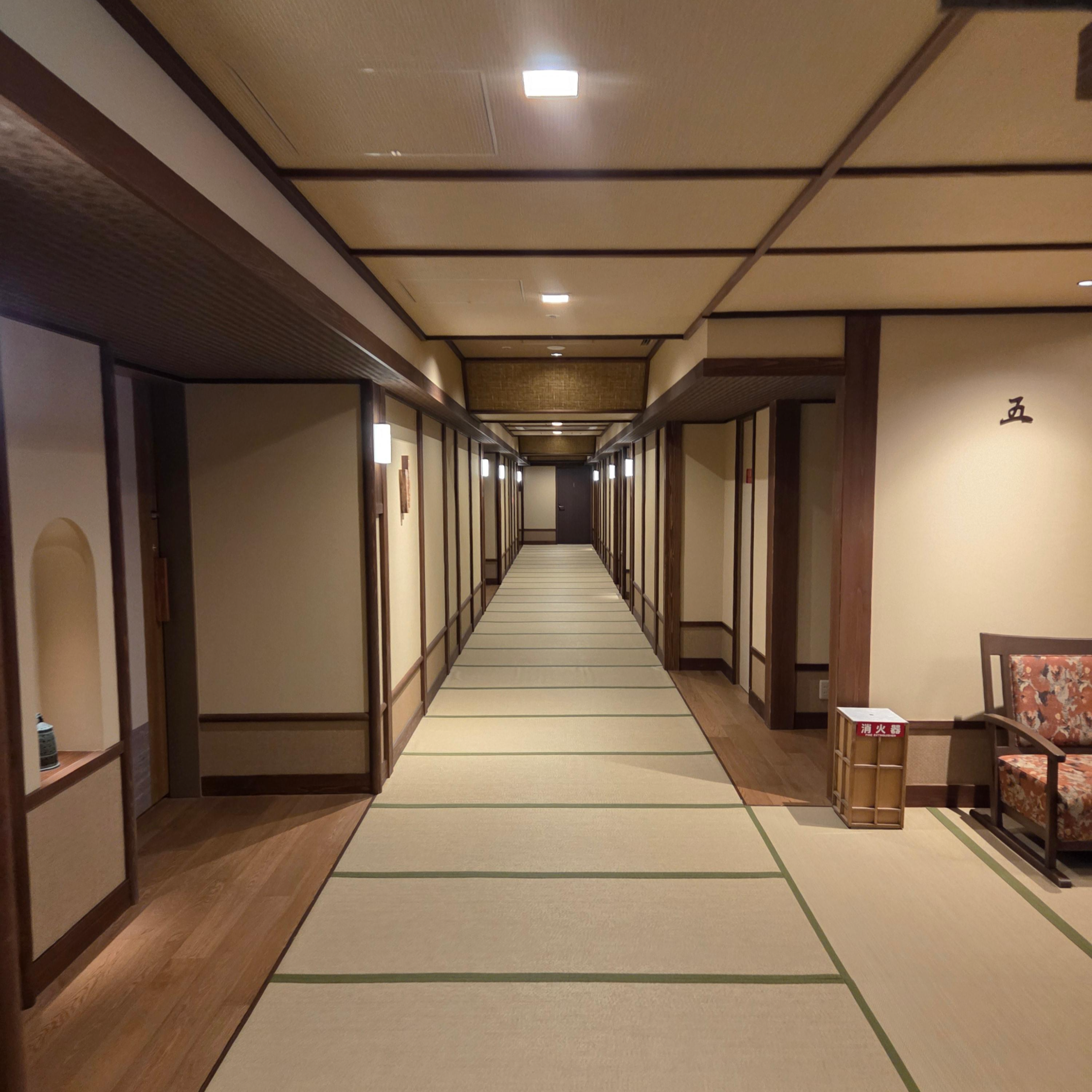 현대식 료칸인 만큼 조잔케이 유라쿠 소안은 7층까리 건물을 사용하고 있습니다. 이 중에서 2층부터 7층까지 게스트 룸으로 사용하고 있고 한 층에 대략 17개의 객실이 자리하고 있습니다. 건물 내부는 모두 다다미가 깔려 있어 외부 신발을 이용하실 수는 없으며 관내복과 함께 제공되는 슬리퍼를 이용하시면 되고, 저를 포함해 일부 투숙객들은 그냥 양말을 신고 돌아다니기도 했습니다. 현대식 건물임에도 불구하고 객실로 향하는 복도와 객실 입구 모두 전통성과 자연미, 절제된 아름다움이 돋보이는 일본 료칸 특유의 인테리어가 편안한 분위기를 연출했고, 객실까지 가는 복도 곳곳에 놓여있는 장식들도 인상적이었습니다.