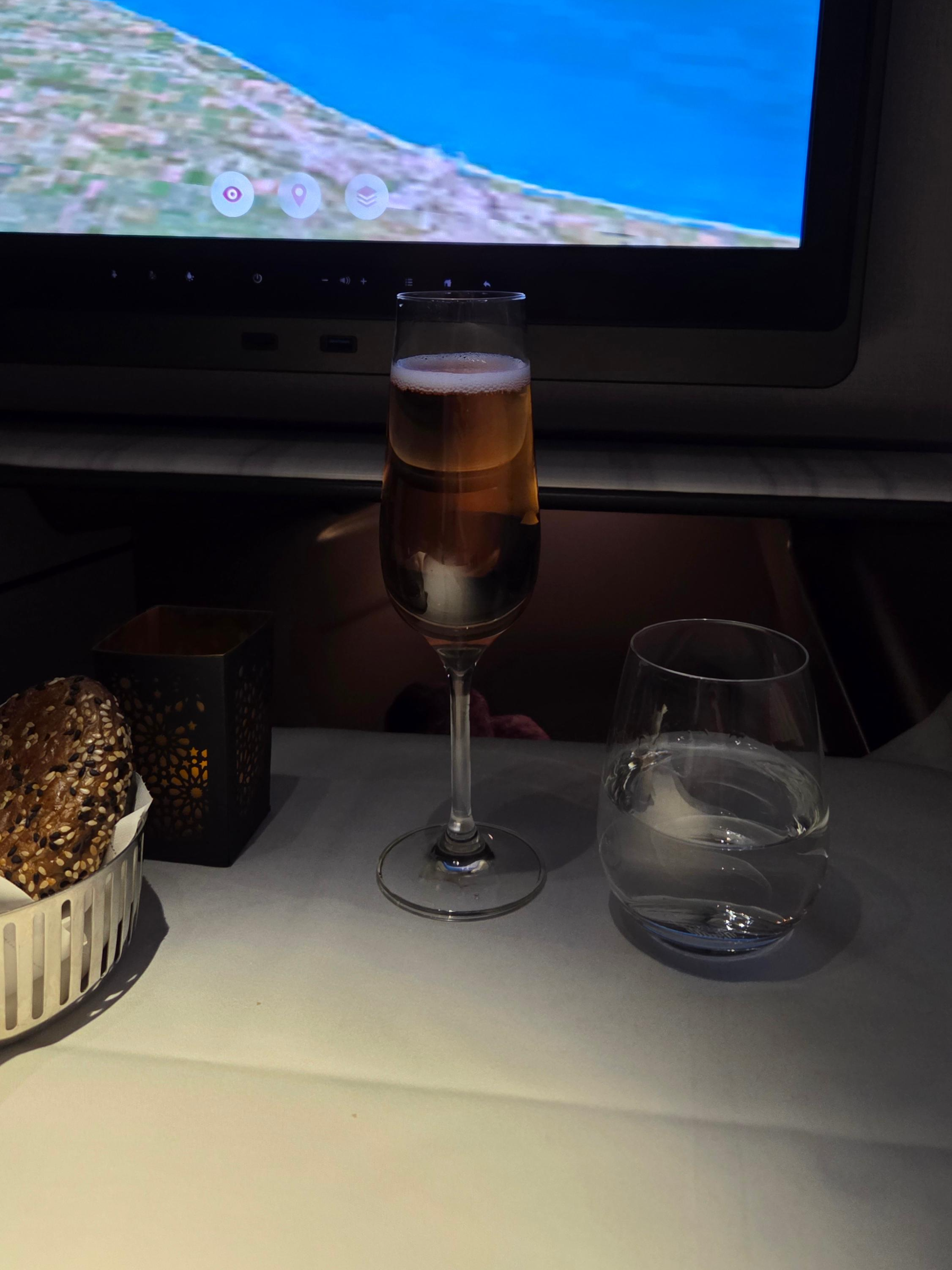 카타르 항공 장거리 비즈니스 클래스 기내식 식전빵과 무알코올 샴페인 쏘 제니
