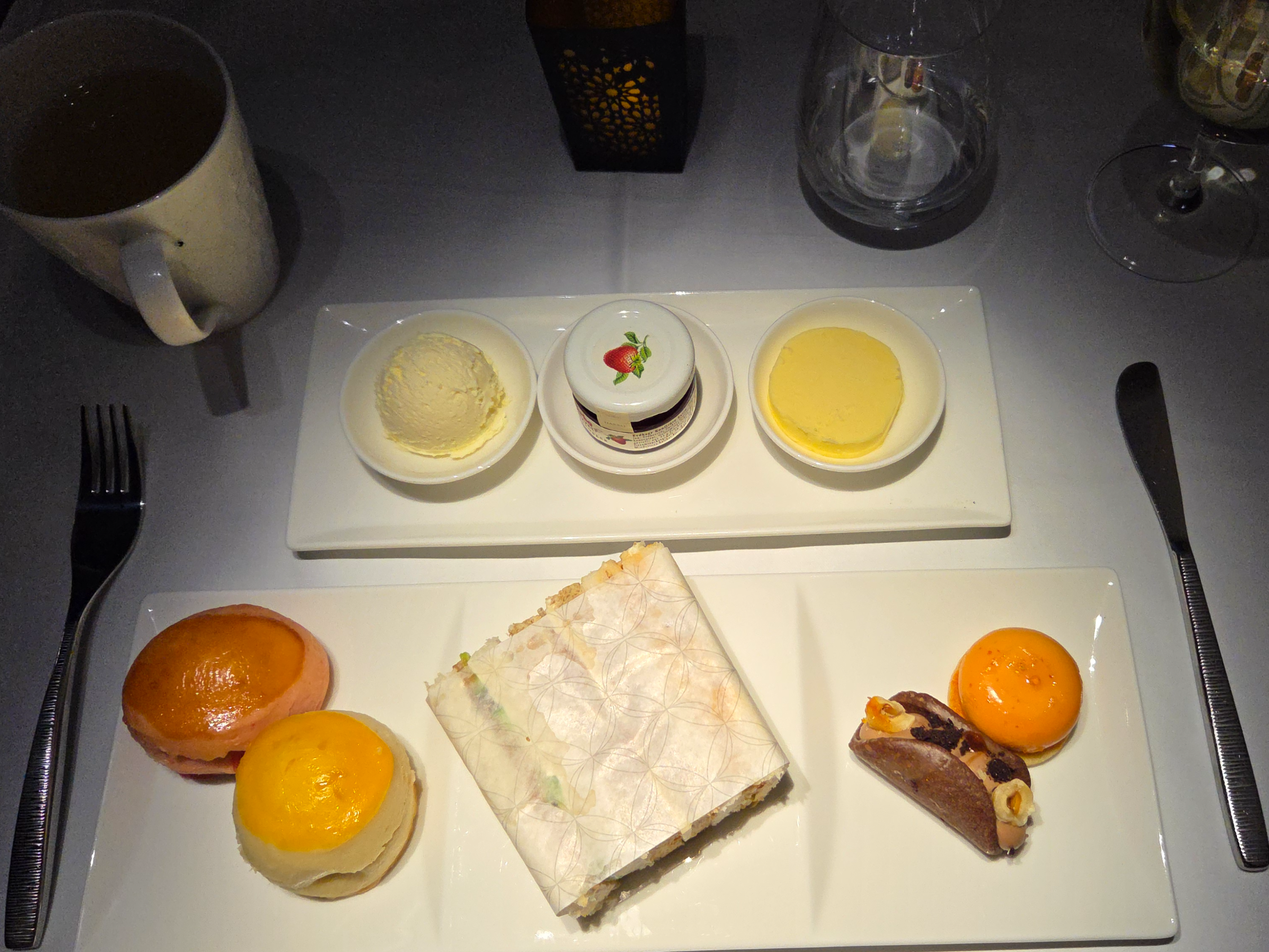 카타르 항공 장거리 비즈니스 클래스 간식 에프터눈 티 스콘, 초콜릿 무스 빵, 샌드위치 에프터눈티의 경우 으리으리한 트레이에 나오지는 않았지만, 스콘과 스위트한 빵과 짭짤한 샌드위치가 함께 나왔습니다. 비행기에서 먹는 스콘 치고는 버터와 휘핑크림, 잼과 곁들여 먹기에 스콘은 아주 맛있었고, 오렌지 무스가 올라간 빵과 초콜릿 바이트도 좋았습니다. 샌드위치의 경우 안에 연어, 토마토, 치즈, 야채 등이 골고루 과하지 않게 들어가 있었습니다. 비행 중 향긋한 티와 곁들이기 너무 좋은 에프터눈티였습니다.