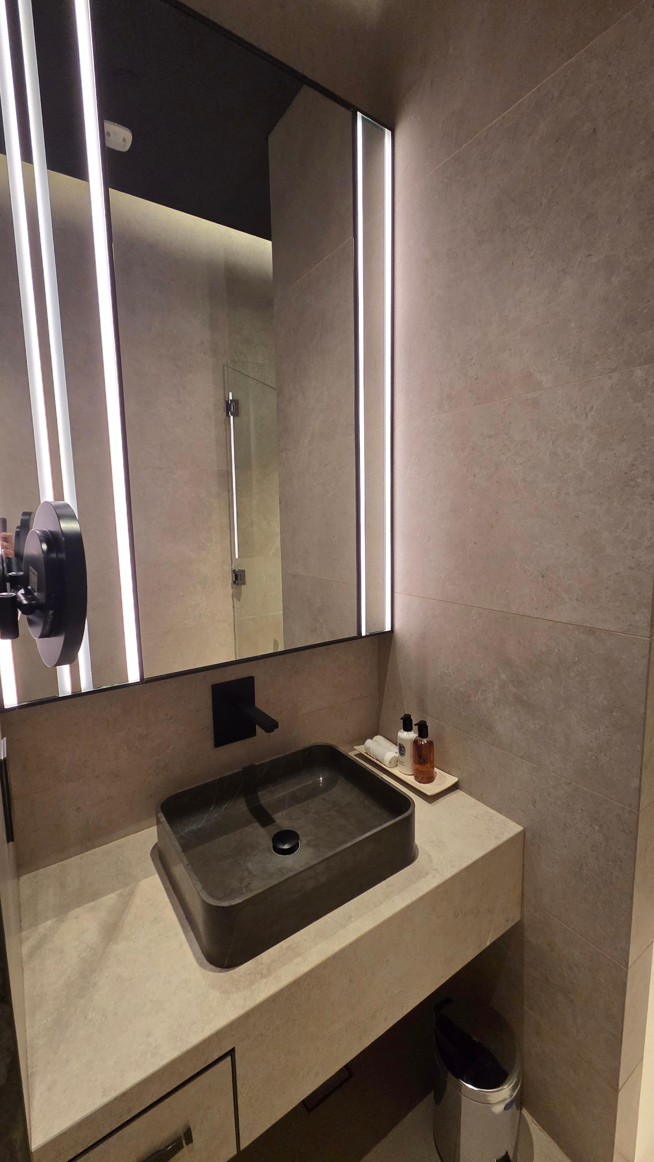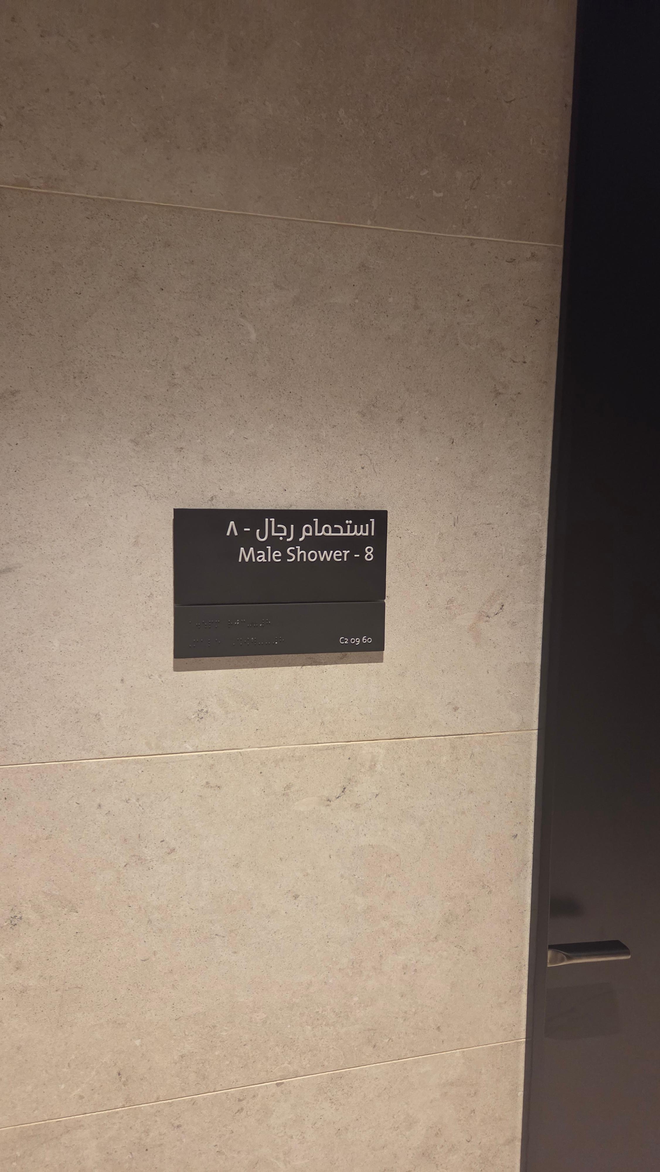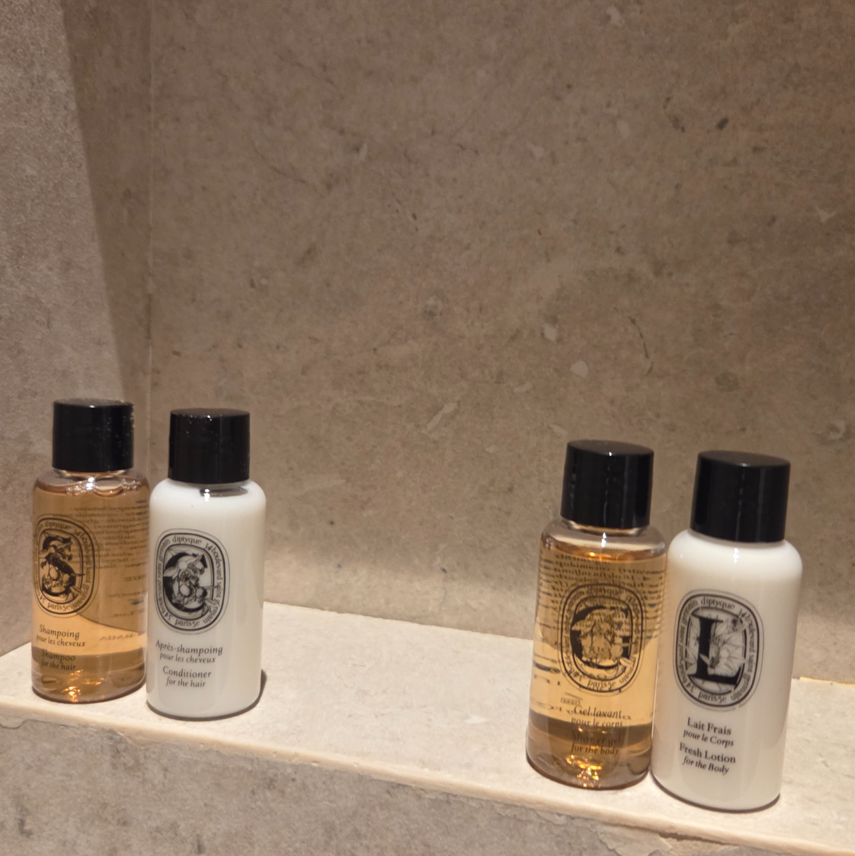 저는 알 무르잔 비즈니스 라운지 더 가든에 도착해 가장 먼저 샤워를 했습니다. 샤워는 좌측에 위치한 공간의 중앙부에 있으며 데스크에서 번호표를 받고 해당 번호에 맞는 샤워 스위트로 입장하는 방식입니다. 각각의 샤워 스위트는 캐리온 캐리어를 놓을만한 작은 선반, 세면대, 샤워 부스로 이루어져 있으며, 역시나 어매니티는 딥티크 제품이 제공되었습니다. 변기가 없다는 점이 약간 아쉽긴 했으나 더 아쉬웠던 점은 바로 수압이었는데요, 천장에서 떨어지는 형태의 샤워기는 괜찮았으나 샤워기의 수압이 너무 부족해서 샤워기로 씻기에는 쉽지 않은 부분이 있었습니다. 또한 공간이 아주 좁은 편이고, 헤어 드라이기 또한 아쉬운 부분이었습니다.
